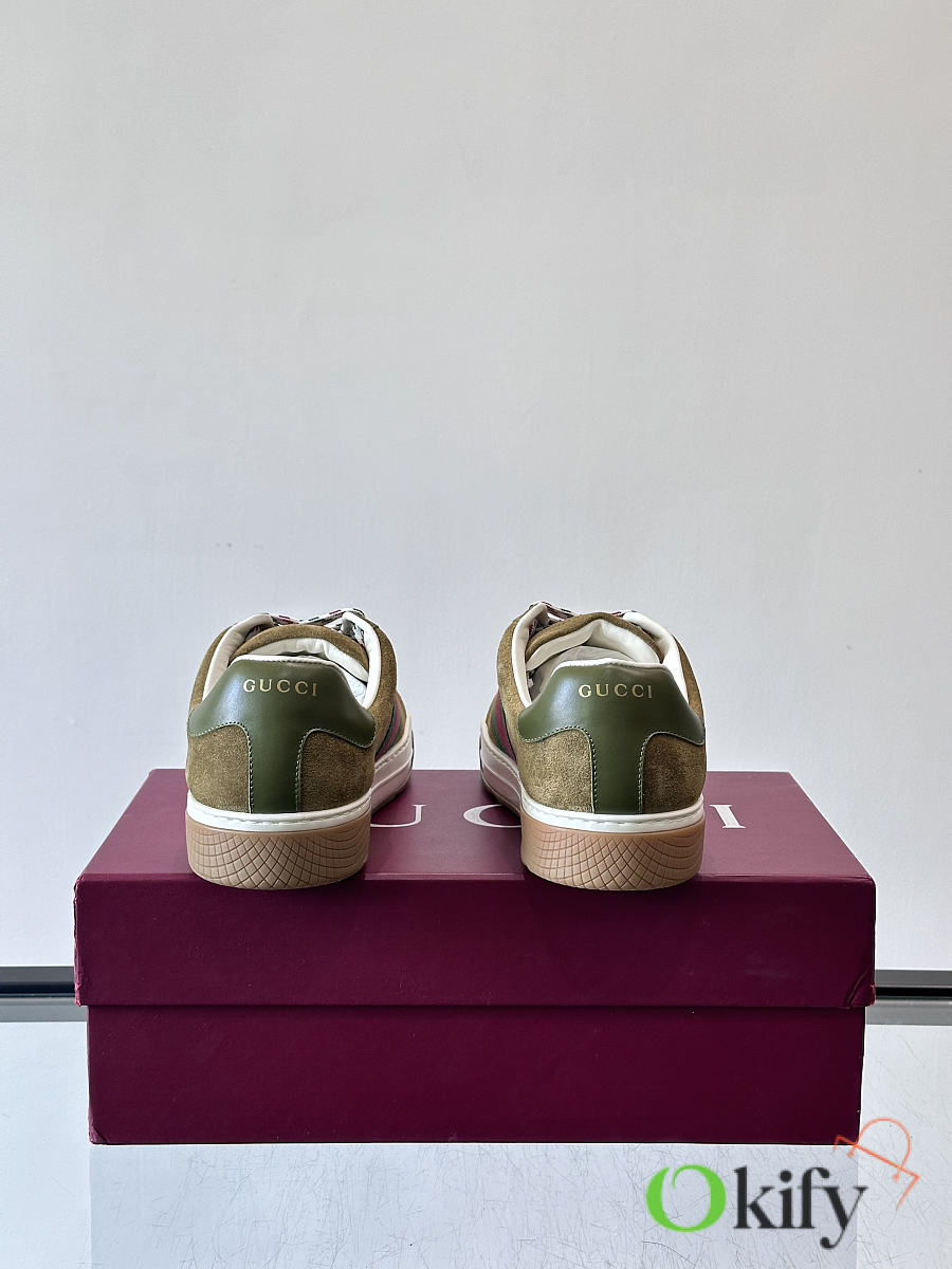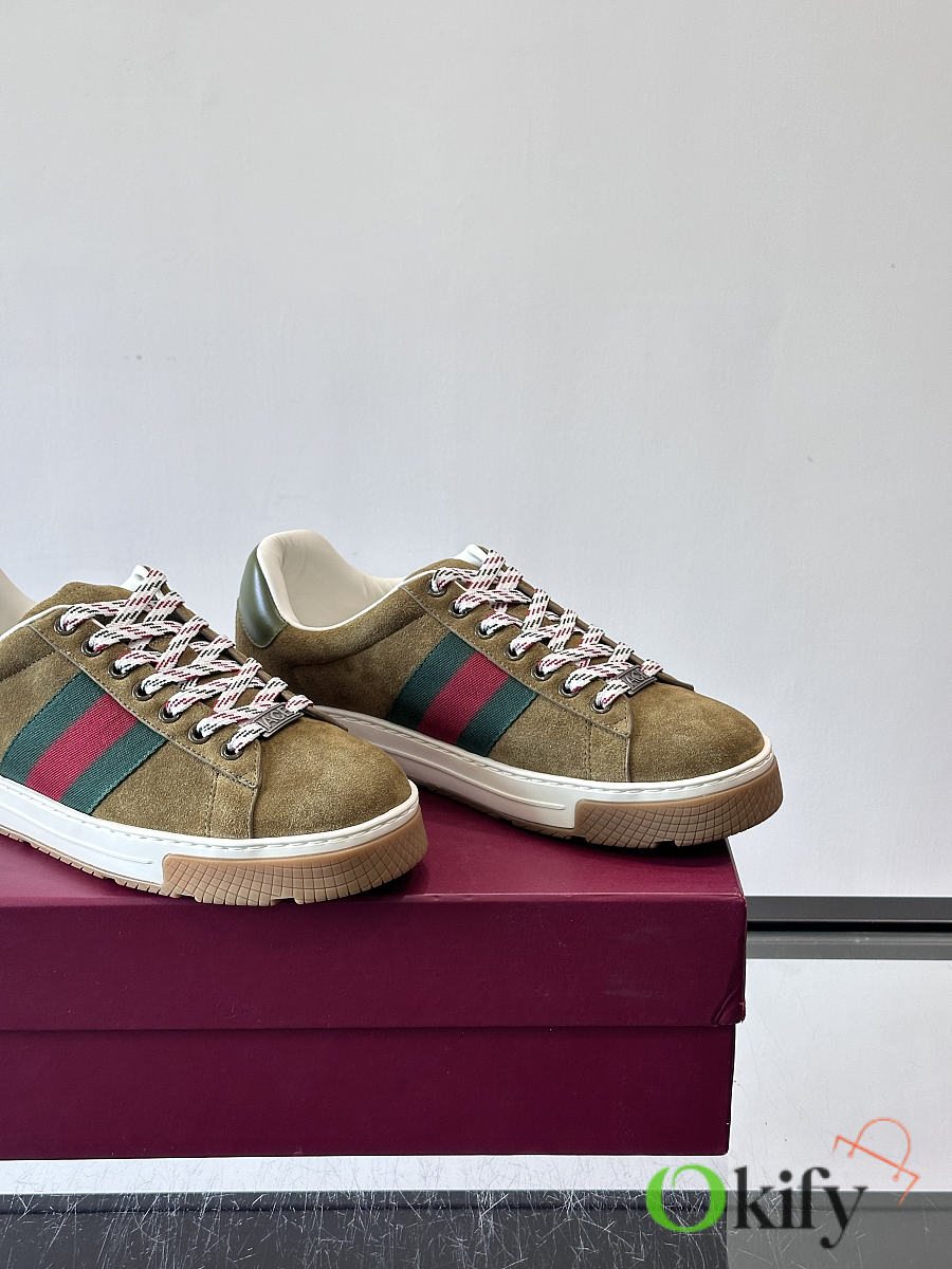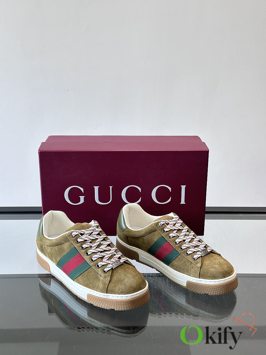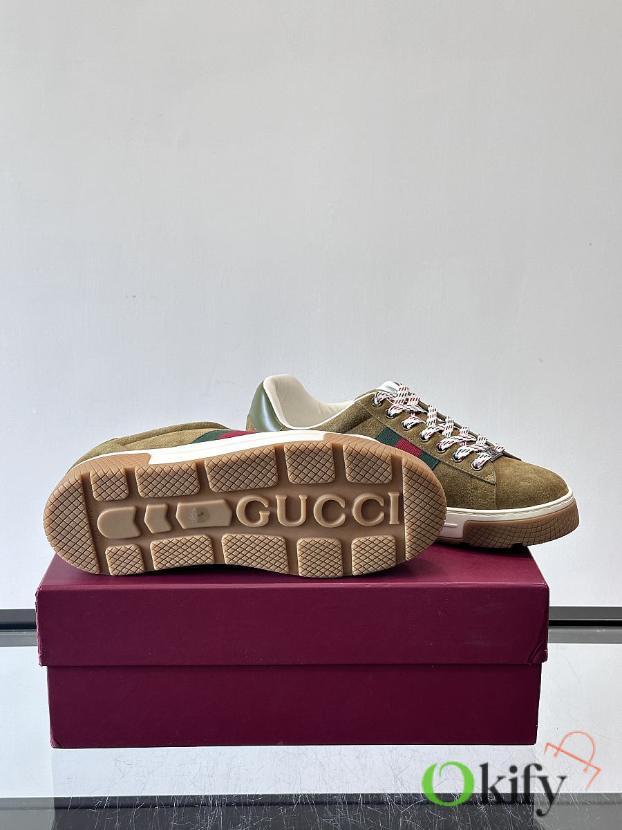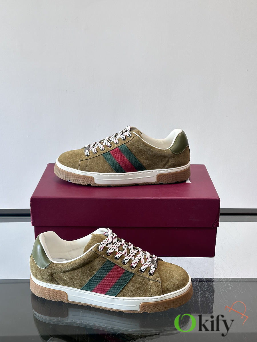 These classic Gucci retro sneakers feature a suede upper with the brand's signature red and green webbing, red and white checkered laces, and a rubber sole with a non-slip tread. The overall style is retro yet sophisticated. Belonging to Gucci's "Old School" collection, they are one of the most sought-after "dad shoe" styles in recent years, combining comfort and fashion, suitable for various outfits. Size: 39-44