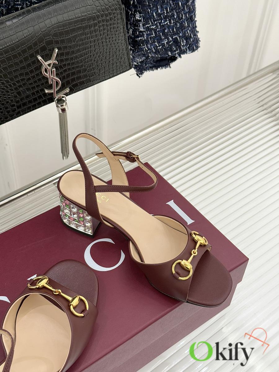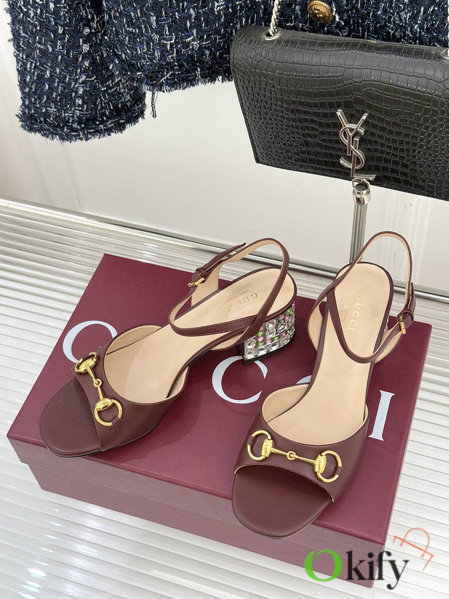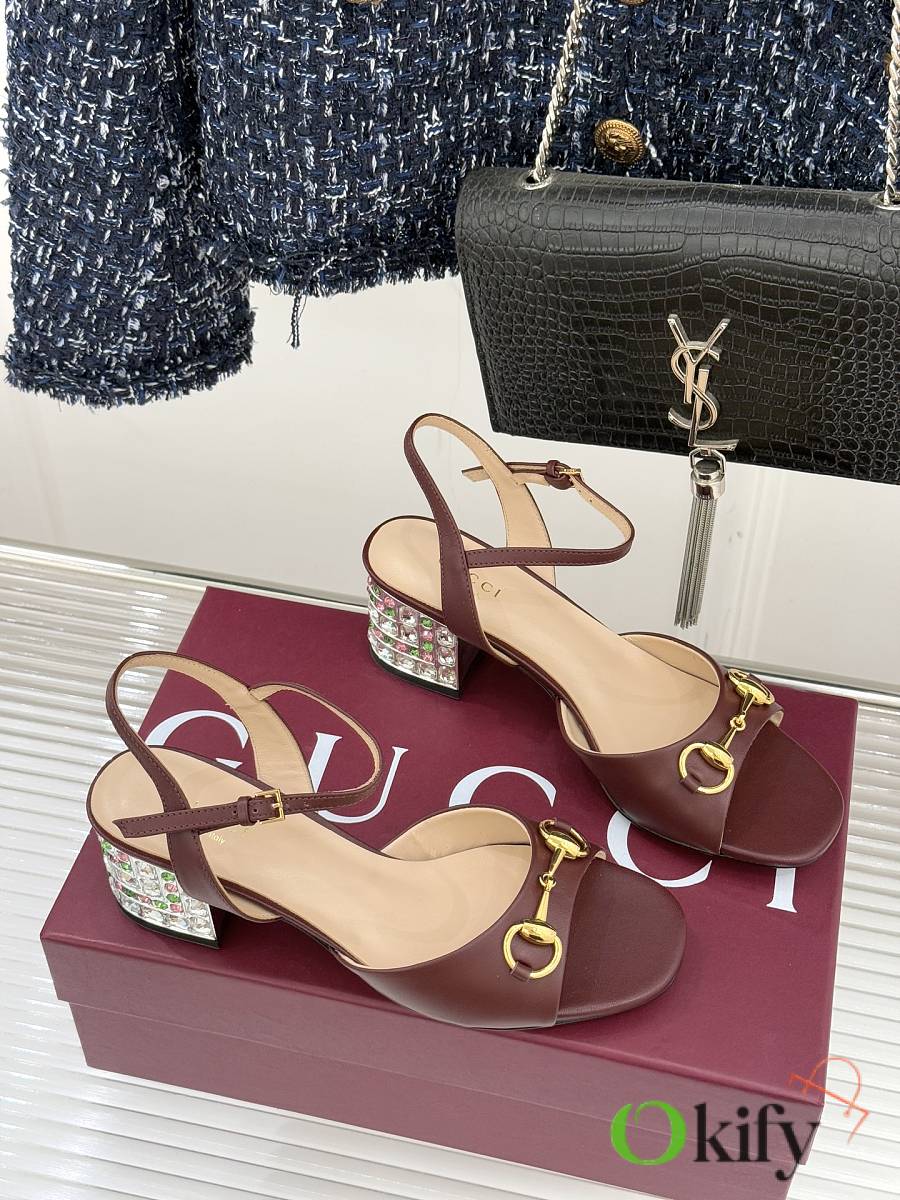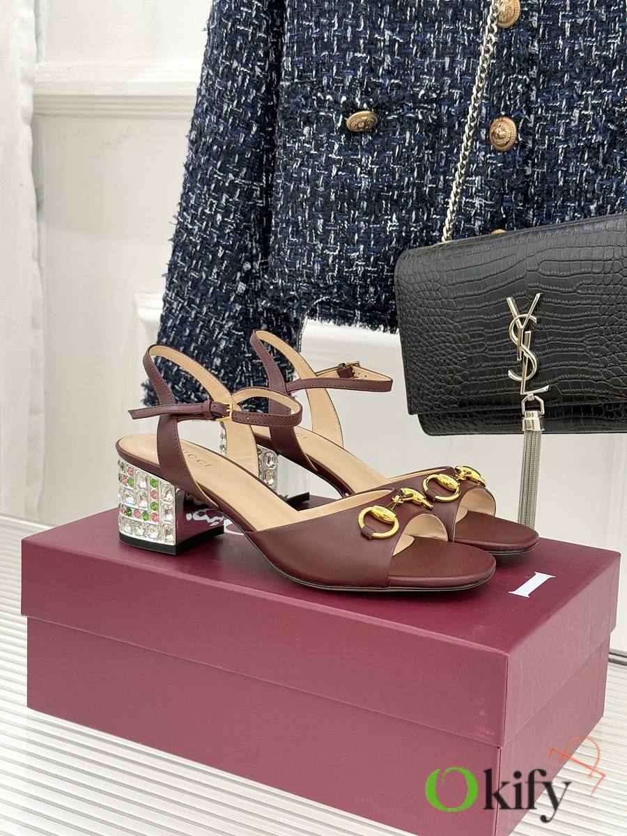 Okify Gucci Dark Brown Horsbit Crystal Block Heel Sandals 5.5cm