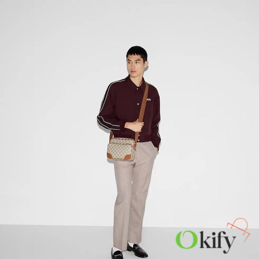 The new GG Emblem men's travel collection redefines the brand's timeless elegance and exquisite craftsmanship. Brown leather piping. Cotton lining. Interior: 1 zip pocket; Exterior: 1 front zip pocket and 1 D-ring. Canvas shoulder strap: 56cm high; adjustable length from 83cm to 142cm. Dimensions: 23.5x18x8cm