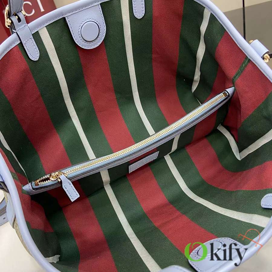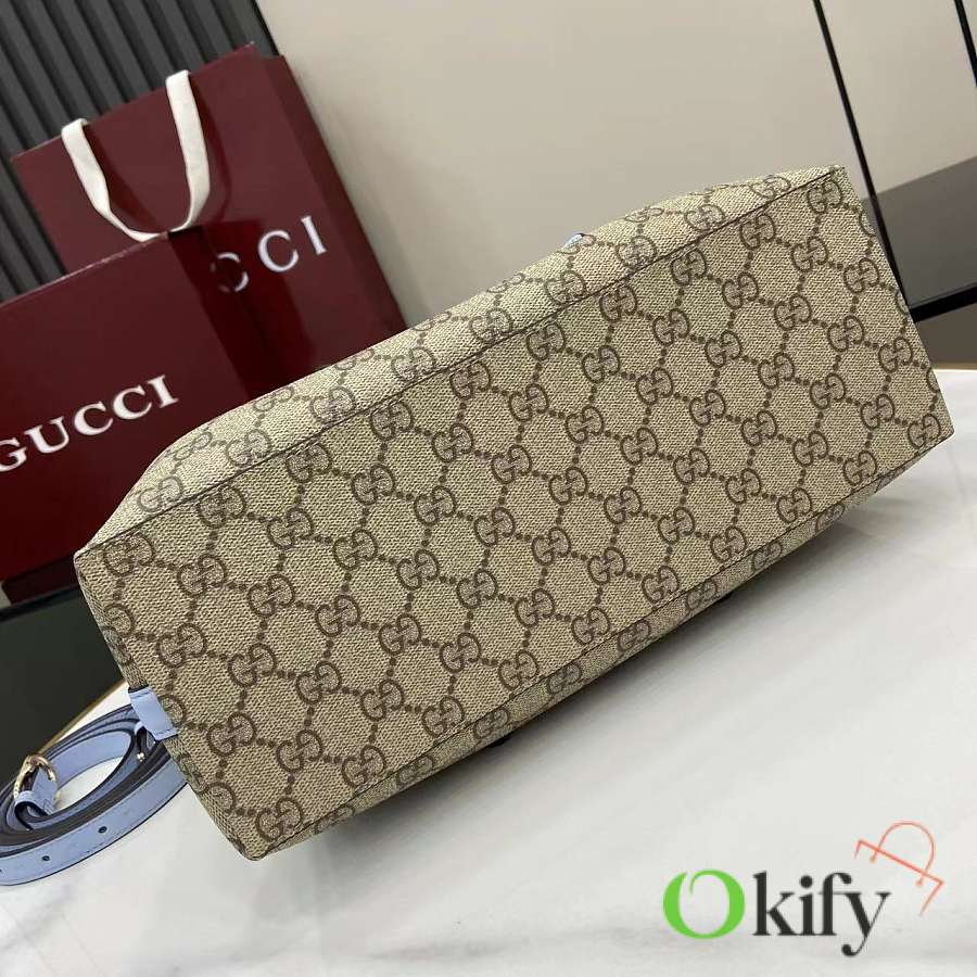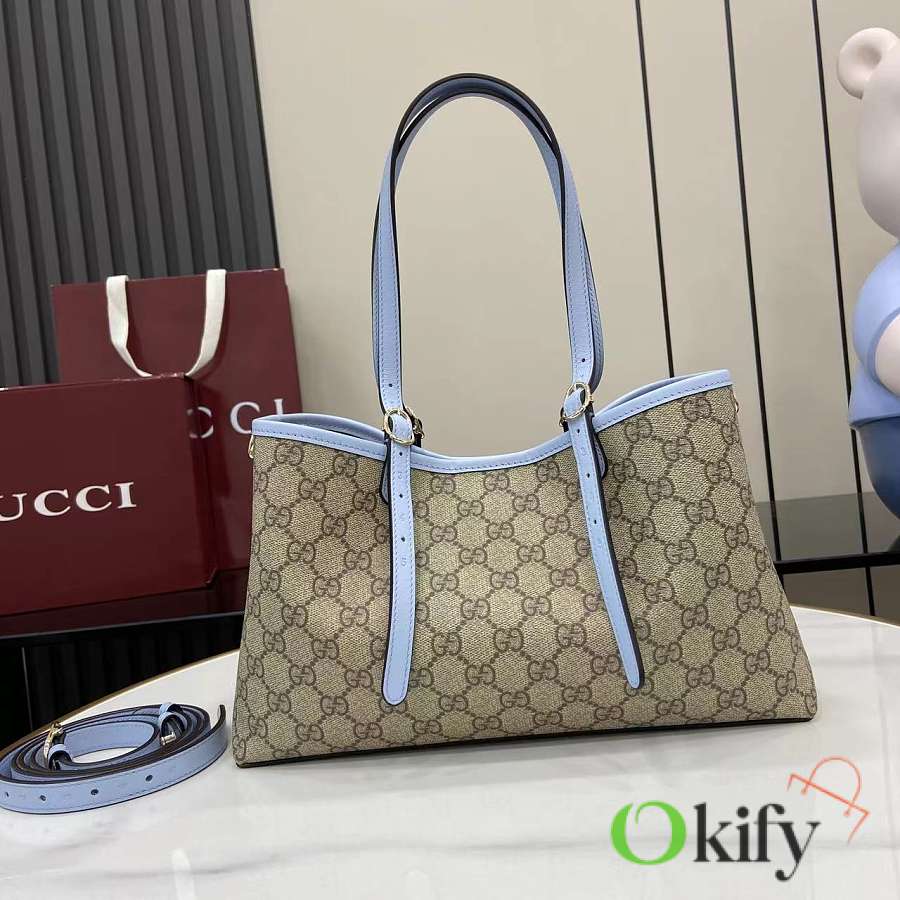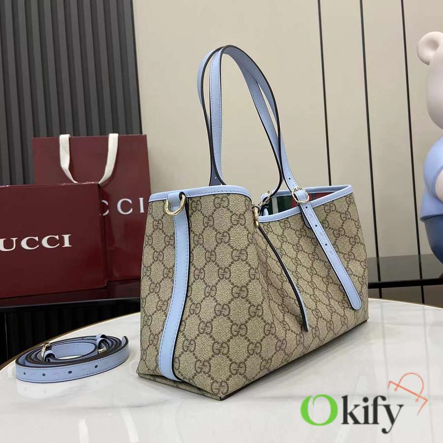 New beige and light blue GG logo pattern coated fabric Light blue leather piping with contrasting stitching Also includes D-rings for attaching detachable items. Adjustable handle with decorative dial indicator; height 18 cm - 28 cm Interior: 2 compartments and 1 central zippered compartment Adjustable leather shoulder strap (height 51.5 cm - 57 cm); length adjustable between 104 cm and 114 cm. Magnetic snap closure Model number: 815214. Dimensions: 30 cm (width) x 18 cm (height) x 11 cm (depth) Color: Light brown/light blue PVC/original leather. Weight: Approximately 0.8 kg