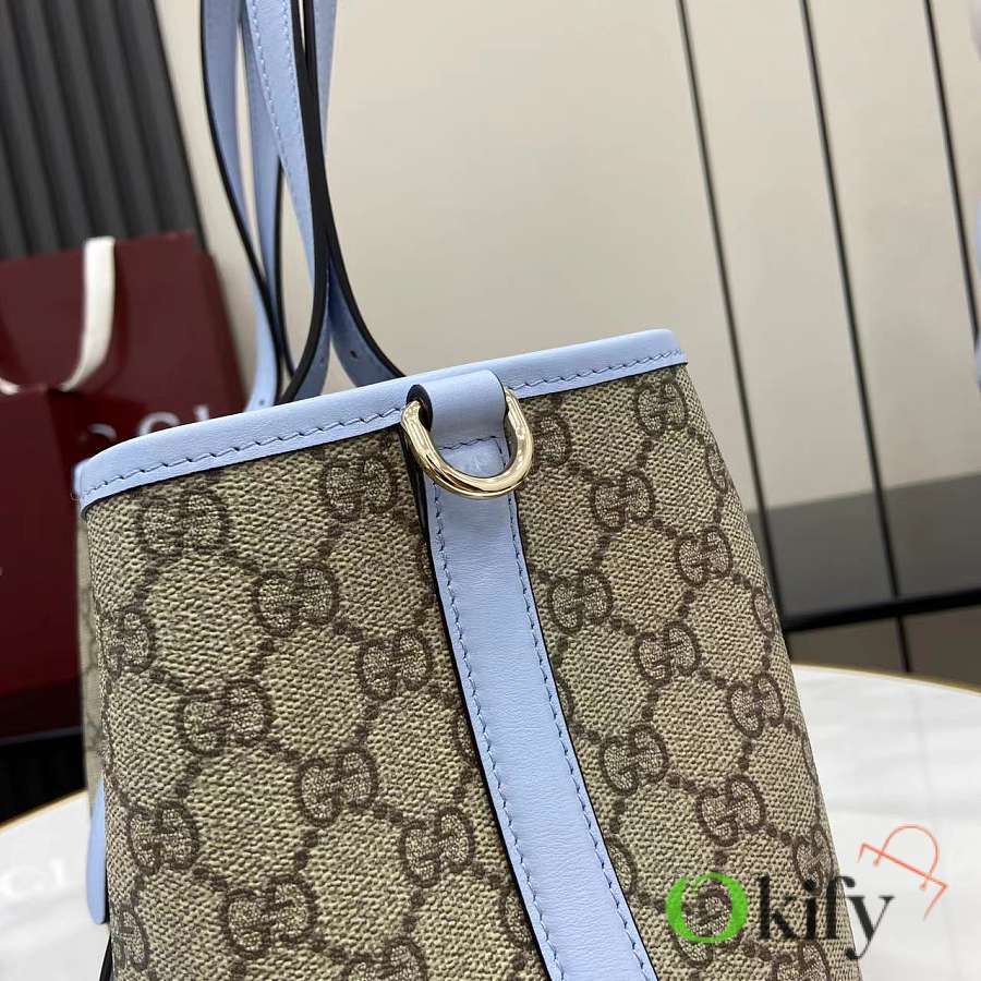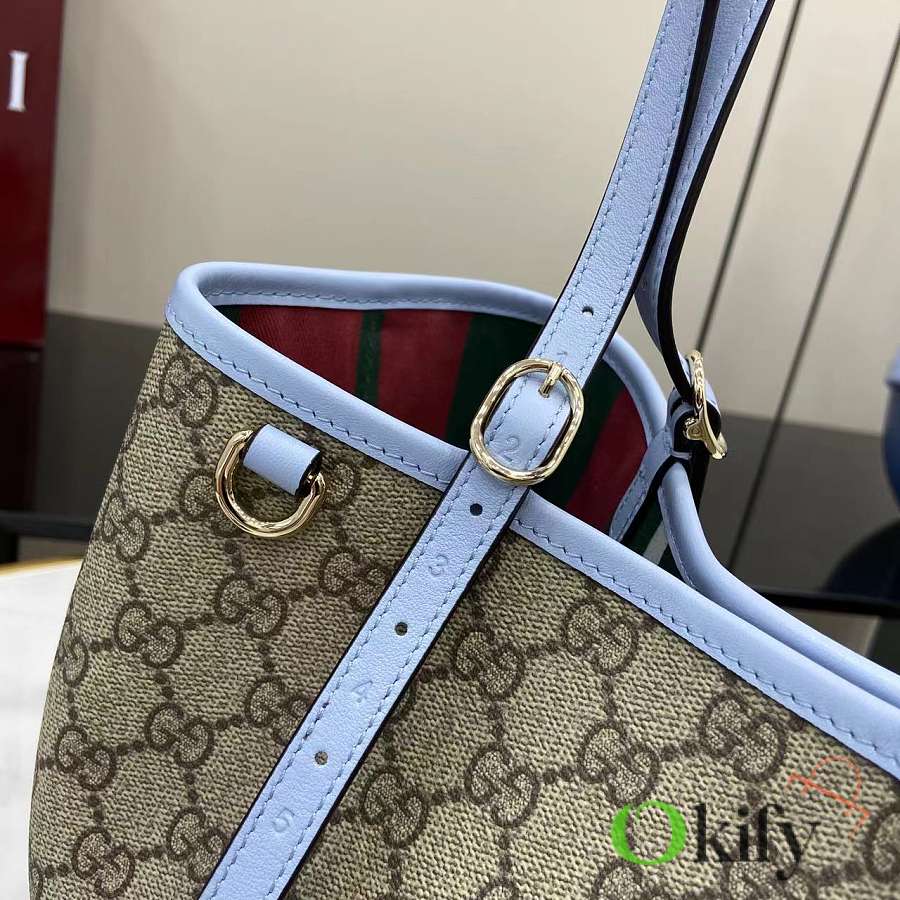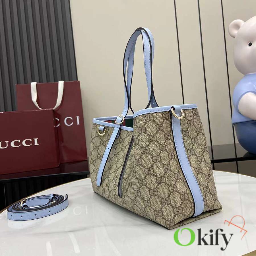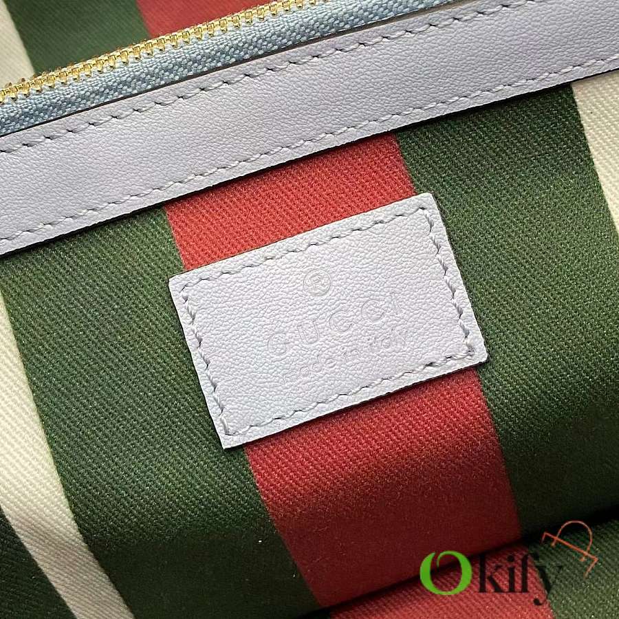 New beige and light blue GG logo pattern coated fabric Light blue leather piping with contrasting stitching Also includes D-rings for attaching detachable items. Adjustable handle with decorative dial indicator; height 18 cm - 28 cm Interior: 2 compartments and 1 central zippered compartment Adjustable leather shoulder strap (height 51.5 cm - 57 cm); length adjustable between 104 cm and 114 cm. Magnetic snap closure Model number: 815214. Dimensions: 30 cm (width) x 18 cm (height) x 11 cm (depth) Color: Light brown/light blue PVC/original leather. Weight: Approximately 0.8 kg