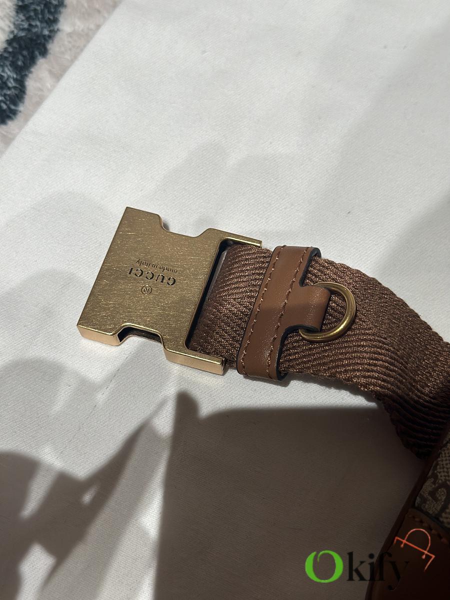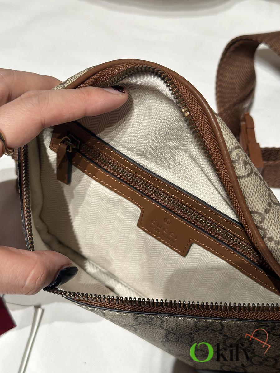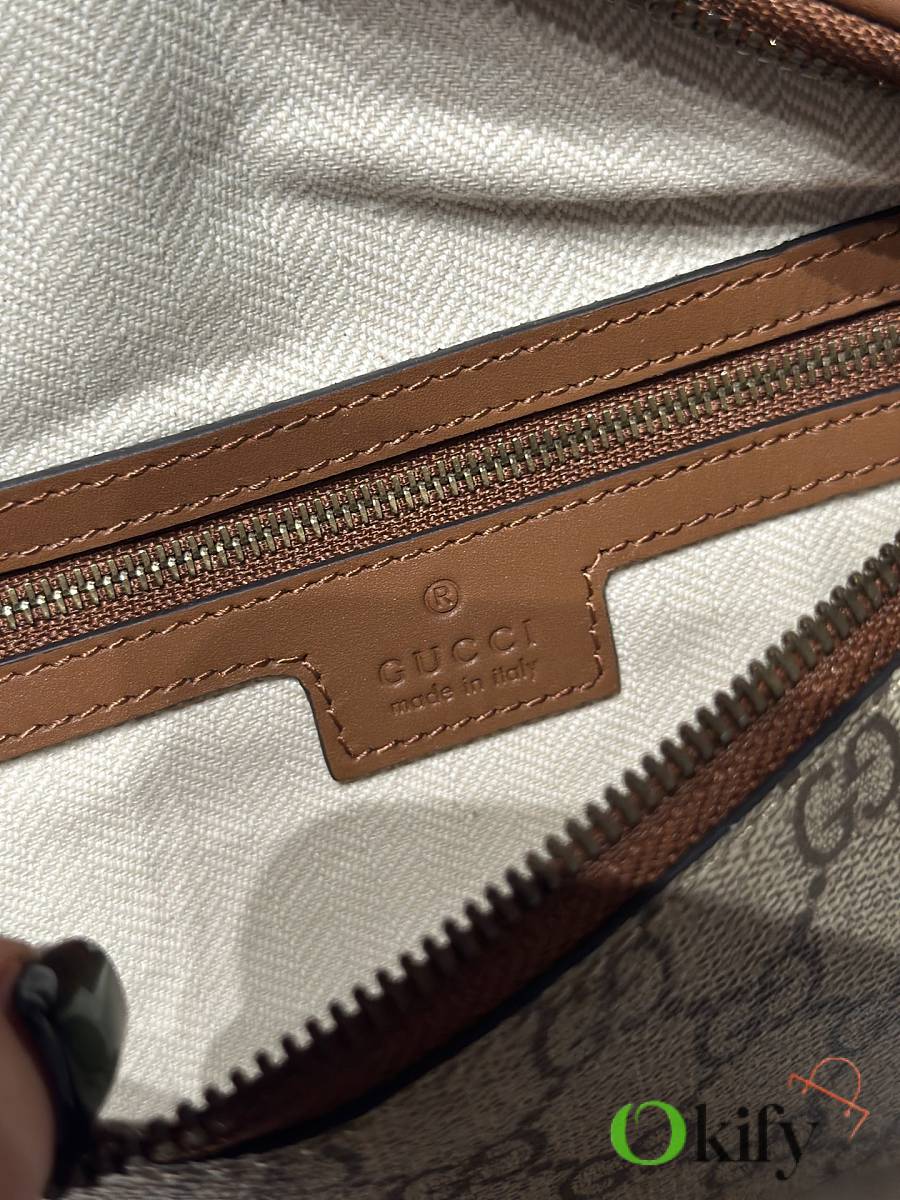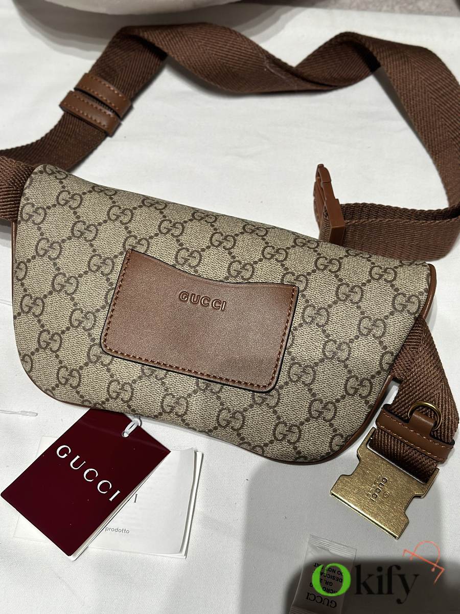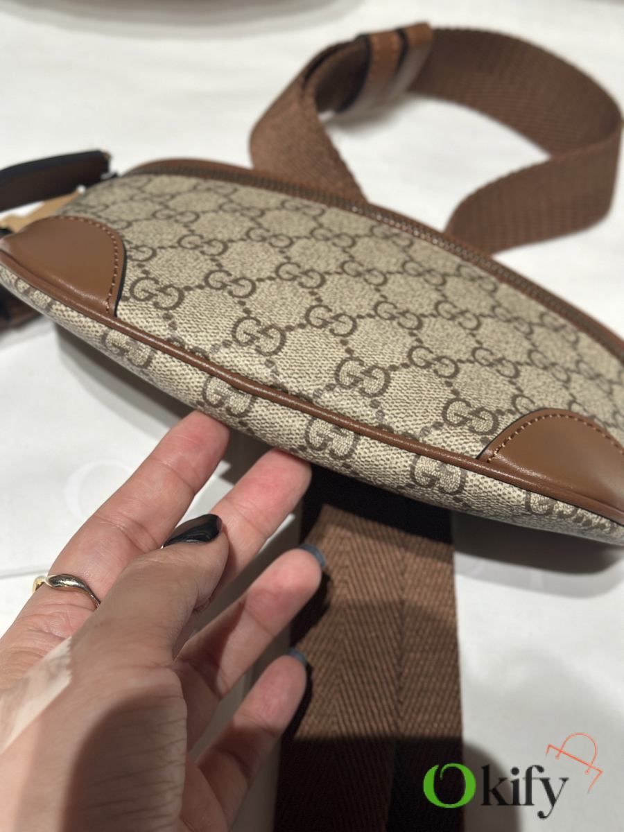 The new GG Emblem men's travel collection redefines the brand's timeless elegance and exquisite craftsmanship. This waist bag is crafted from new beige and dark brown GG monogram coated fabric, featuring an open pocket and an external D-ring for attaching accessories. New beige and dark brown GG logo pattern coated fabric Brown leather piping cotton lining Exterior: 1 leather open pocket and 1 D-ring Adjustable canvas shoulder strap with snaps; adjustable between 90 cm and 135 cm. Zipper opening and closing Model number: 821162. Dimensions: 28 cm (width) x 17 cm (height) x 6 cm (depth) Weight: Approximately 0.4 kg