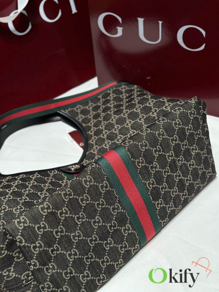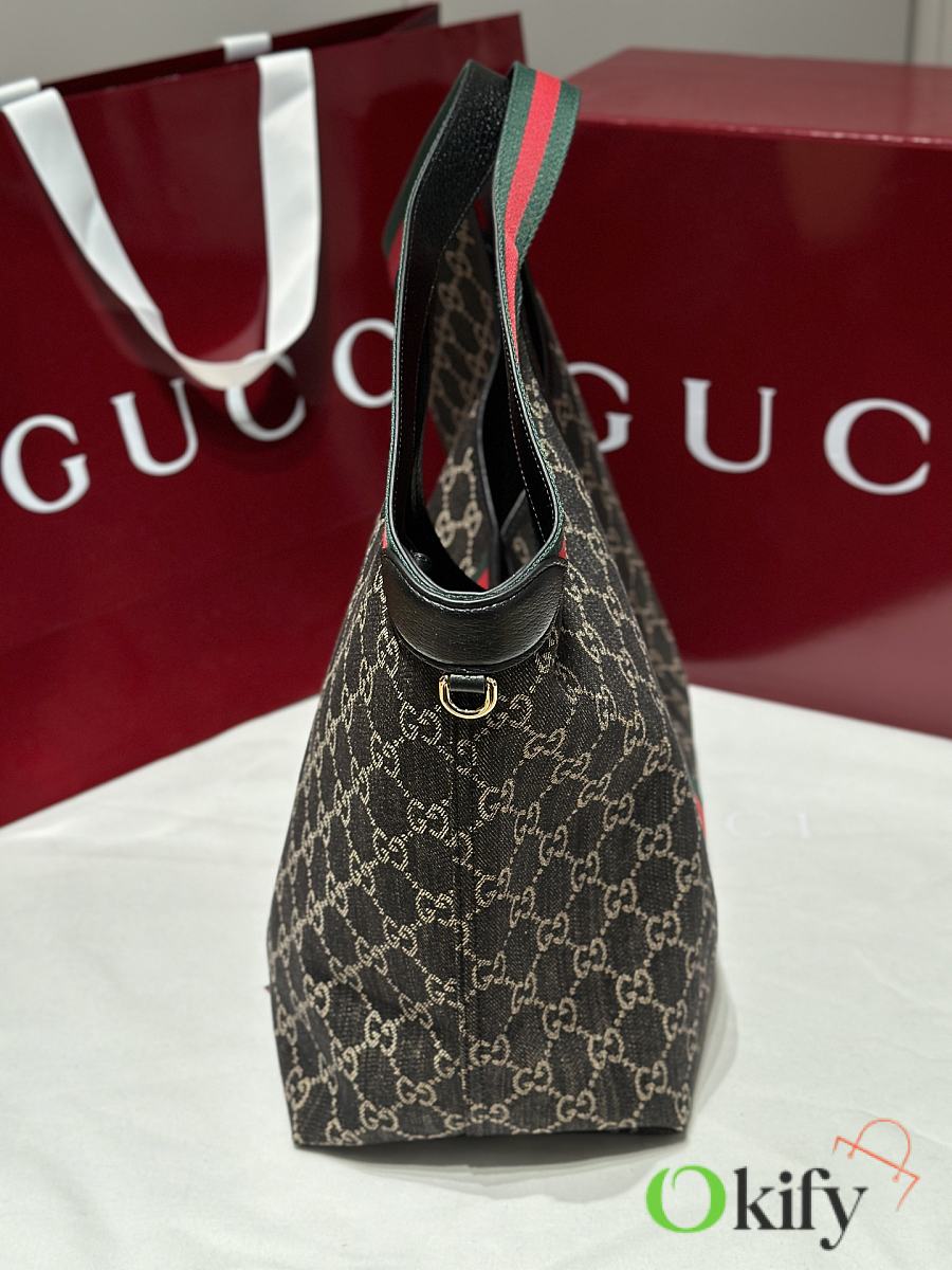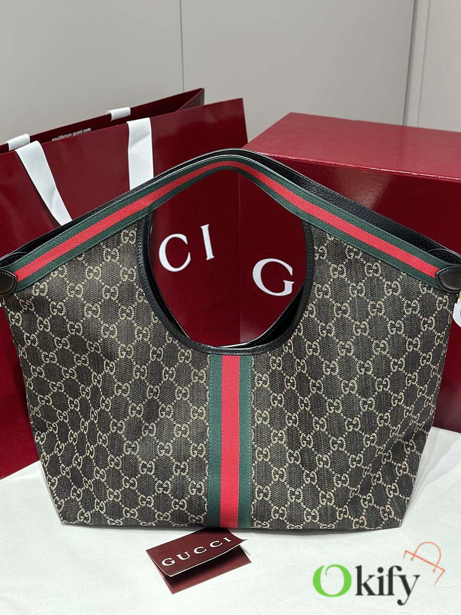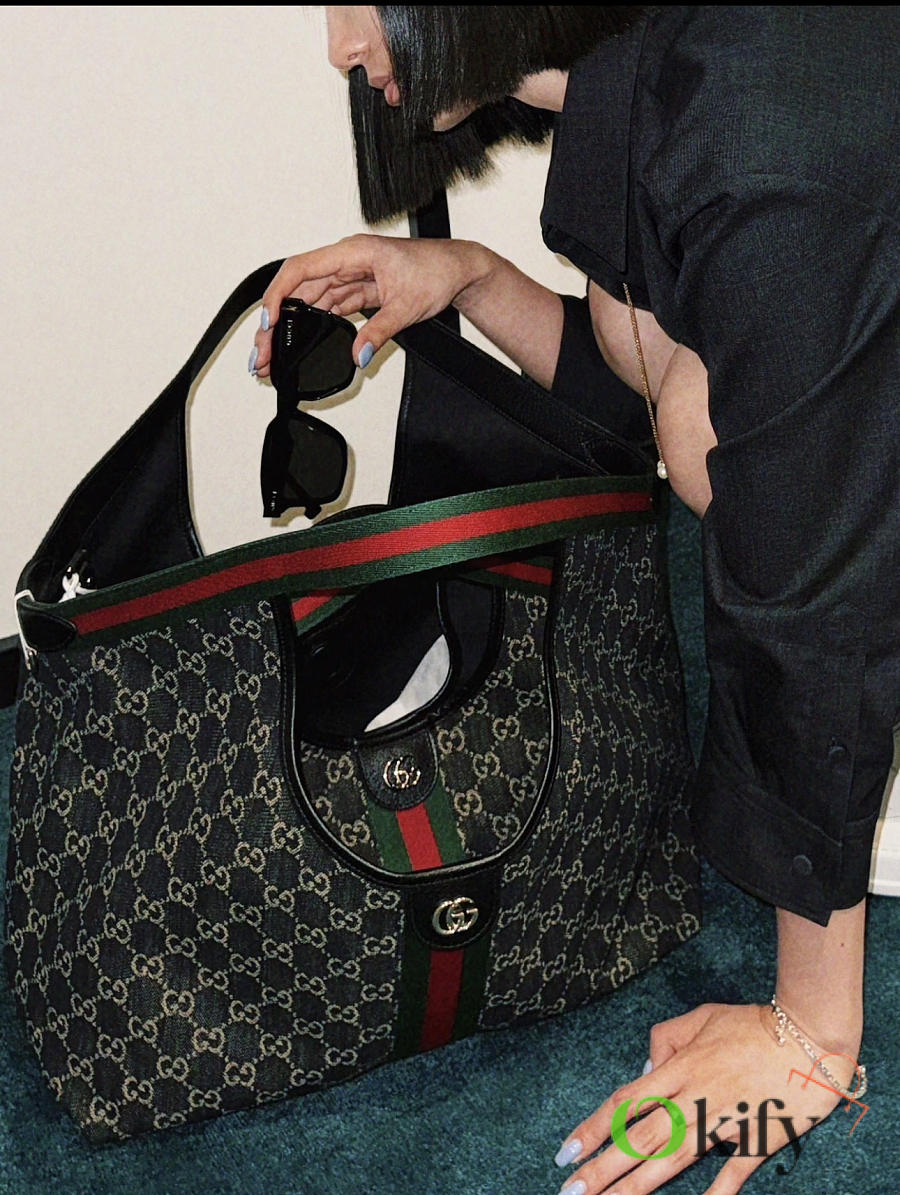The Gucci Giglio collection made its debut at the Florence 2026 Cruise Fashion Show, paying homage to the brand's Italian roots and blending timeless heritage with innovative spirit. This large-capacity tote bag is crafted from GG denim, adorned with webbing trim, and comes with a detachable clutch. Available in blue and white GG denim. Features blue and red webbing trim. Light gold accessories Brown cotton lining Double G Comes with a detachable clutch bag Top handle: 18 cm high Magnetic snap closure
