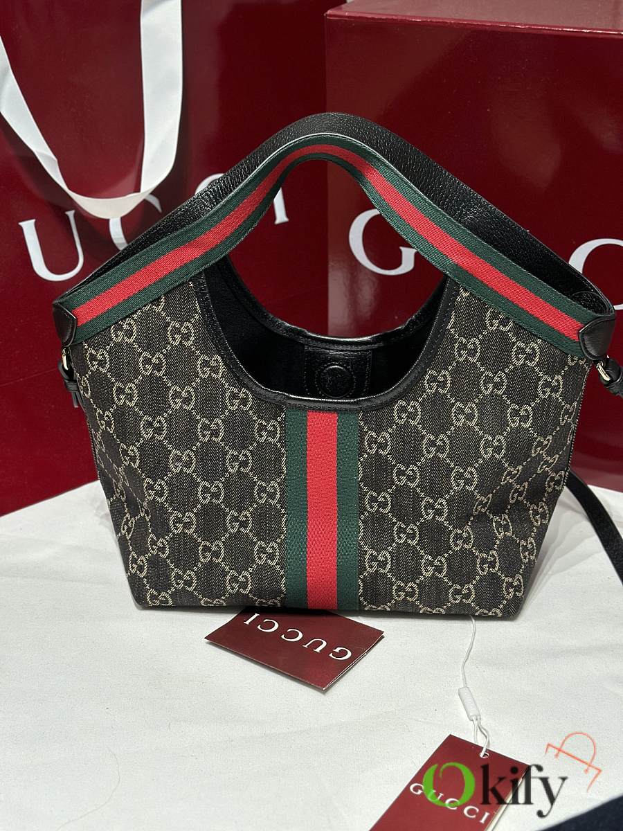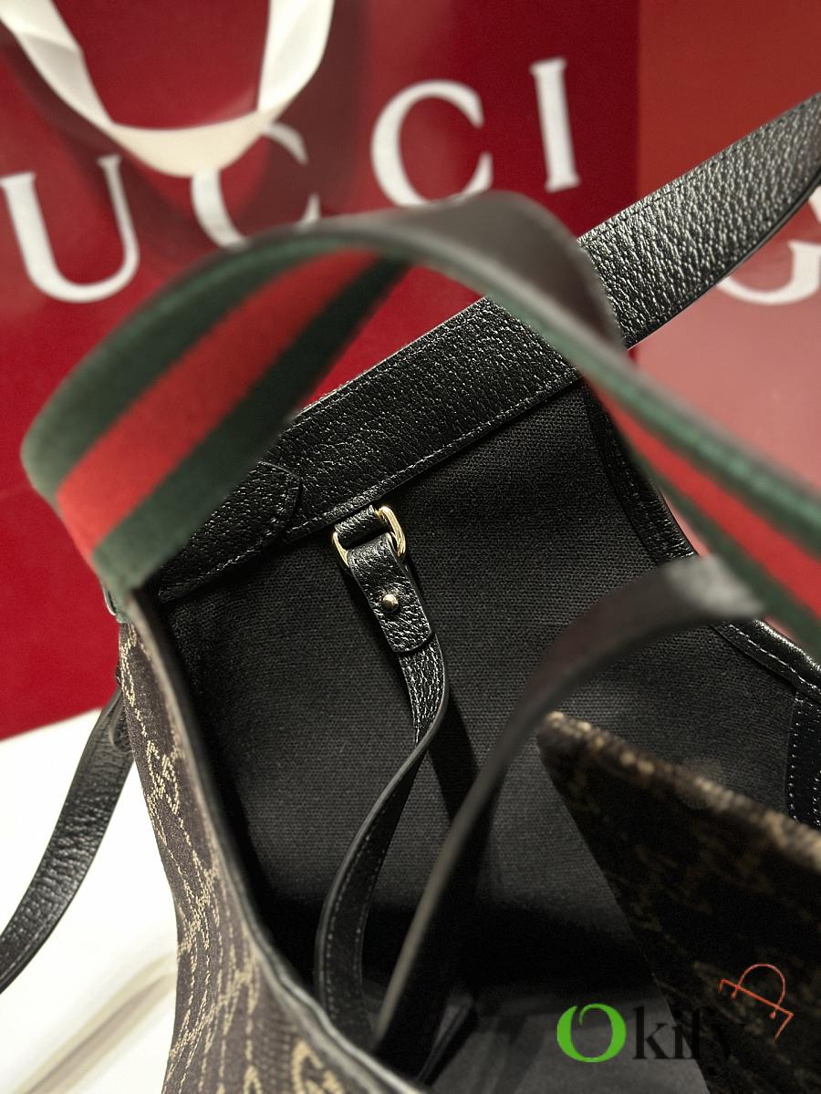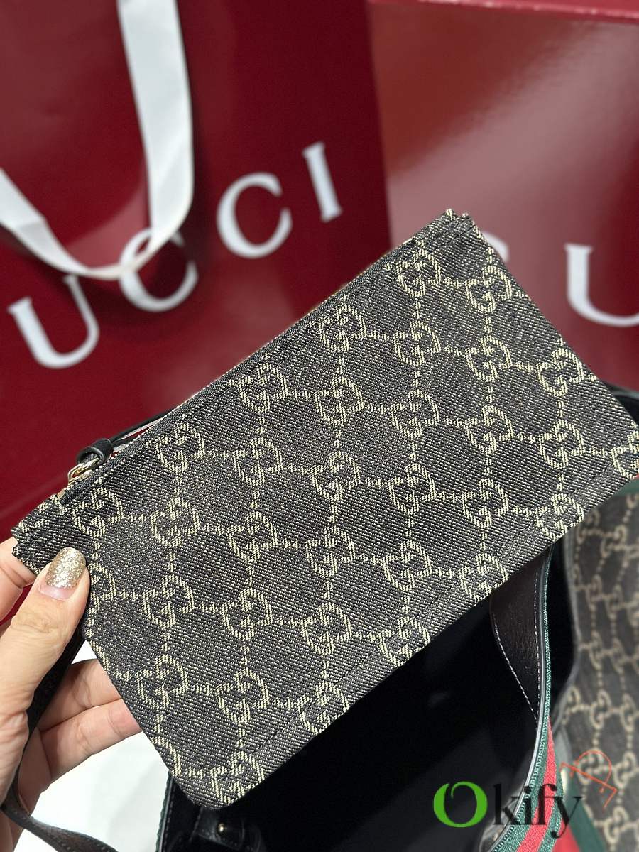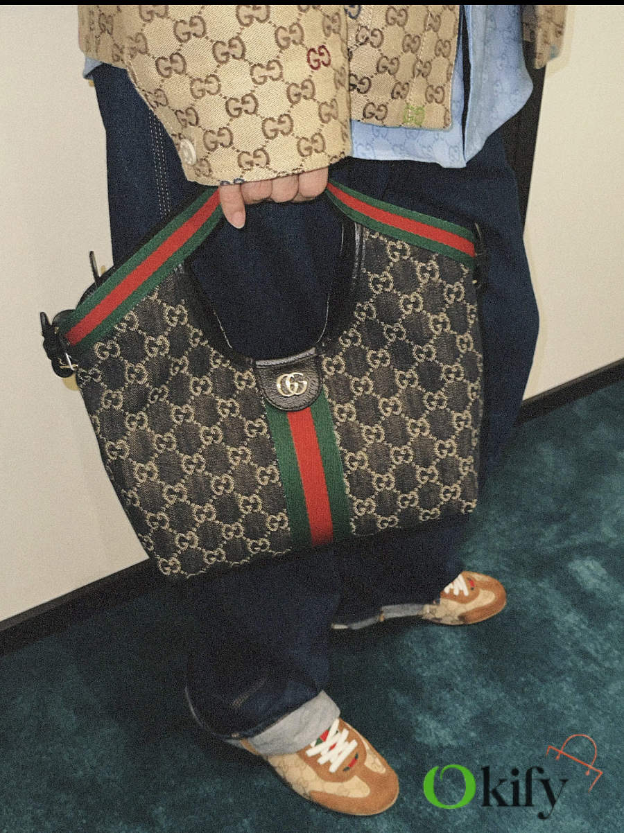 The GG series introduces a smaller version. This tote bag was showcased at the brand's 2026 Cruise Collection fashion show in Florence, paying homage to the brand's Italian roots and highlighting its spirit of heritage and innovation. The spacious design is crafted from GG canvas with webbing trim and includes a detachable clutch for added style. Model 860845 Material: Apricot GG canvas, dark brown leather trim, red and green webbing details,