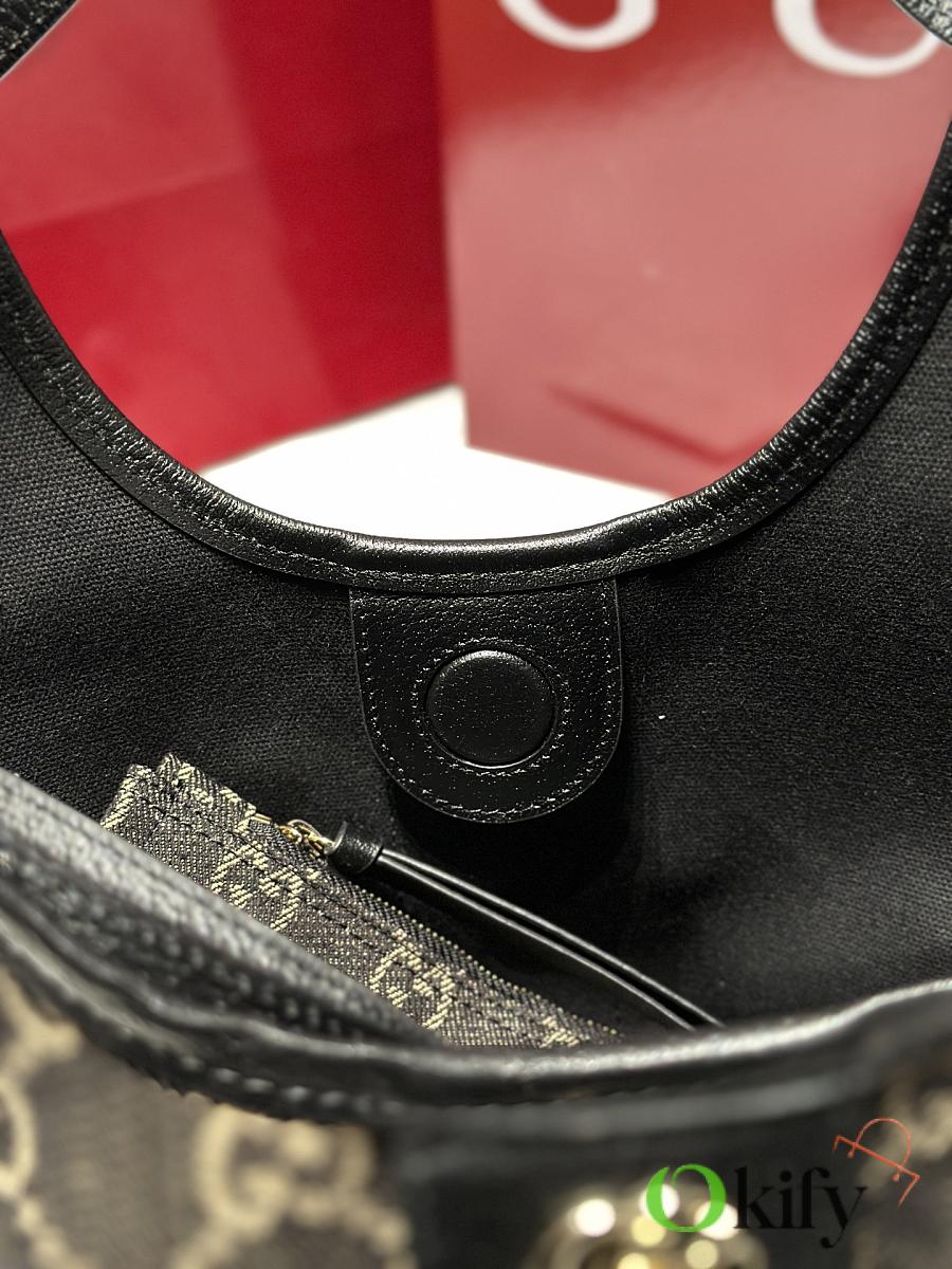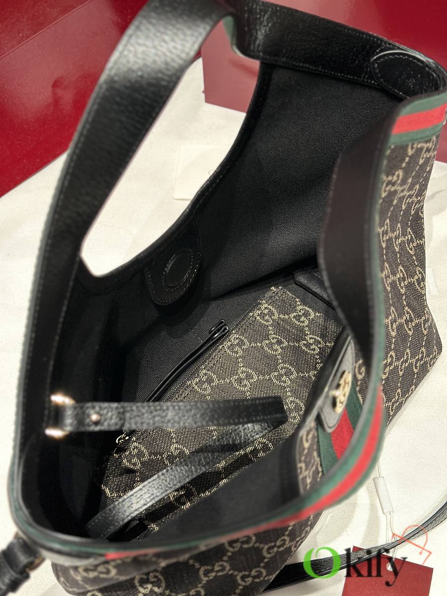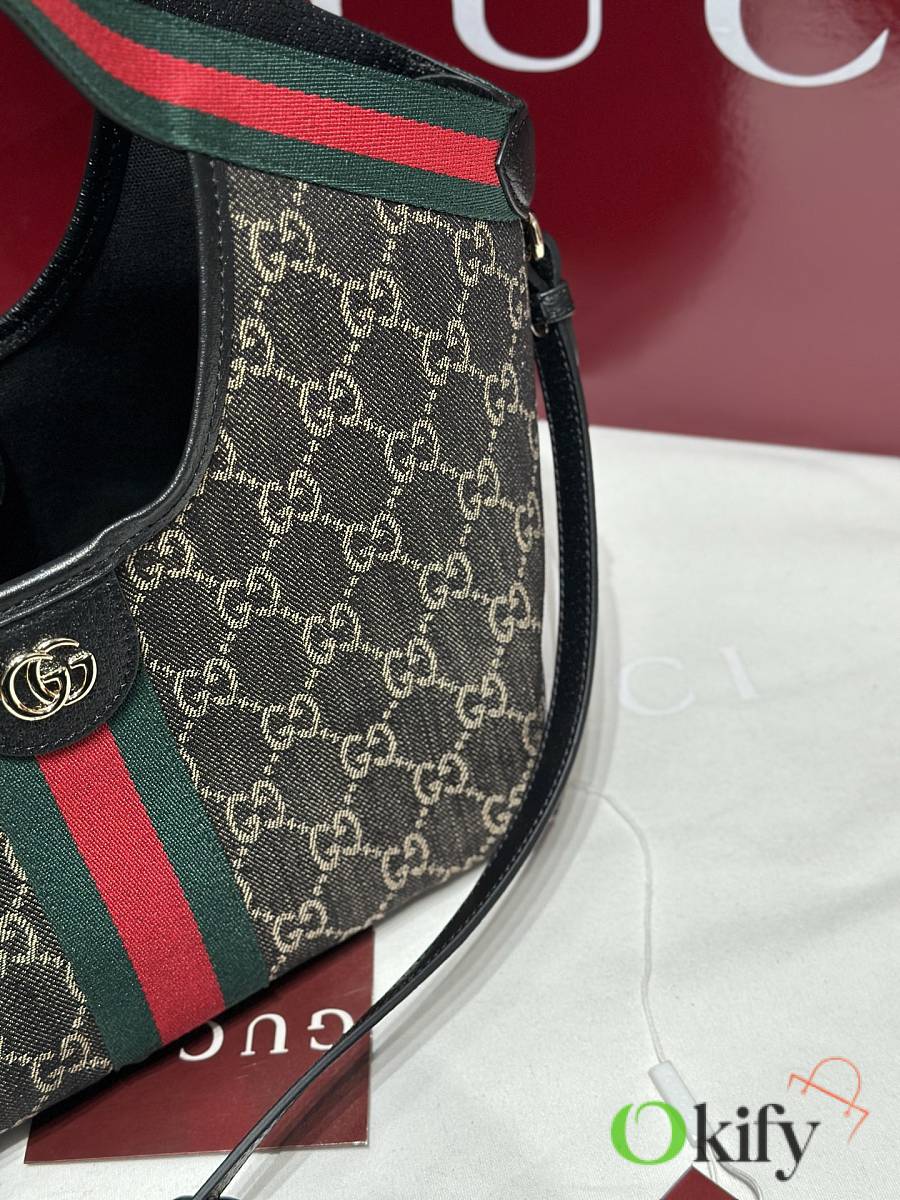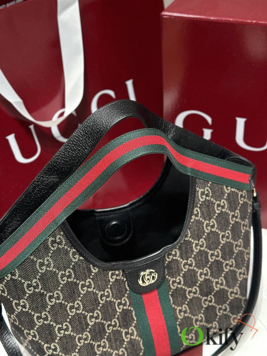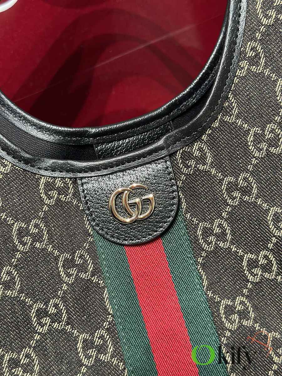 The GG series introduces a smaller version. This tote bag was showcased at the brand's 2026 Cruise Collection fashion show in Florence, paying homage to the brand's Italian roots and highlighting its spirit of heritage and innovation. The spacious design is crafted from GG canvas with webbing trim and includes a detachable clutch for added style. Model 860845 Material: Apricot GG canvas, dark brown leather trim, red and green webbing details,
