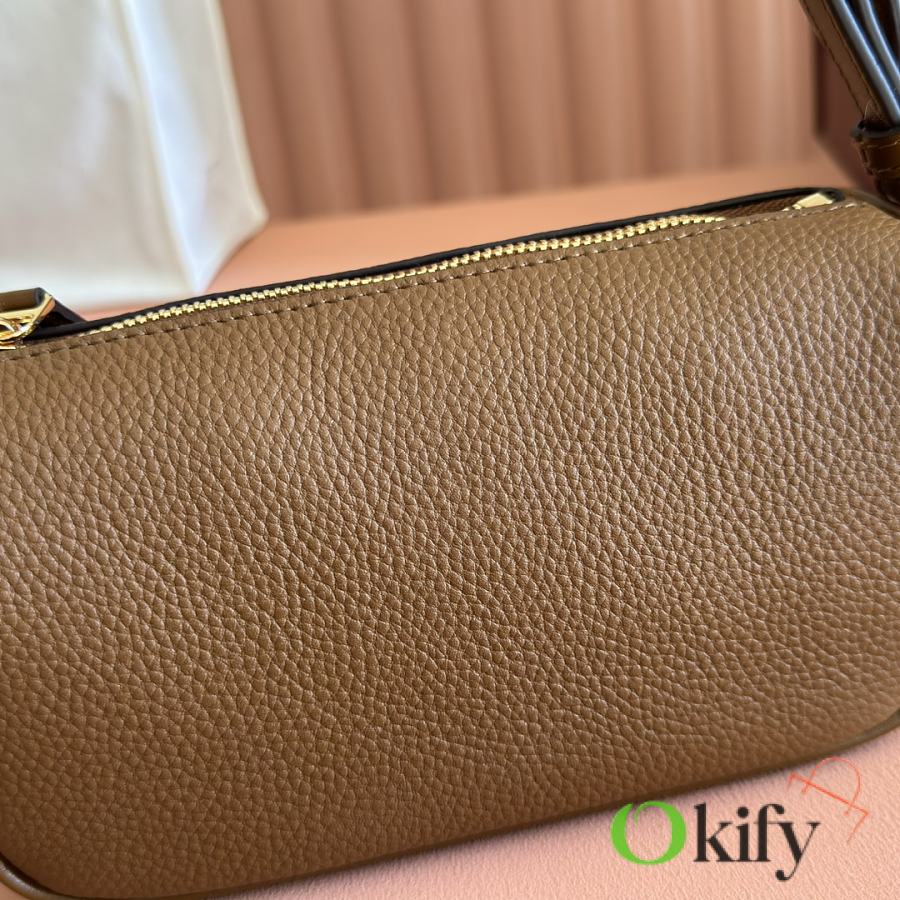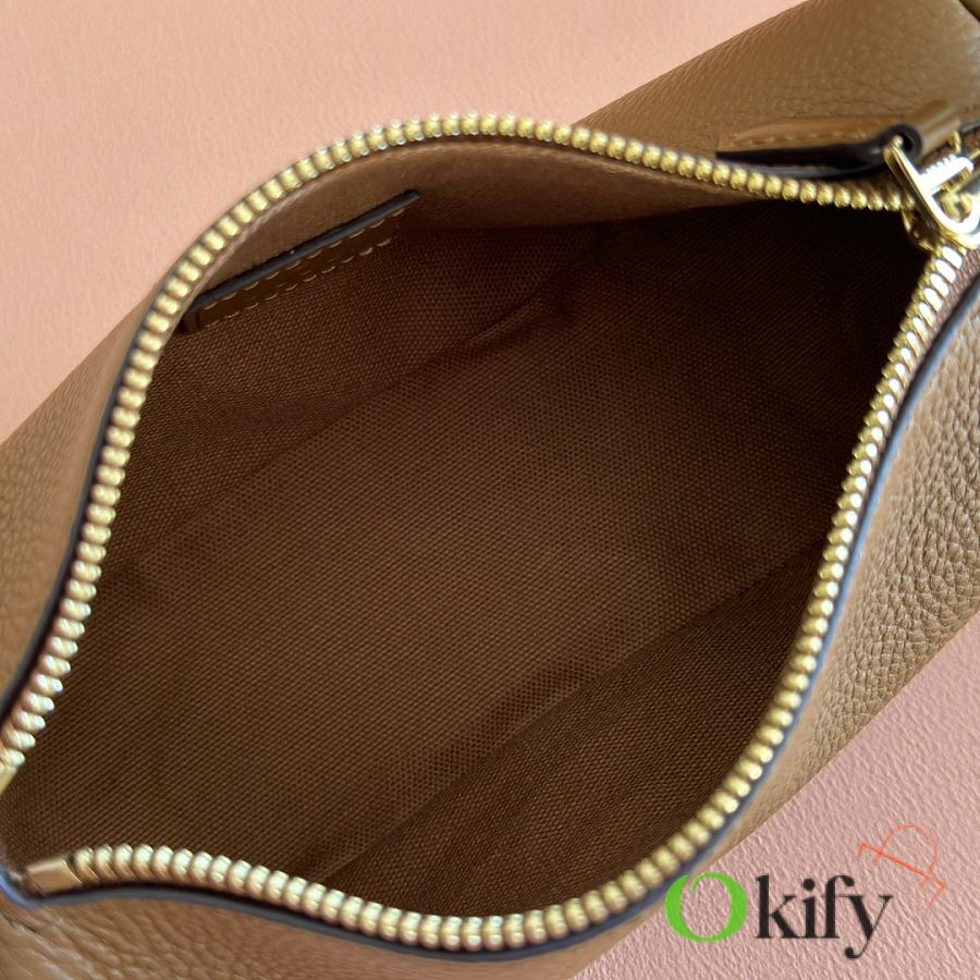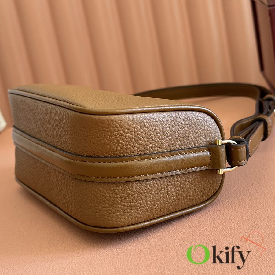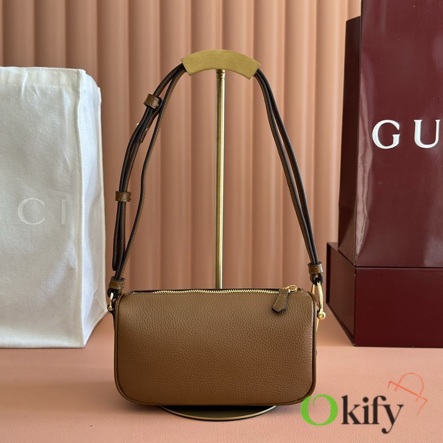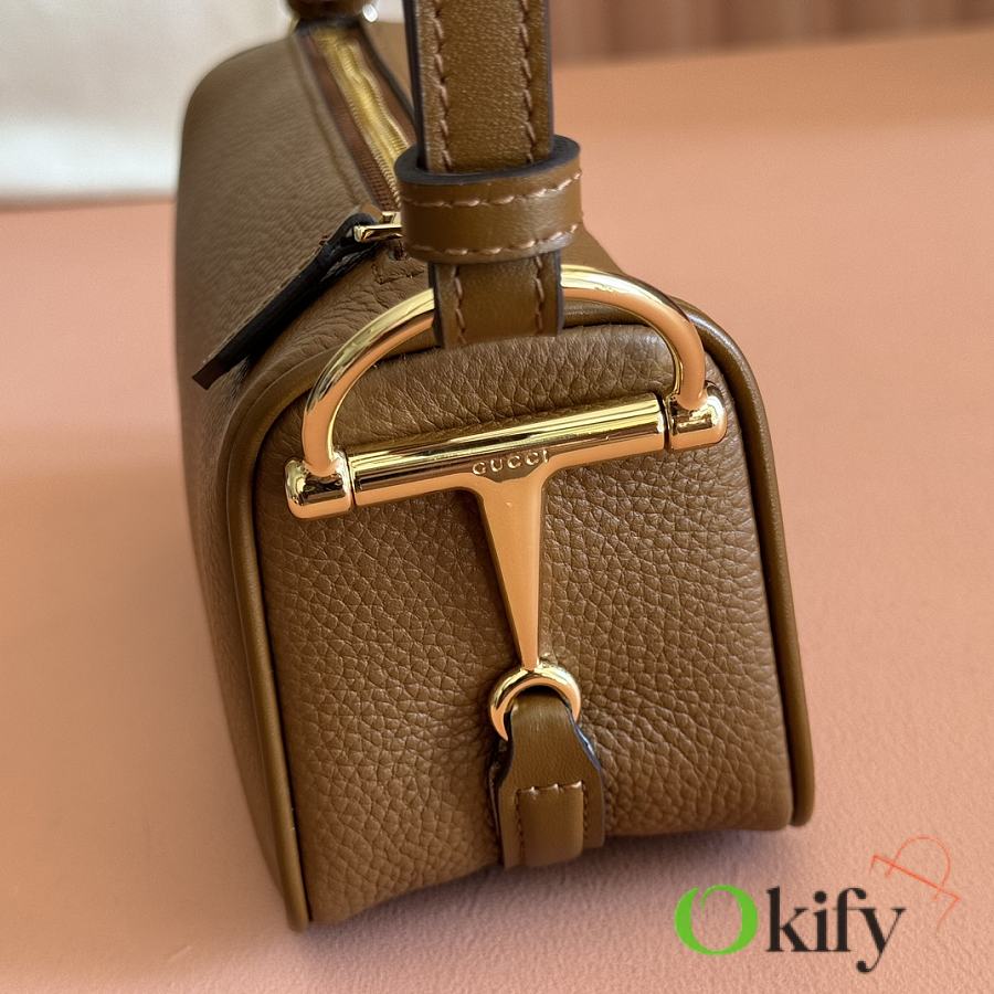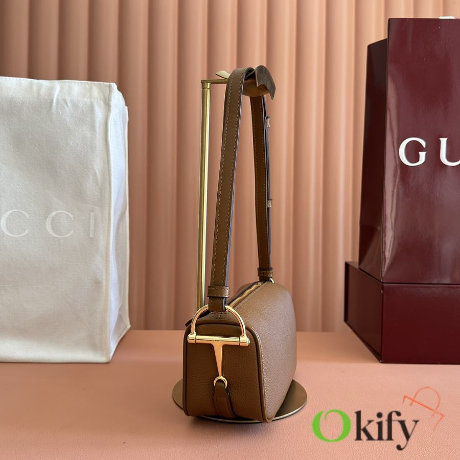 The brand reinterprets iconic elements from a contemporary perspective, presenting a refreshed Gucci horsebit design. Crafted from supple cowhide leather, this classic accessory is infused with new style. This mini handbag is meticulously crafted from grained soft leather and features a horsebit detail on the side. Green grained soft leather Light gold-tone hardware Tonal cotton-linen blend lining Horsebit Cowhide shoulder strap (23cm high) Zipper closure Model: 860784. Dimensions: 19cm (W) x 19.5cm (H) x 9cm (D) Weight: Approx. 272g Color: Brown/Full leather