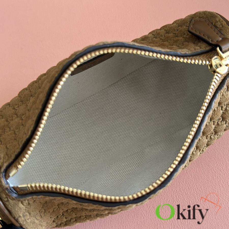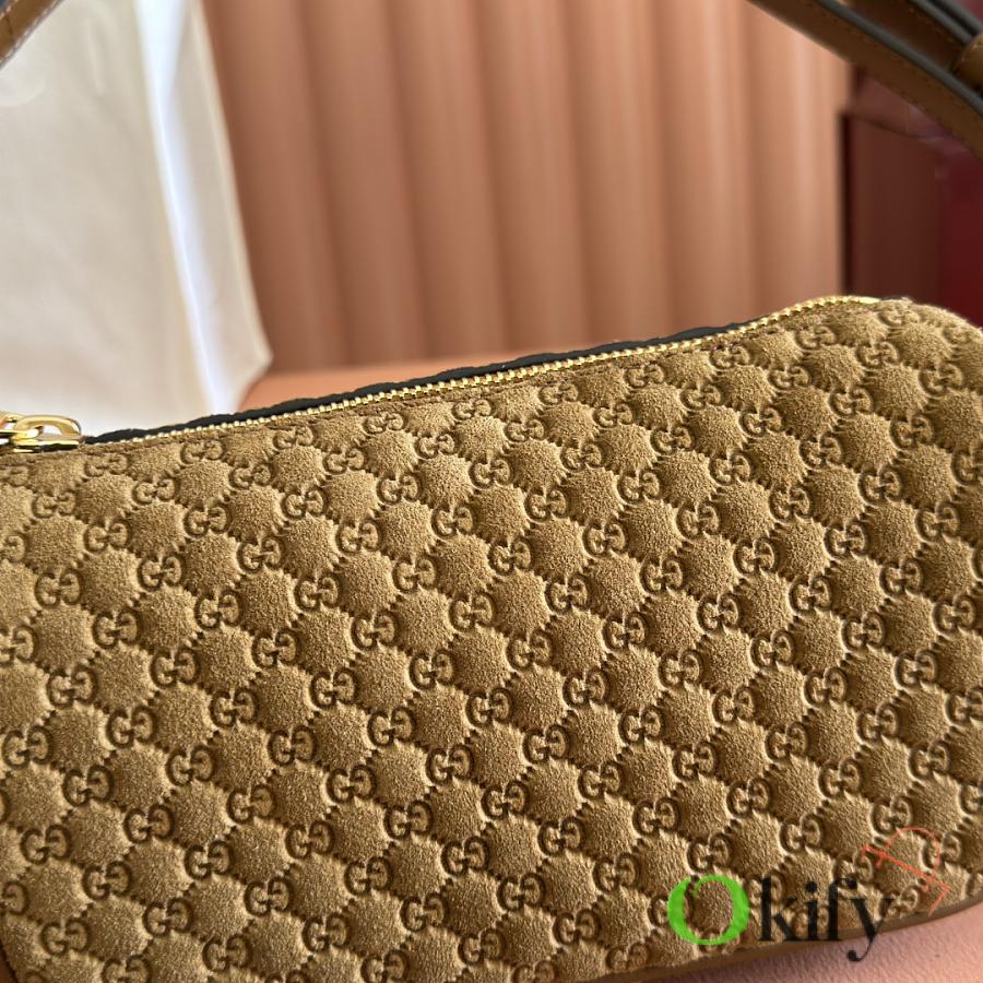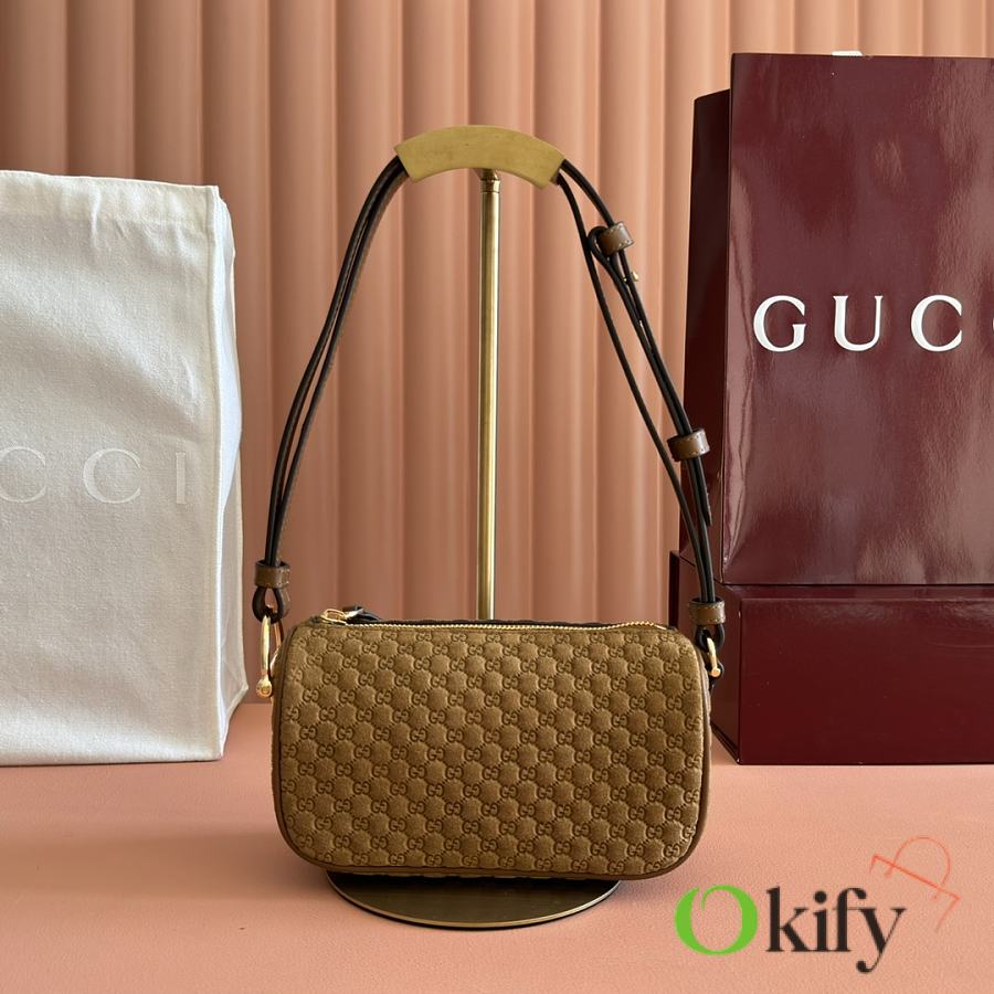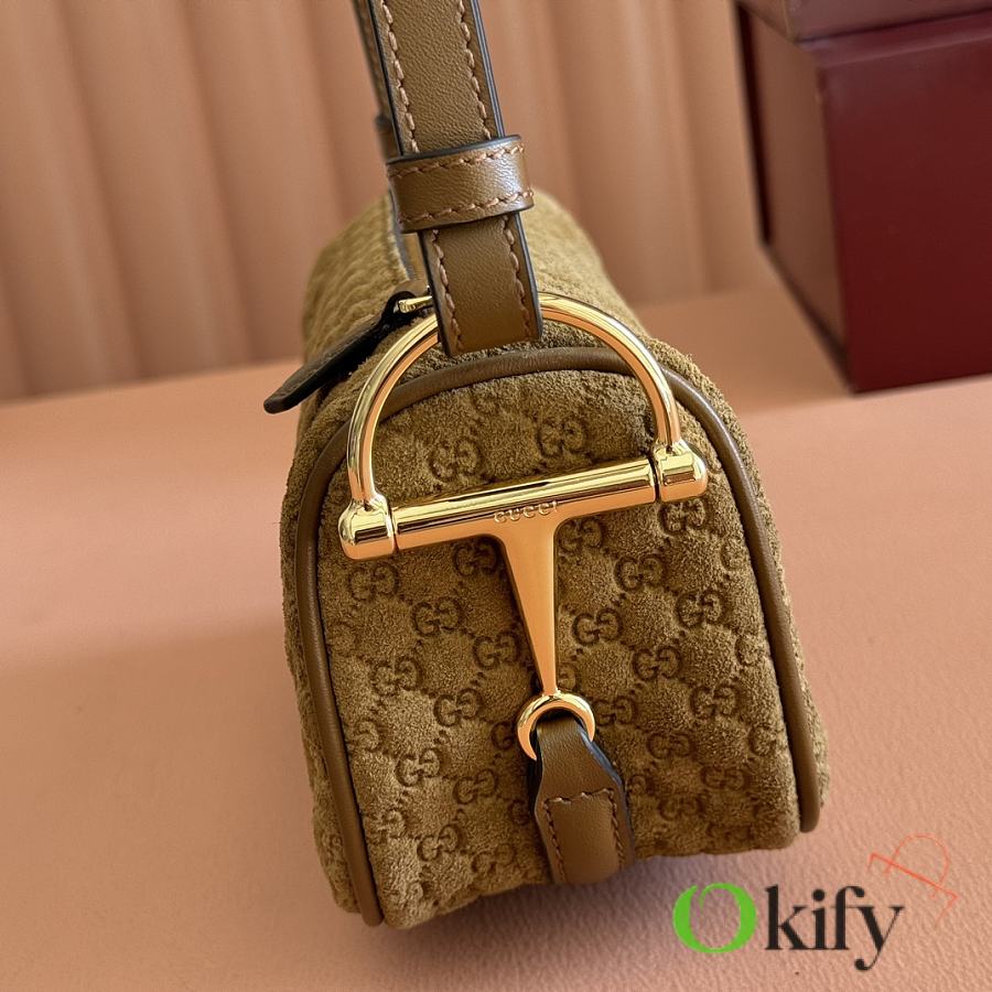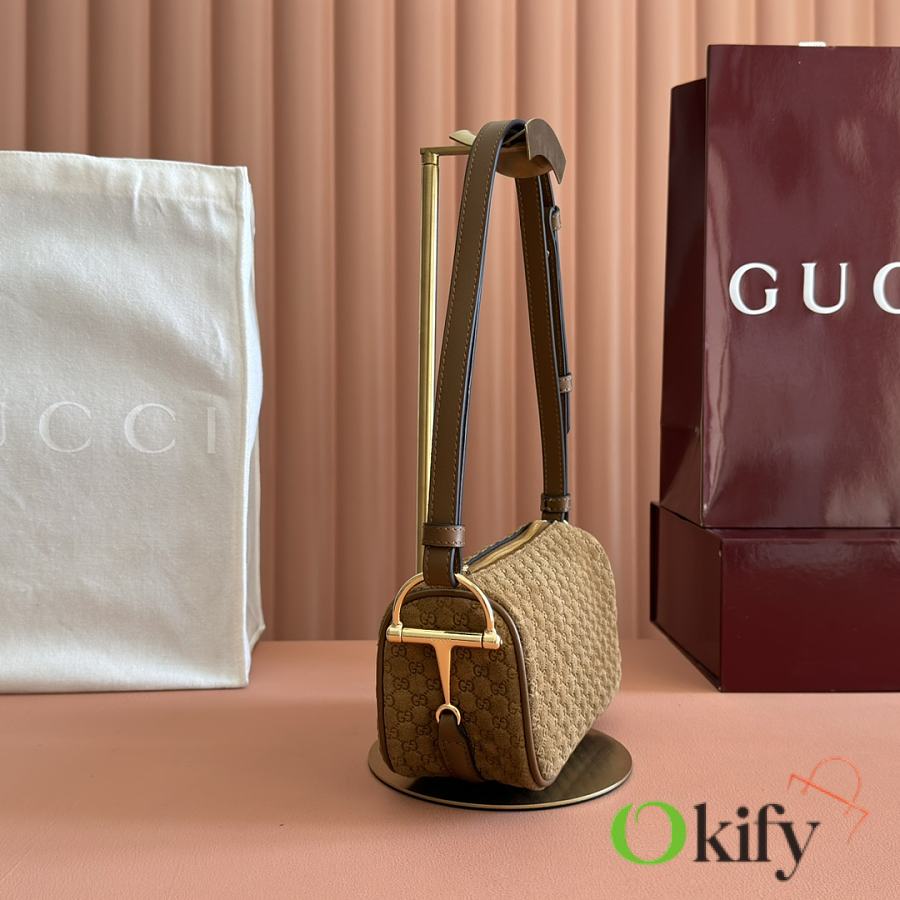 The brand reinterprets iconic elements from a contemporary perspective, presenting a refreshed Gucci horsebit design. Crafted from supple cowhide leather, this classic accessory is infused with new style. This mini handbag is meticulously crafted from grained soft leather and features a horsebit detail on the side. Green grained soft leather Light gold-tone hardware Tonal cotton-linen blend lining Horsebit Cowhide shoulder strap (23cm high) Zipper closure Model: 860784. Dimensions: 19cm (W) x 19.5cm (H) x 9cm (D) Weight: Approx. 272g Color: Brown/Full leather