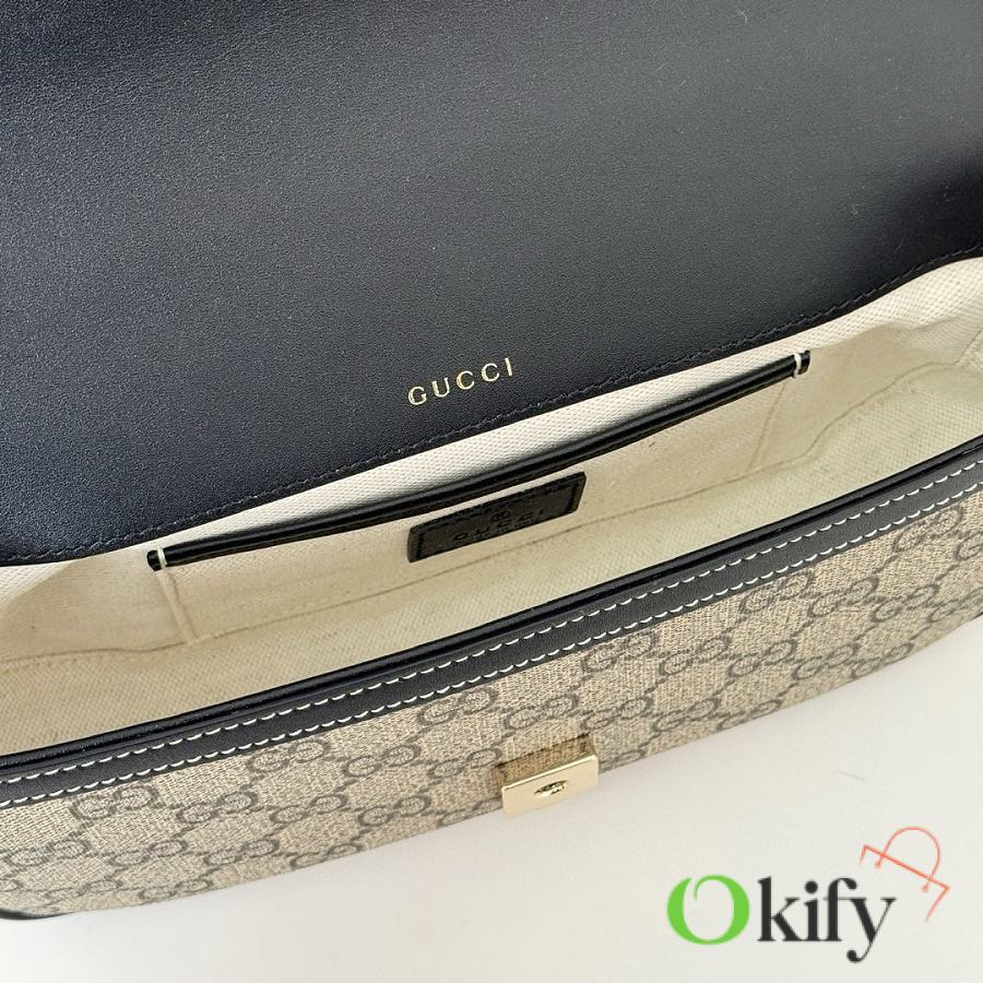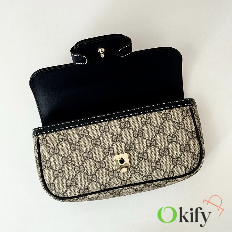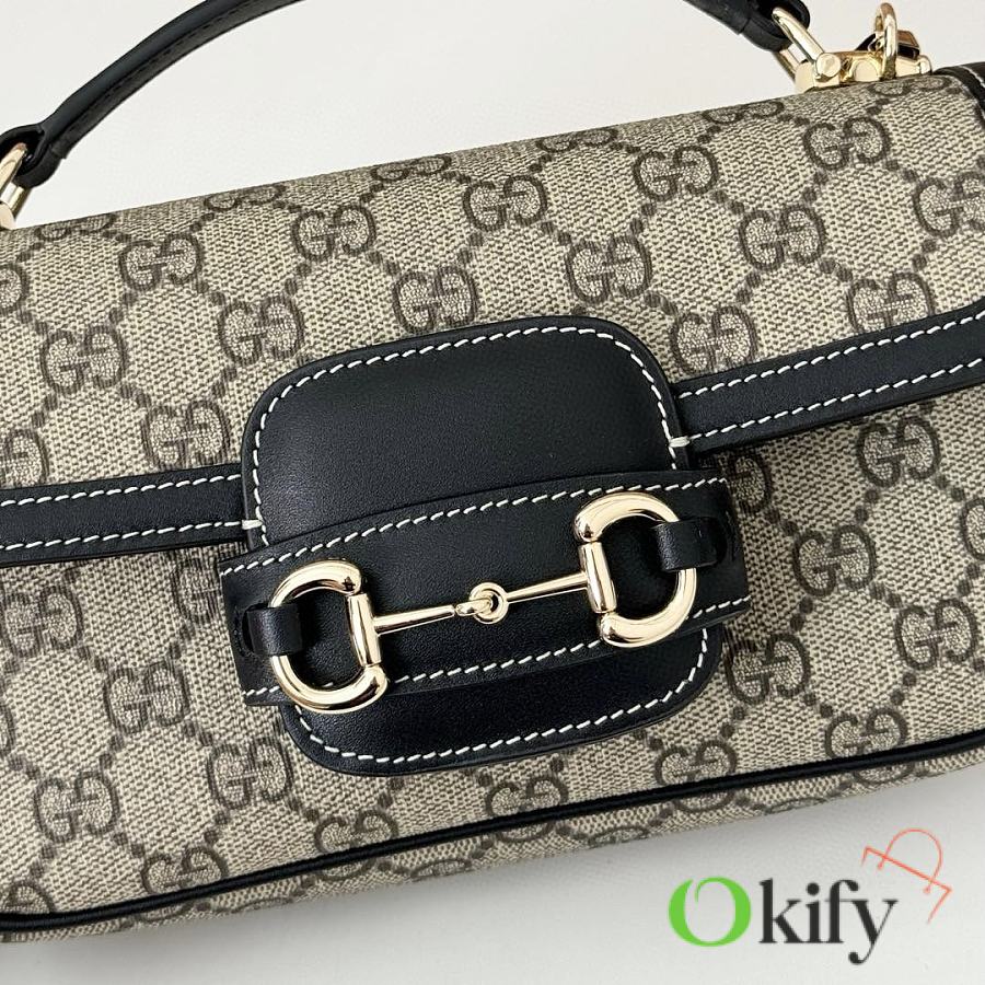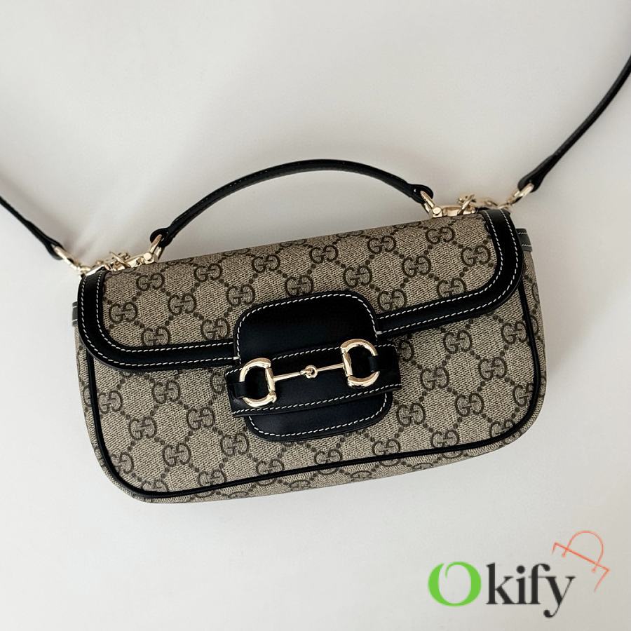 Brand new 1955 series handbag. This small tote bag is crafted from brand new GG canvas in beige and black, with a soft and refined feel. It features black (Gucci Rosso Ancora) leather trim, light gold hardware, a cotton-linen blend lining, and a horsebit detail on the front. Handle height: 4 cm. Detachable leather shoulder strap (47-55 cm high), strap length: 95-110 cm.