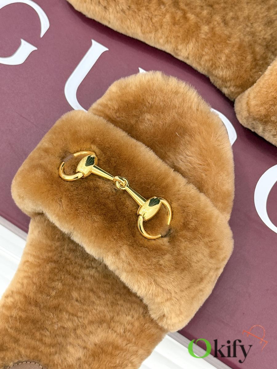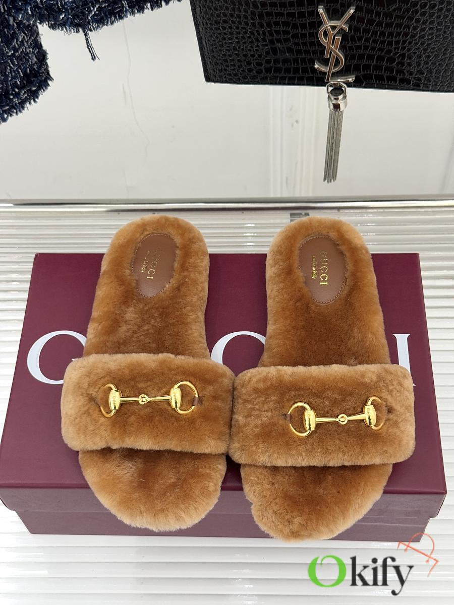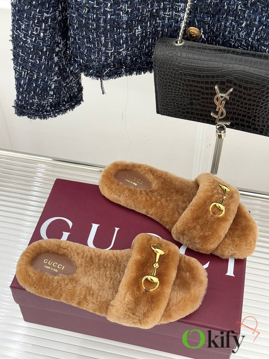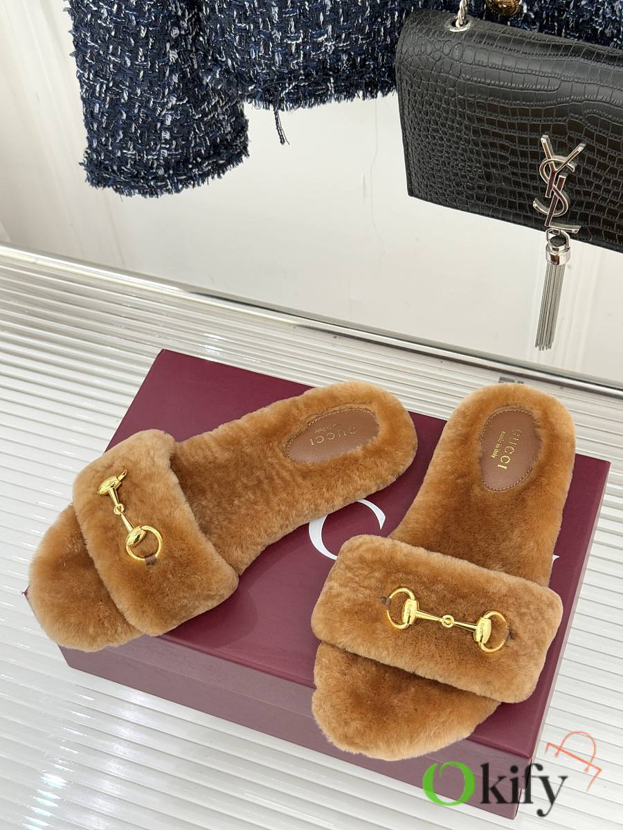 Okify Gucci Horsebit Women Wool Slippers Brown
