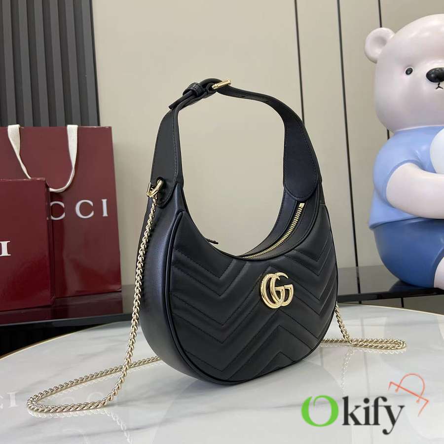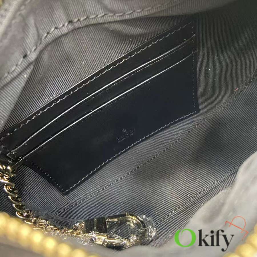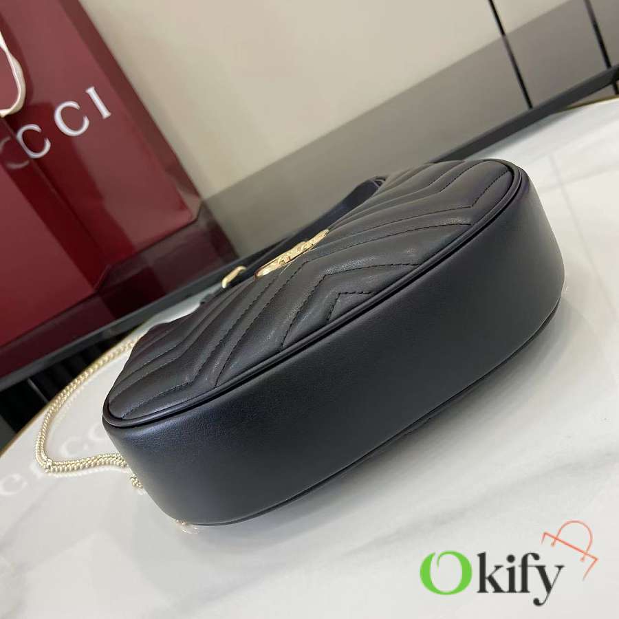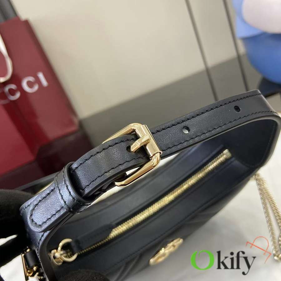 Black quilted V-shaped leather Light gold accessories Microfiber blended lining Double G Interior: 2 card compartments, 1 hook Adjustable handle (16 cm high) Chain shoulder strap (60 cm high) Zipper opening and closing Weight: Approximately 0.395 kg Model number: 699514. Dimensions: 21.5 cm (width) x 11 cm (height) x 5 cm (depth)