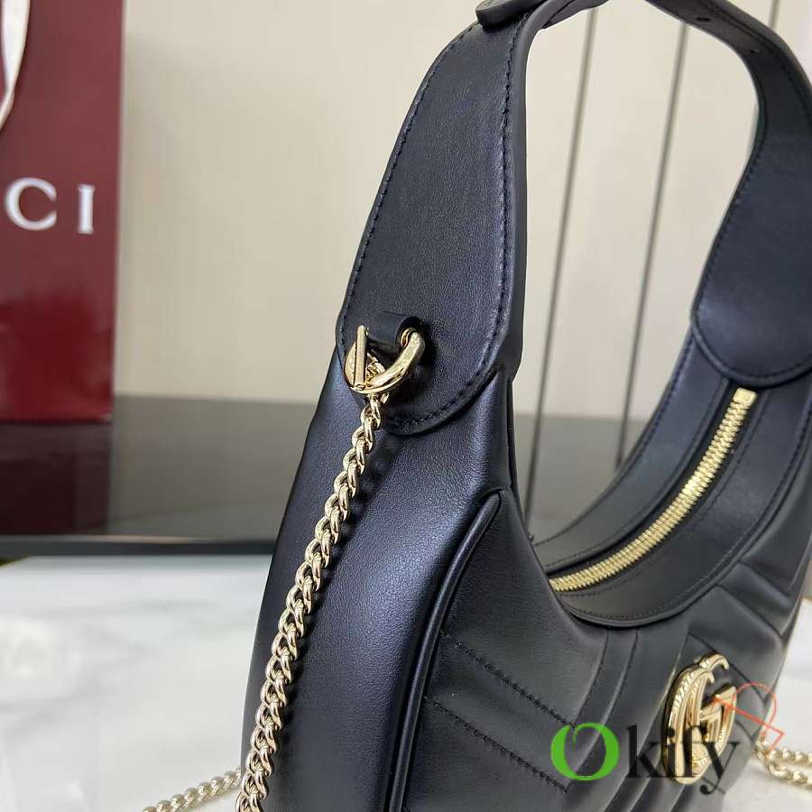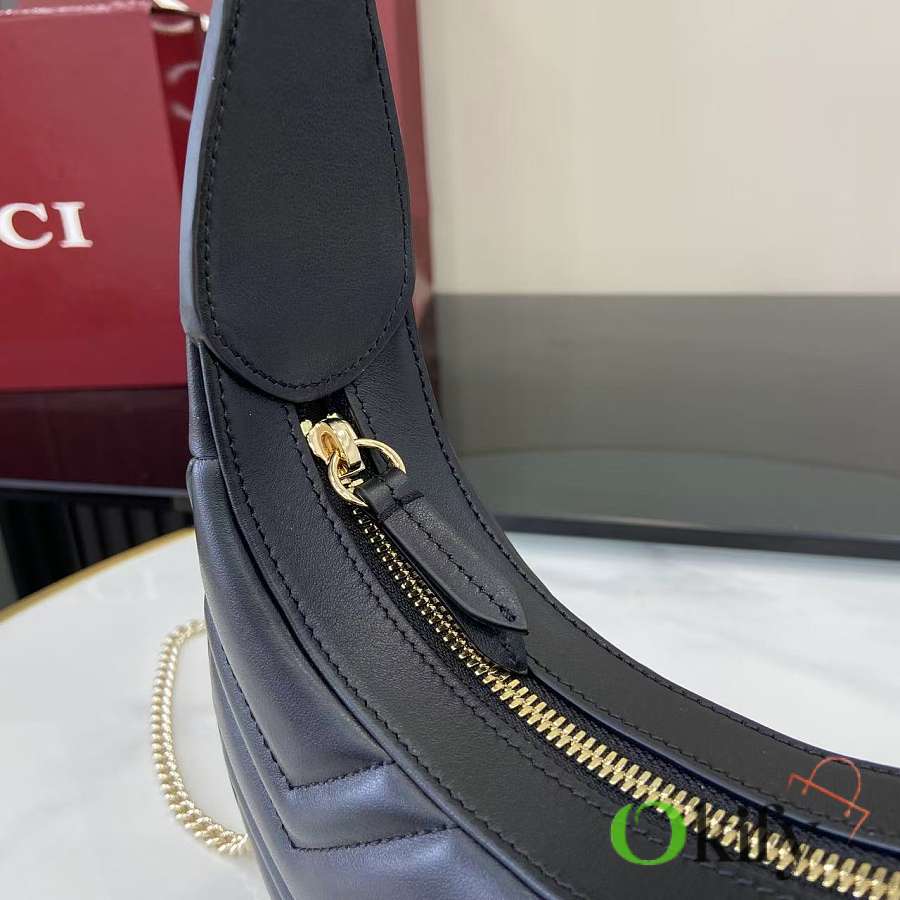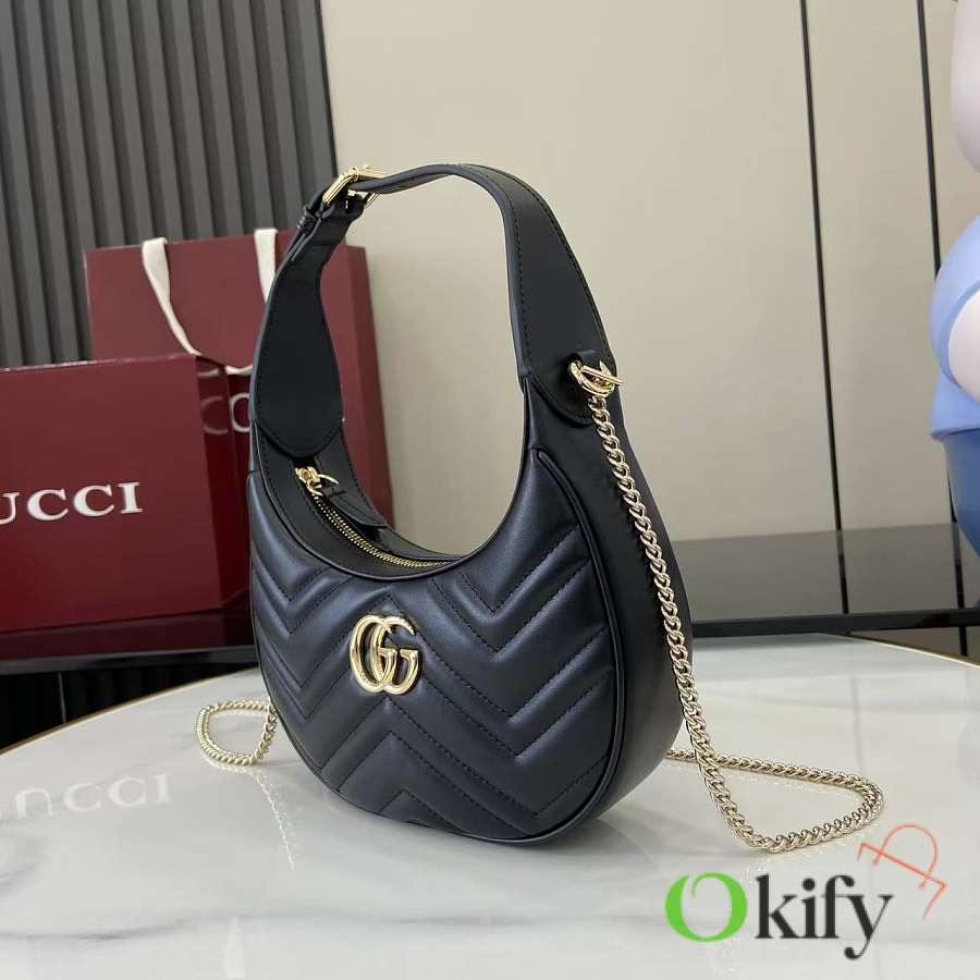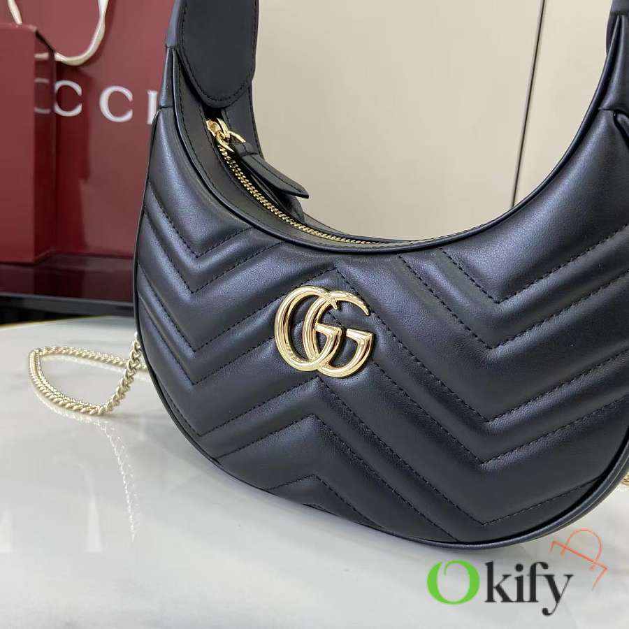 Black quilted V-shaped leather Light gold accessories Microfiber blended lining Double G Interior: 2 card compartments, 1 hook Adjustable handle (16 cm high) Chain shoulder strap (60 cm high) Zipper opening and closing Weight: Approximately 0.395 kg Model number: 699514. Dimensions: 21.5 cm (width) x 11 cm (height) x 5 cm (depth)