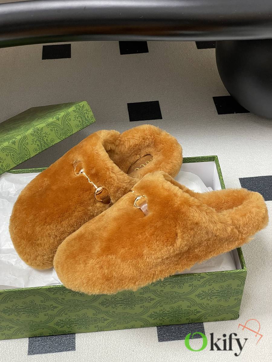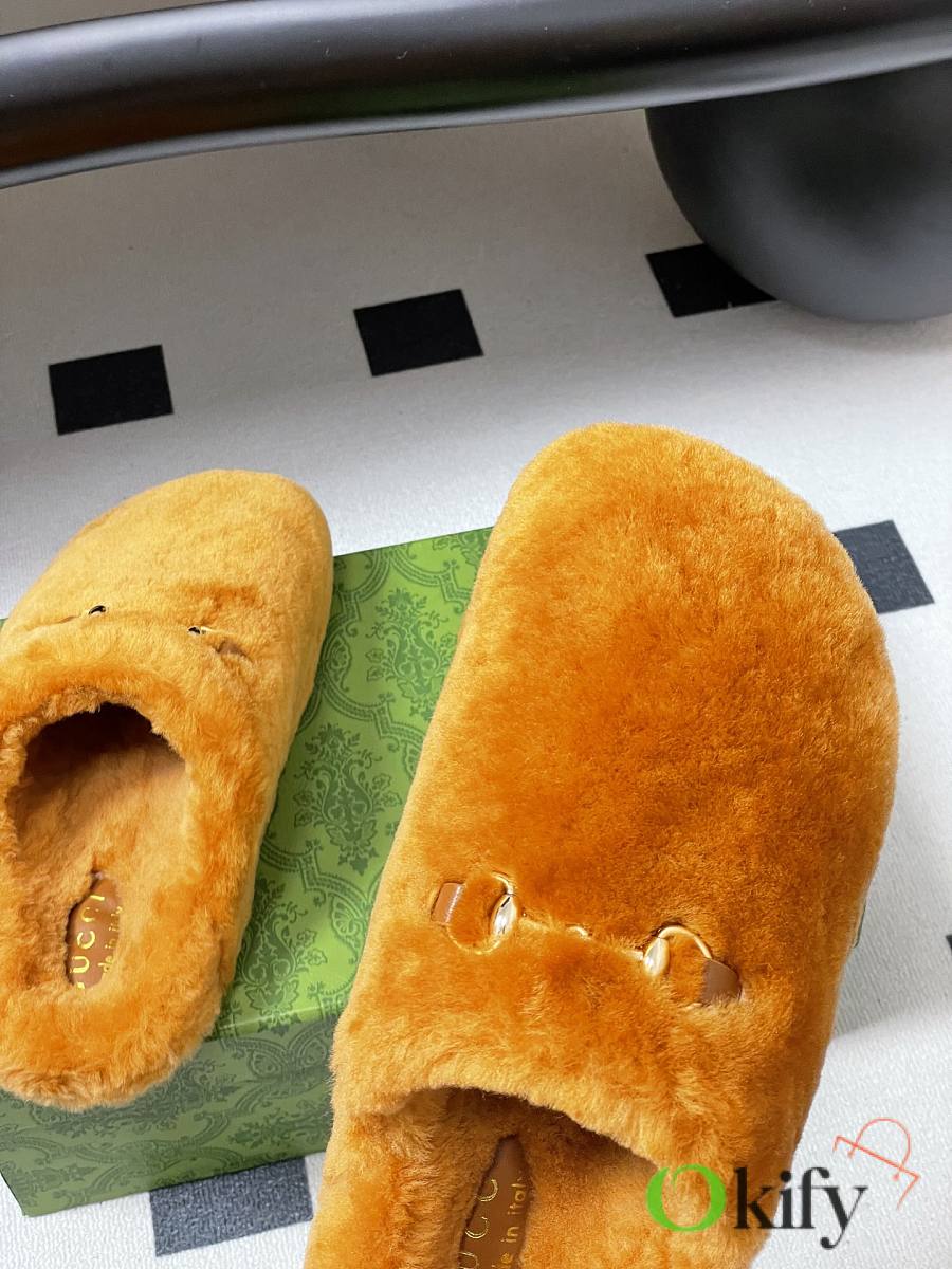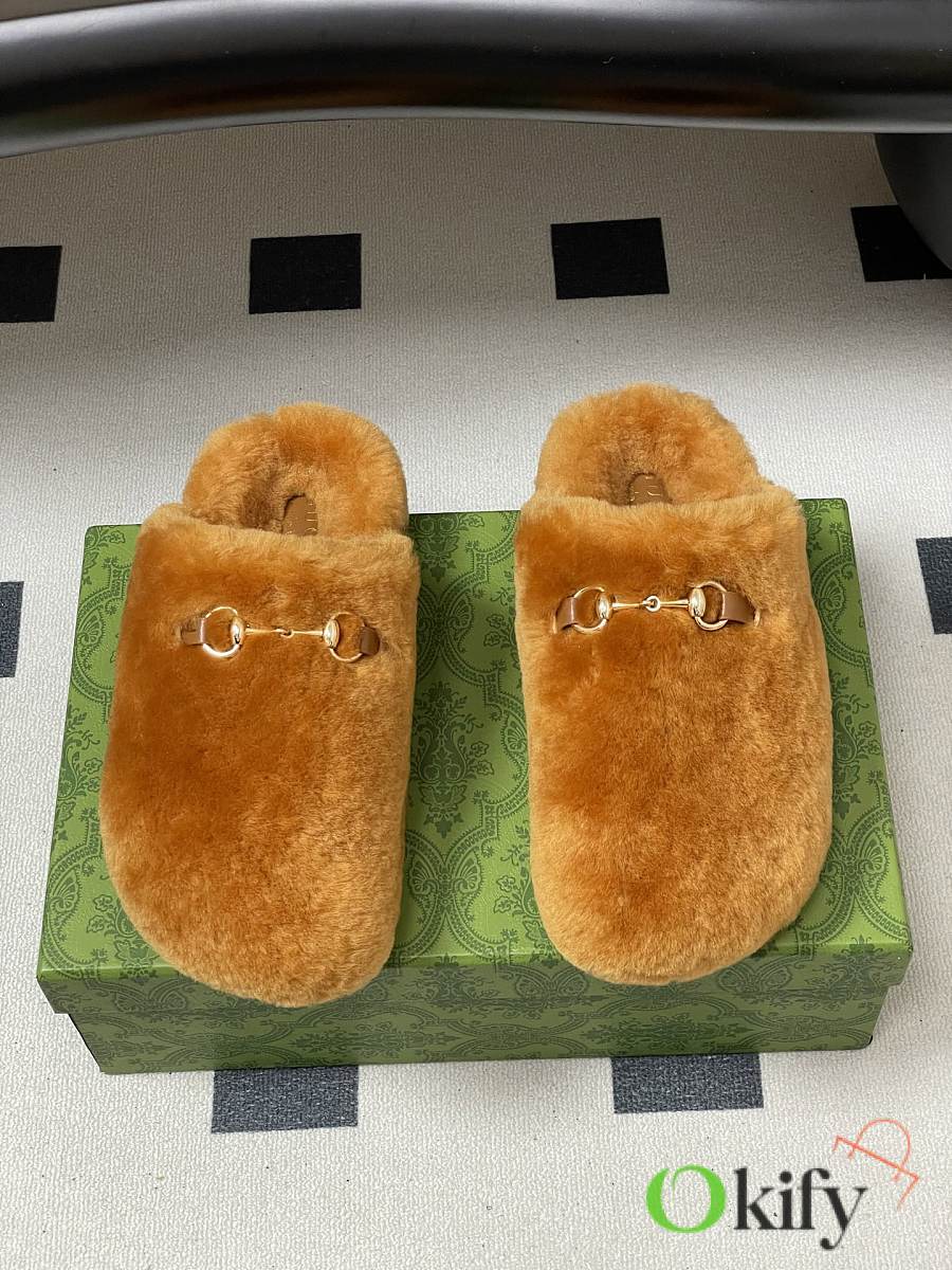 Wool mules, horsebit buckle flat slippers, merino lamb wool slippers. Known for its elegant silhouette, exquisite materials, and classic horsebit, this model is defined by its smooth suede and merino wool lining. As a distinguished representative of design heritage, the new collection of horsebit loafers vividly embodies classic elegance. These shoes are crafted from embossed leather featuring the brand's iconic GG logo, achieving timeless classic appeal. The soft material and refined, flowing silhouette exude everyday elegance! Upper: Wool Inner foot pads: wool Sole: Genuine leather outsole