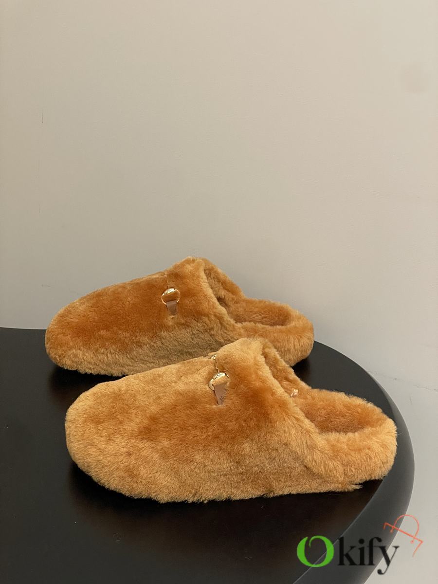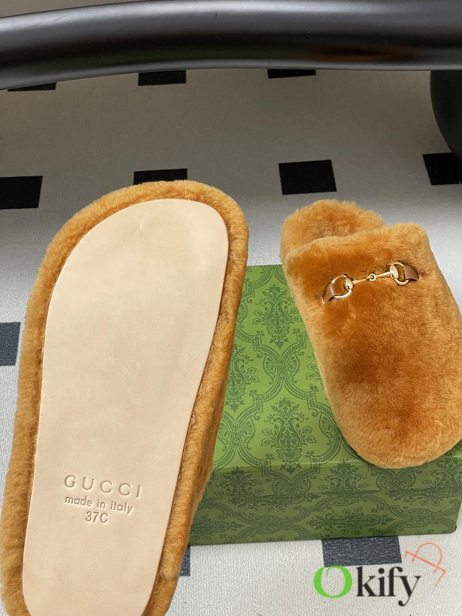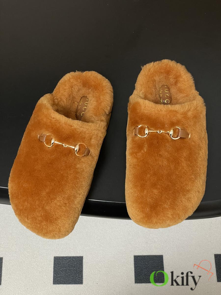 Wool mules, horsebit buckle flat slippers, merino lamb wool slippers. Known for its elegant silhouette, exquisite materials, and classic horsebit, this model is defined by its smooth suede and merino wool lining. As a distinguished representative of design heritage, the new collection of horsebit loafers vividly embodies classic elegance. These shoes are crafted from embossed leather featuring the brand's iconic GG logo, achieving timeless classic appeal. The soft material and refined, flowing silhouette exude everyday elegance! Upper: Wool Inner foot pads: wool Sole: Genuine leather outsole