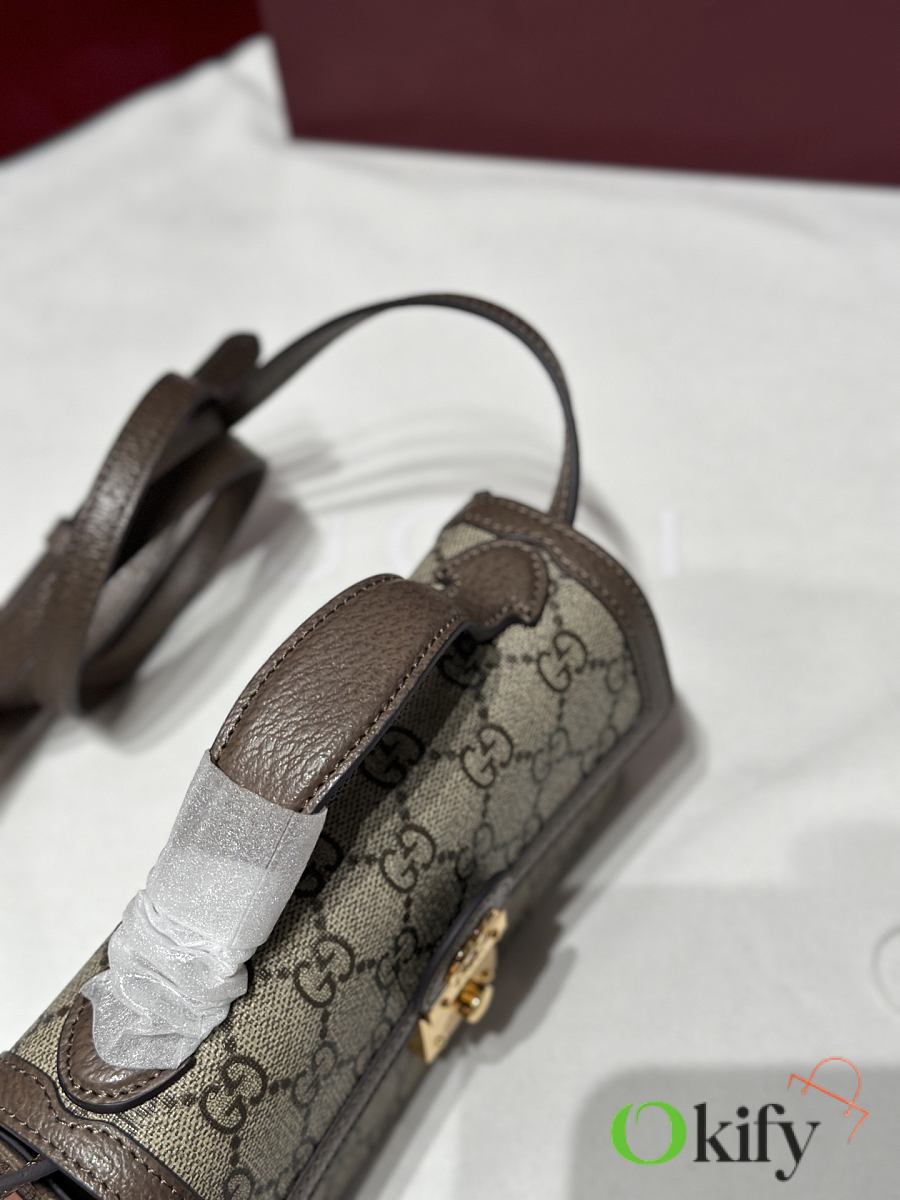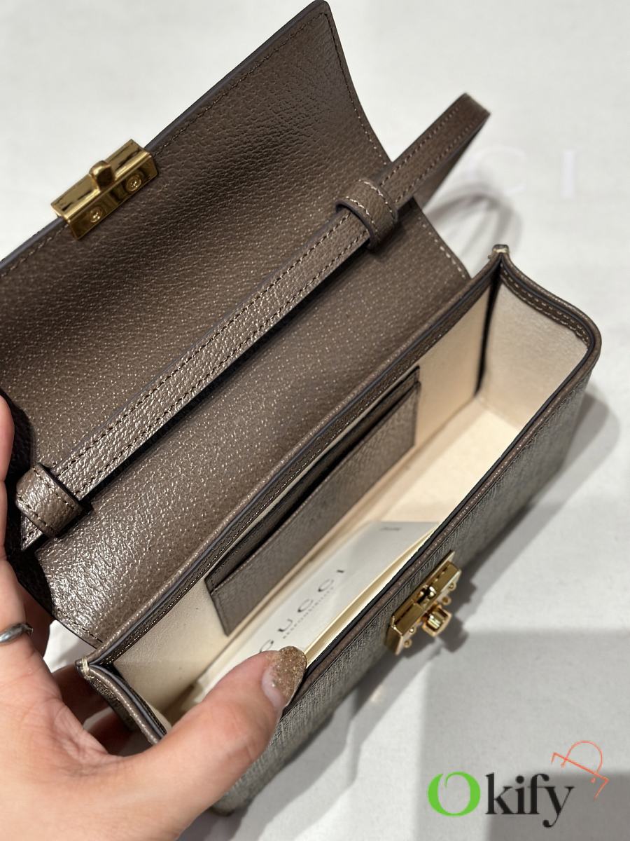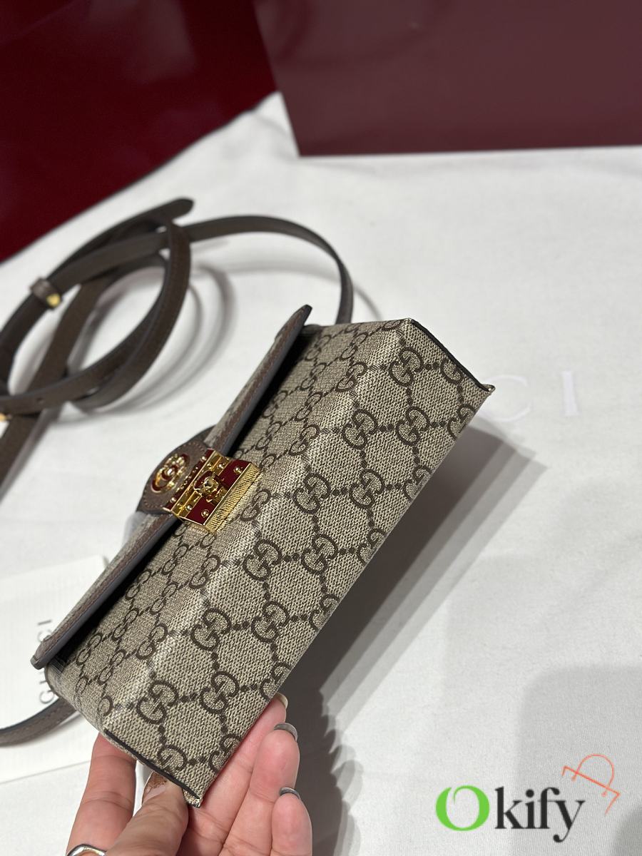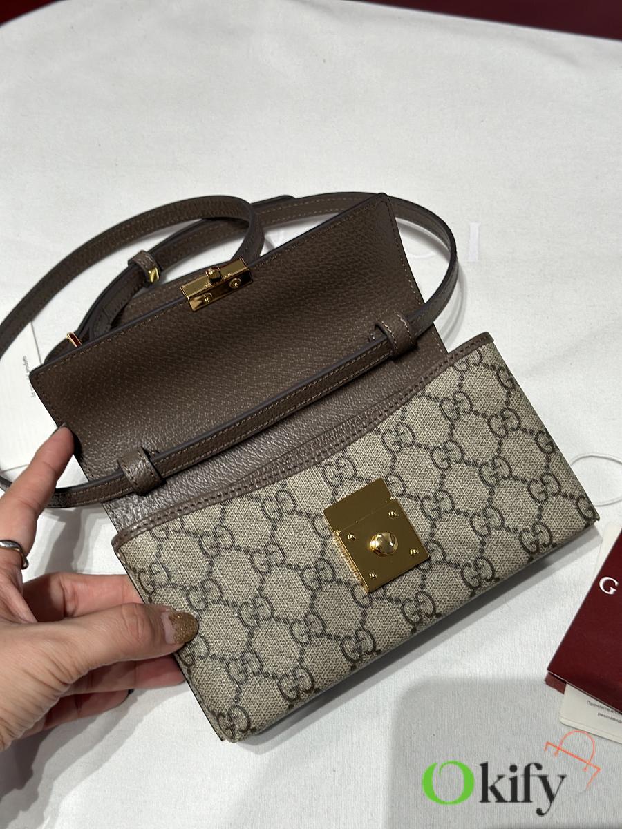 this small shoulder bag is crafted from beige and ebony GG Supreme canvas. It features a striking padlock closure, brown leather trim, and a new adjustable leather chain shoulder strap. Gold-tone hardware and a leather key ring enhance the overall design. Beige and ebony GG Supreme canvas, brown leather trim, gold-tone hardware, off-white canvas lining.
