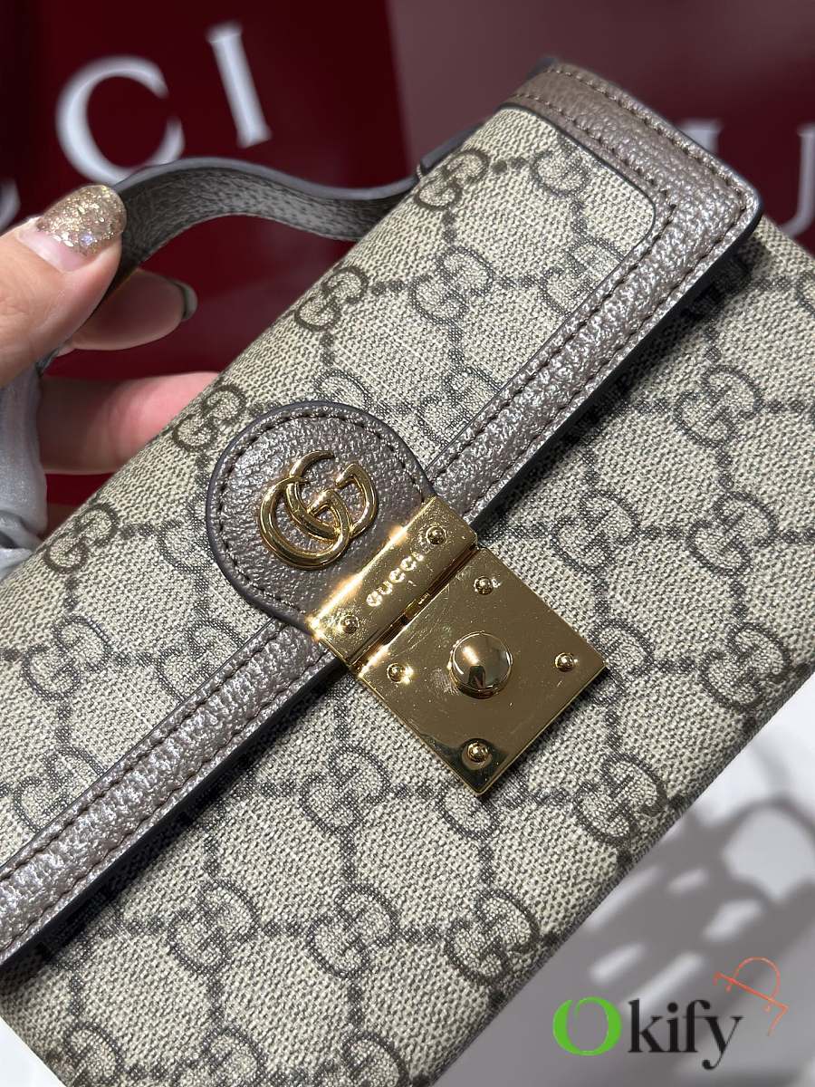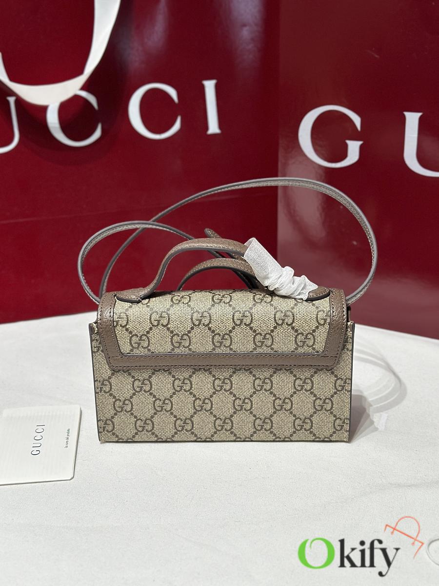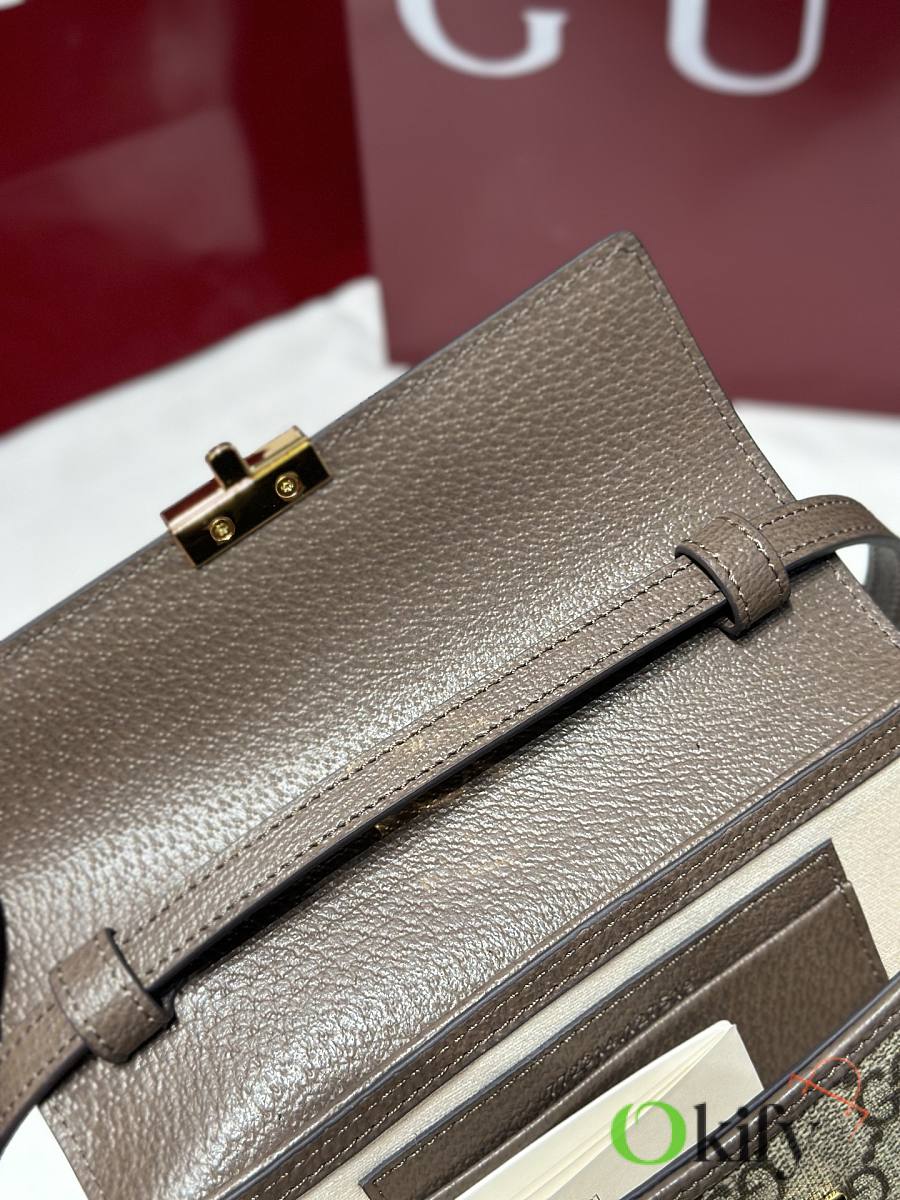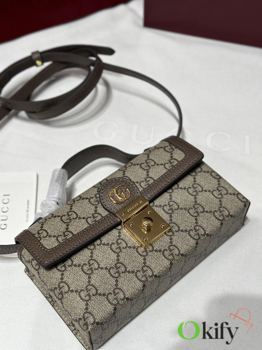this small shoulder bag is crafted from beige and ebony GG Supreme canvas. It features a striking padlock closure, brown leather trim, and a new adjustable leather chain shoulder strap. Gold-tone hardware and a leather key ring enhance the overall design. Beige and ebony GG Supreme canvas, brown leather trim, gold-tone hardware, off-white canvas lining.