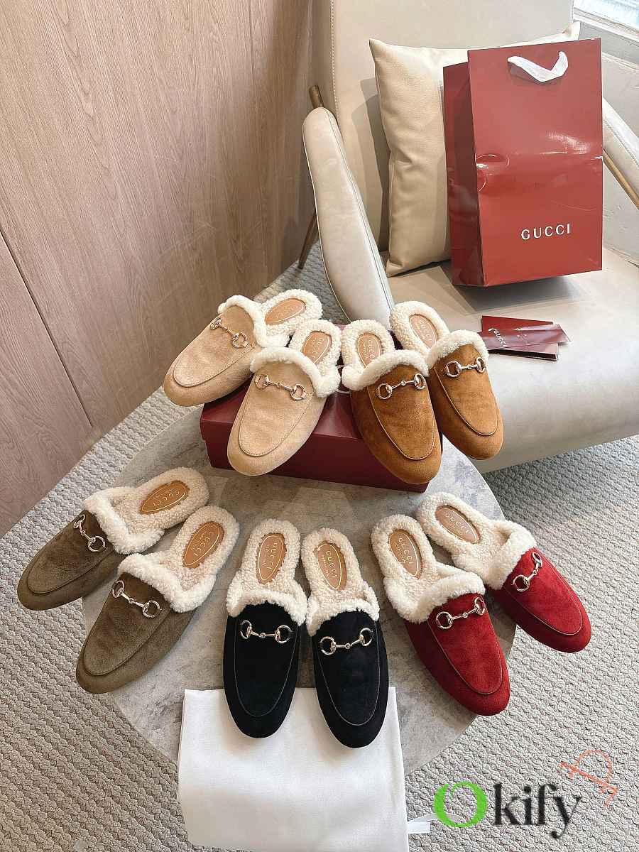 Gucci's iconic Princetown slipper is known for its elegant silhouette, refined materials, and classic horsebit. This model is defined by its smooth suede and merino wool lining.