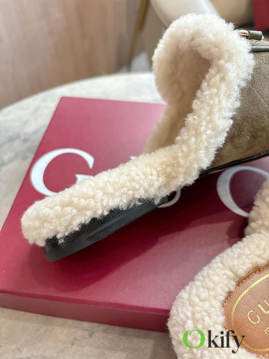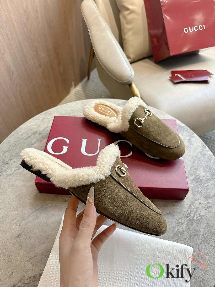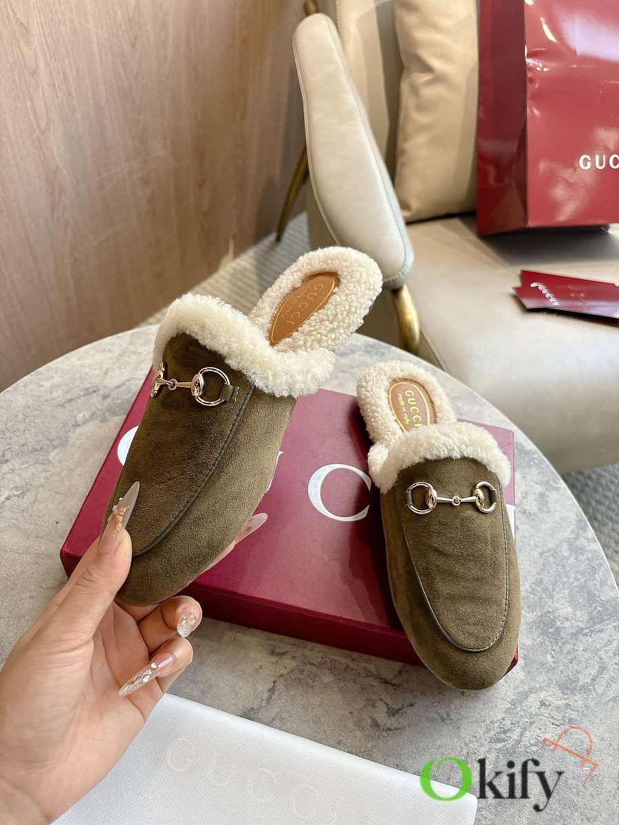 Gucci's iconic Princetown slipper is known for its elegant silhouette, refined materials, and classic horsebit. This model is defined by its smooth suede and merino wool lining.