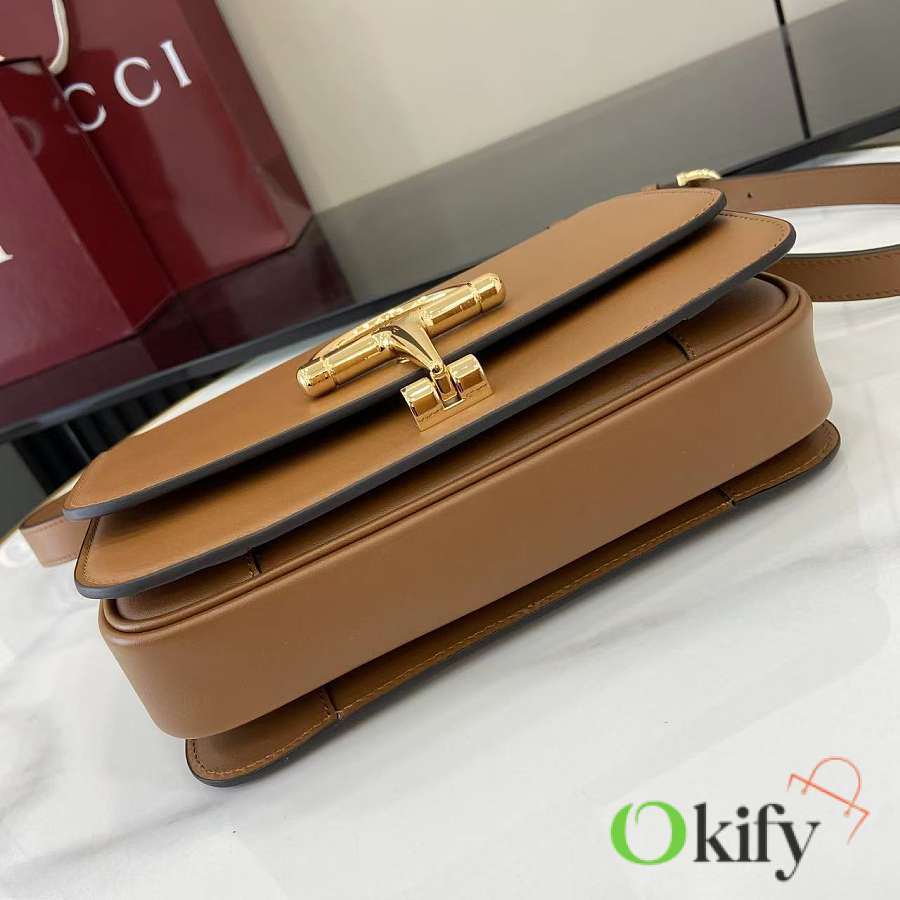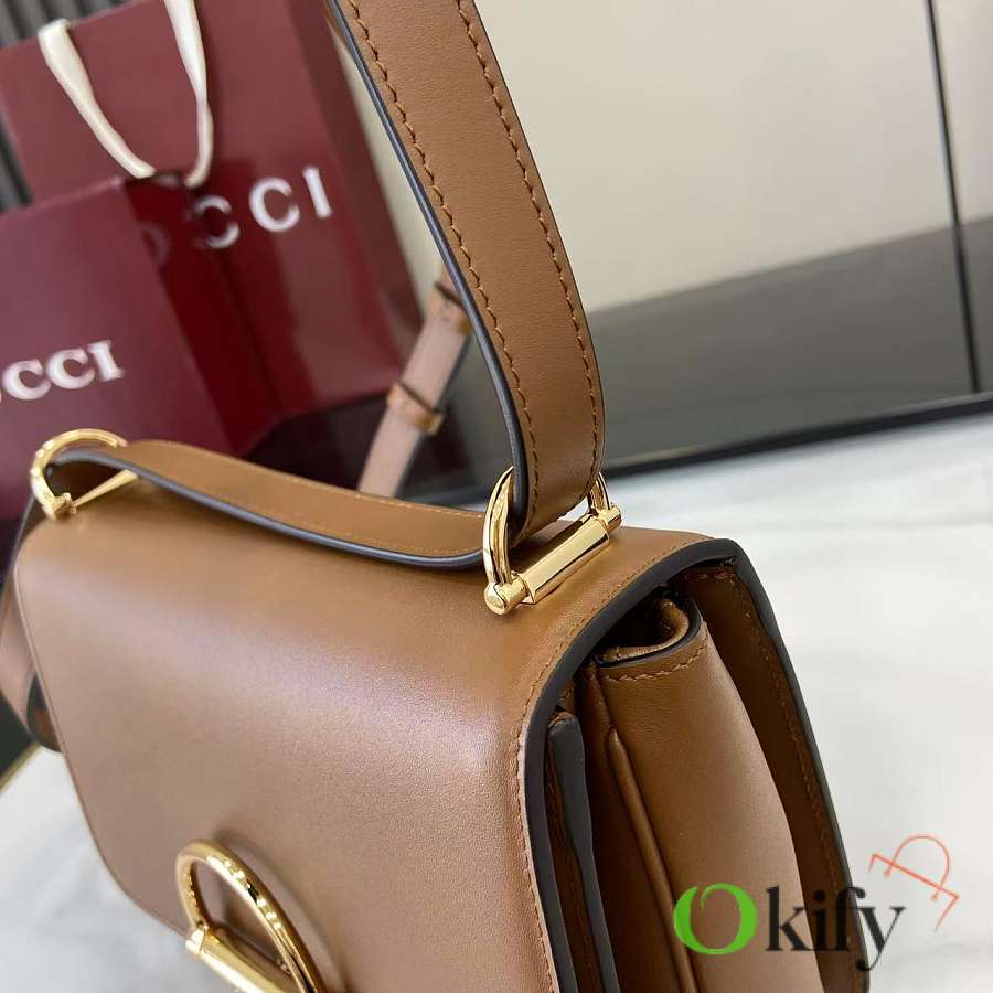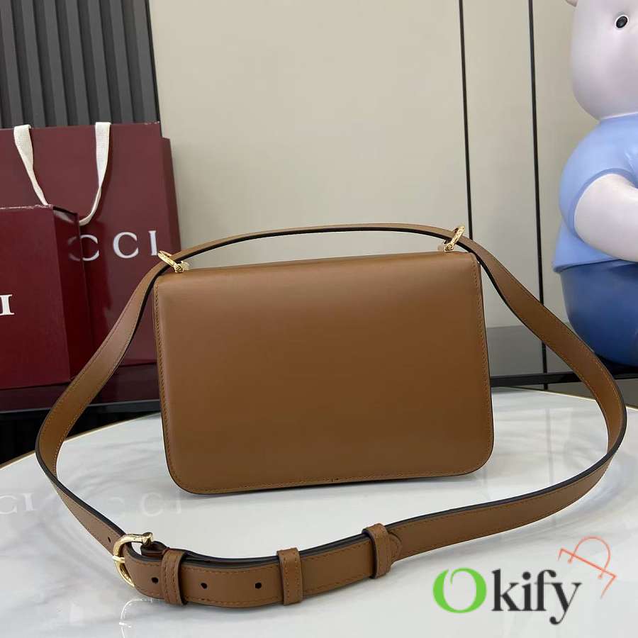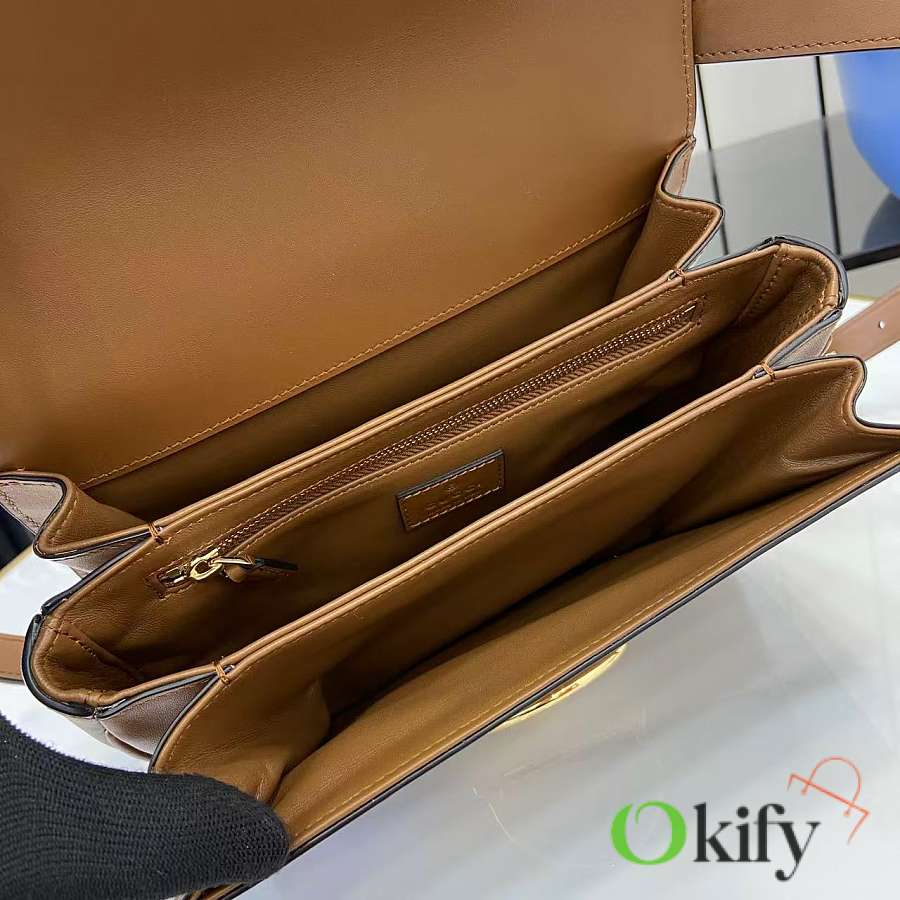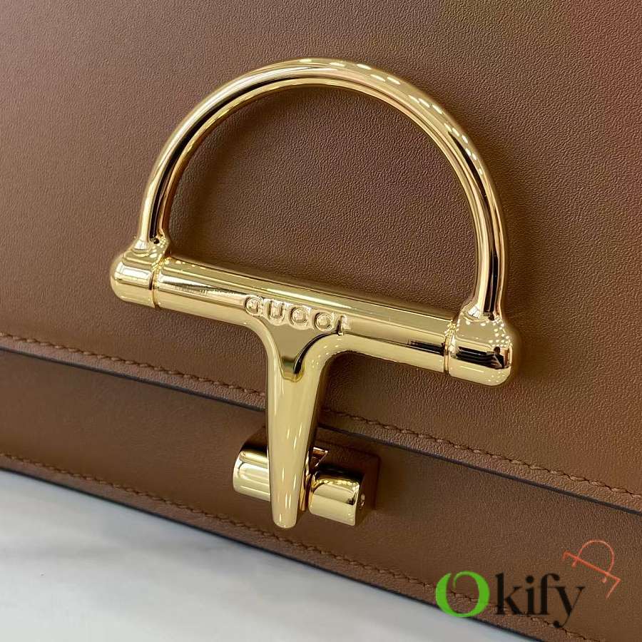 The Gucci Siena series offers a fresh interpretation of the brand's classic horsebit element, creating a captivating handbag piece. This shoulder bag is crafted from fine, smooth leather, its structured shape incorporating details from the half-horsebit clasp design originating from the 1970s. Brown smooth leather Gold-tone hardware Brown leather lining Interior: 3 compartments and 1 zip pocket Shoulder strap: Height: 23cm–25cm; Length: 127cm Half-horsebit snap closure Model: 846705. Dimensions: 22.5cm (W) x 14cm (H) x 8cm (D) Weight: Approx. 0.7kg Color: Brown/Full leather.