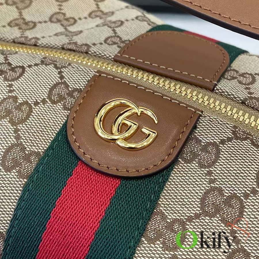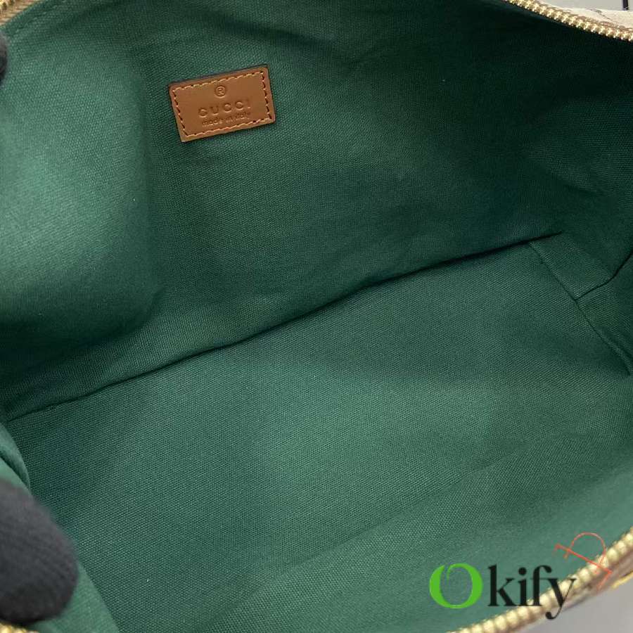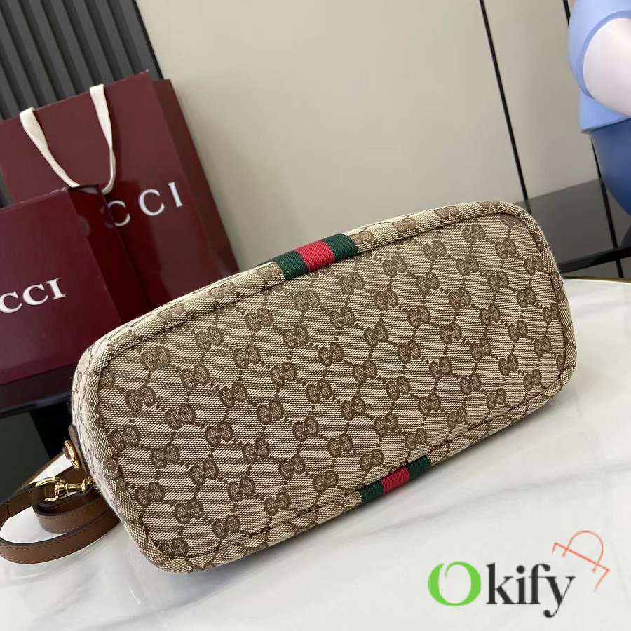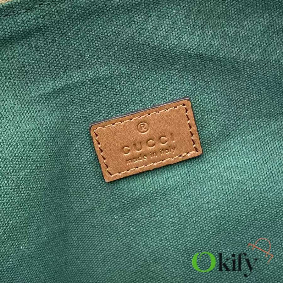 The Gucci Vanity series draws inspiration from classic cosmetic bags, featuring a striking silhouette and three versatile carrying options. This handbag can be worn over the shoulder or folded up for a tote bag look. With an additional strap, it can also be carried as a crossbody bag. Beige and brown GG canvas Brown leather piping Gold-tone accessories Green linen-cotton blend lining Double G Sliding handle: 4 cm - 42 cm Detachable and adjustable leather shoulder strap Zipper opening and closing Model number: 857799. Dimensions: 27.5 cm (width) x 13 cm (height) x 14.5 cm (depth) Weight: Approximately 0.45 kg Color: Apricot/Brown.