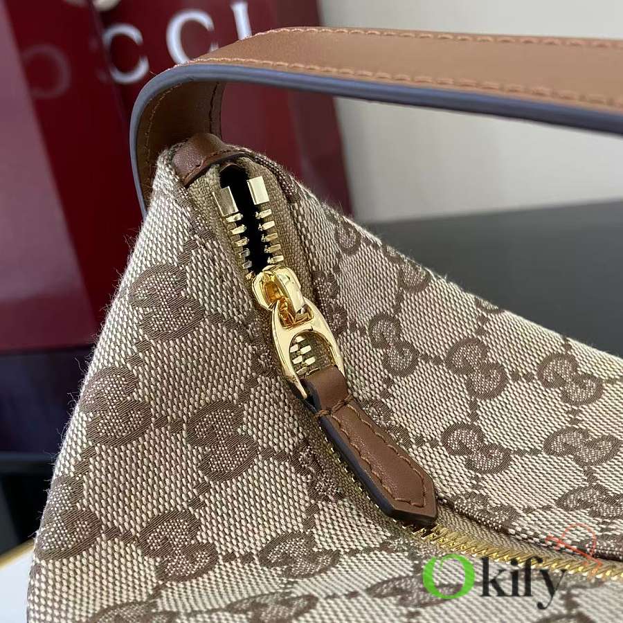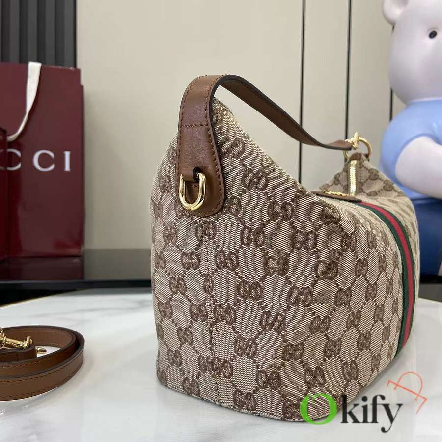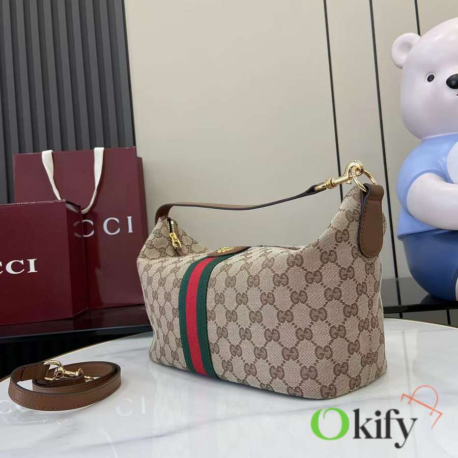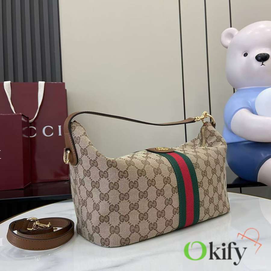The Gucci Vanity series draws inspiration from classic cosmetic bags, featuring a striking silhouette and three versatile carrying options. This handbag can be worn over the shoulder or folded up for a tote bag look. With an additional strap, it can also be carried as a crossbody bag. Beige and brown GG canvas Brown leather piping Gold-tone accessories Green linen-cotton blend lining Double G Sliding handle: 4 cm - 42 cm Detachable and adjustable leather shoulder strap Zipper opening and closing Model number: 857799. Dimensions: 27.5 cm (width) x 13 cm (height) x 14.5 cm (depth) Weight: Approximately 0.45 kg Color: Apricot/Brown.