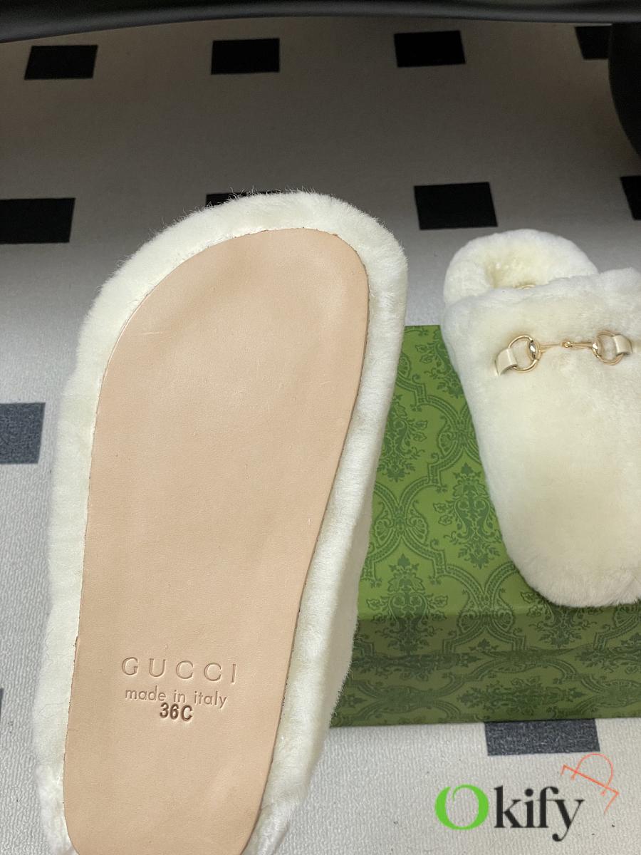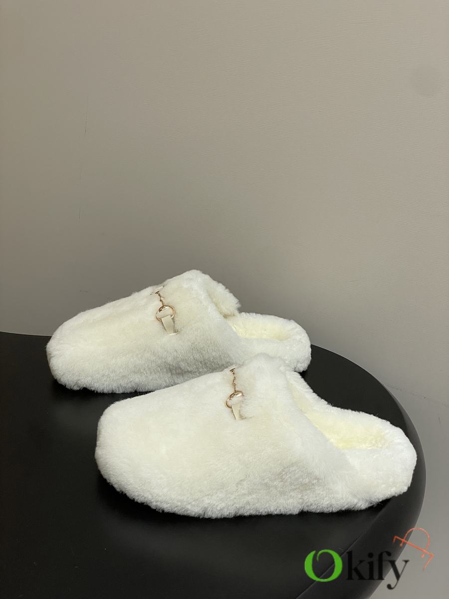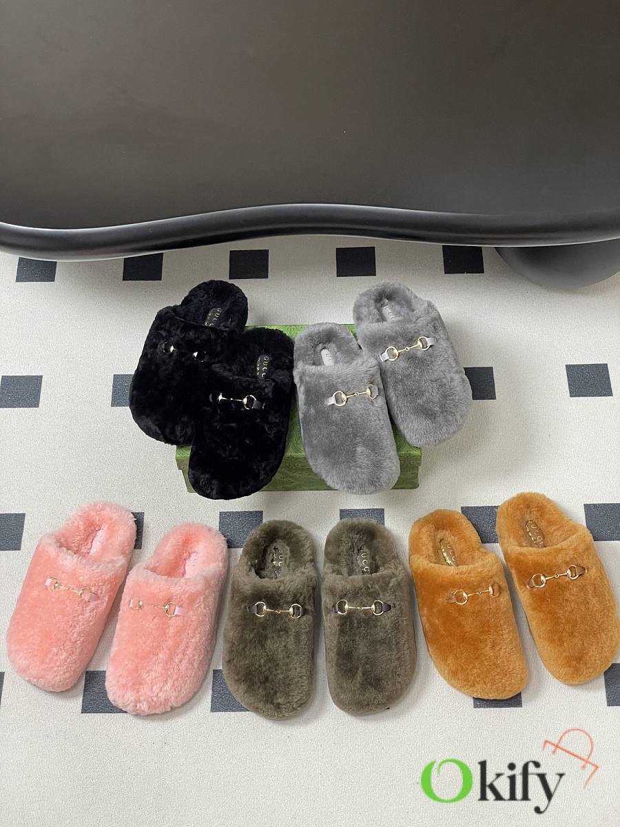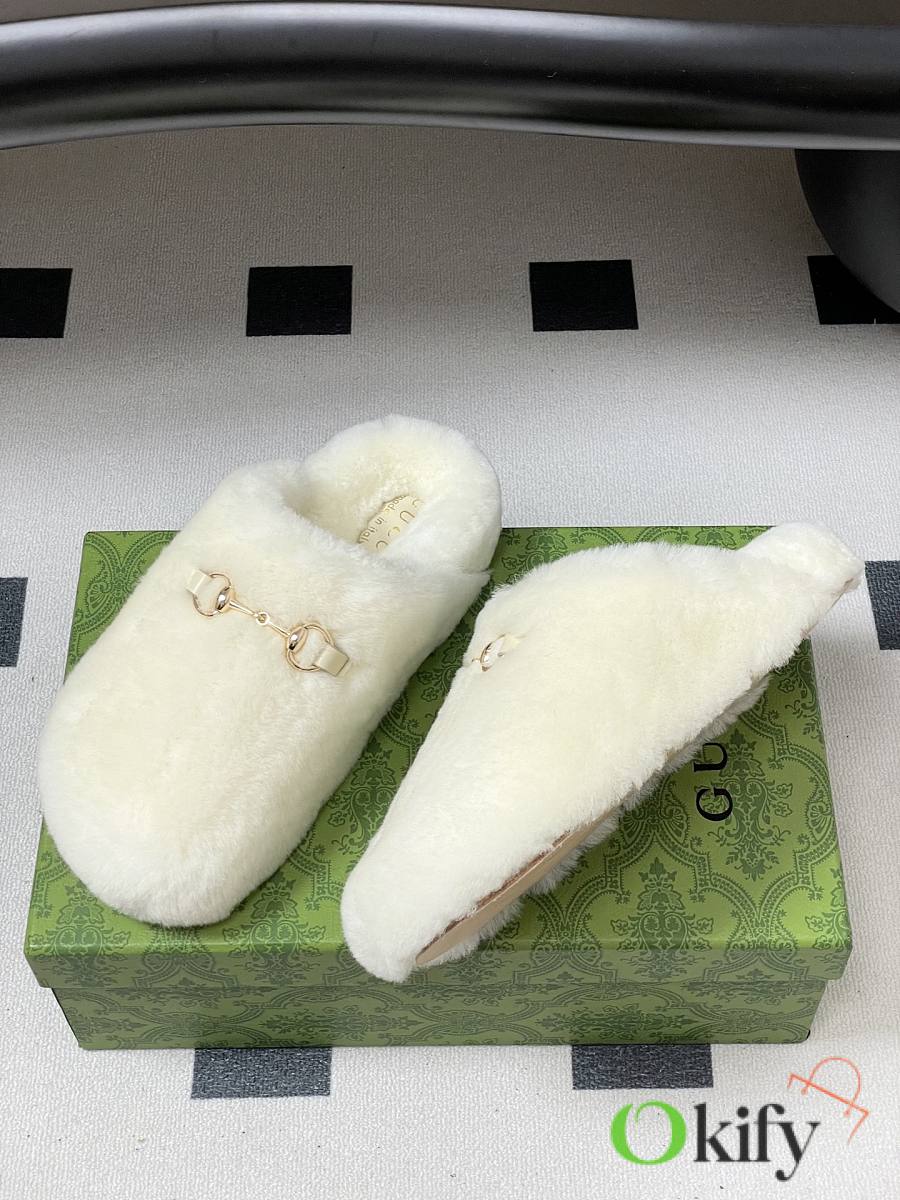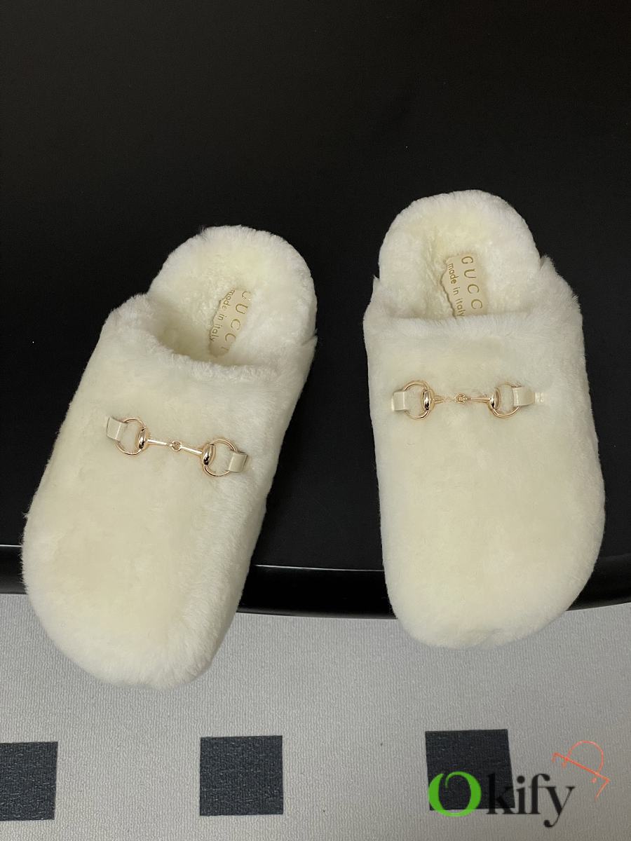 Wool mules, horsebit buckle flat slippers, merino lamb wool slippers. Known for its elegant silhouette, exquisite materials, and classic horsebit, this model is defined by its smooth suede and merino wool lining. As a distinguished representative of design heritage, the new collection of horsebit loafers vividly embodies classic elegance. These shoes are crafted from embossed leather featuring the brand's iconic GG logo, achieving timeless classic appeal. The soft material and refined, flowing silhouette exude everyday elegance! Upper: Wool Inner foot pads: wool Sole: Genuine leather outsole