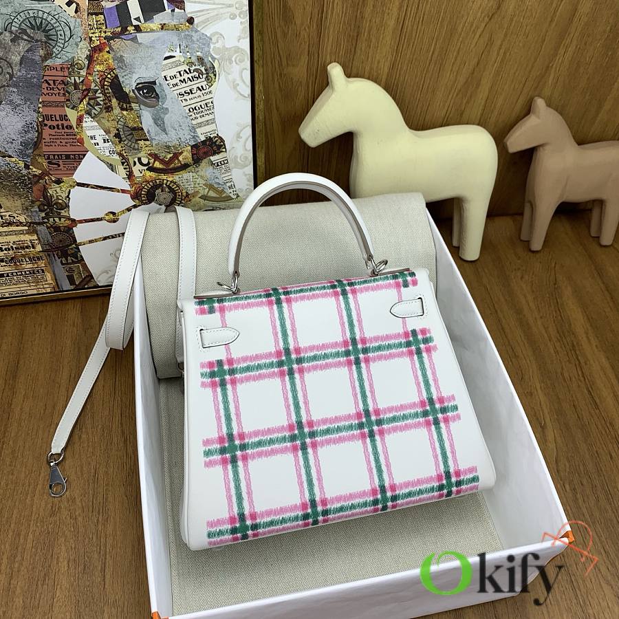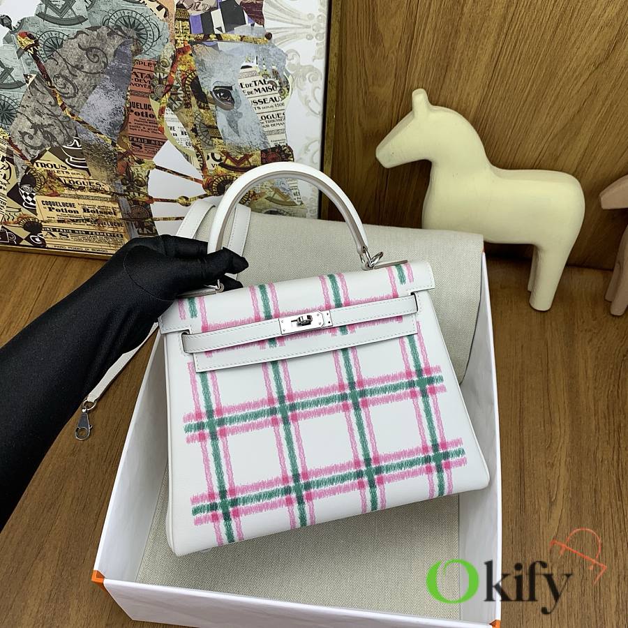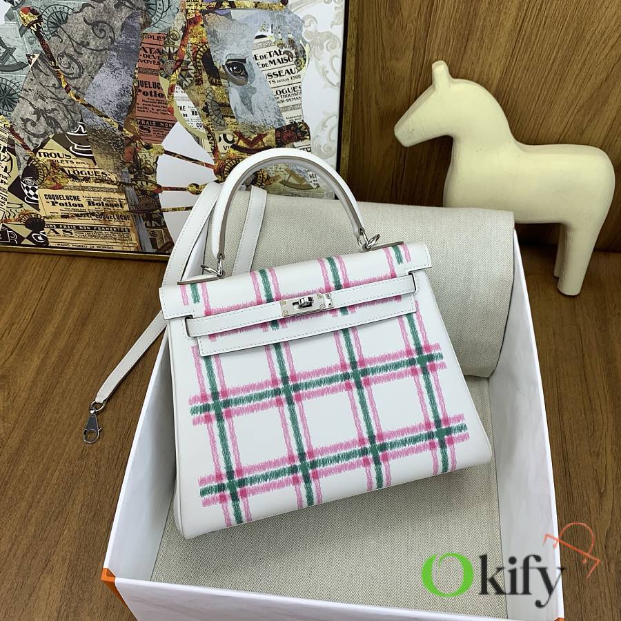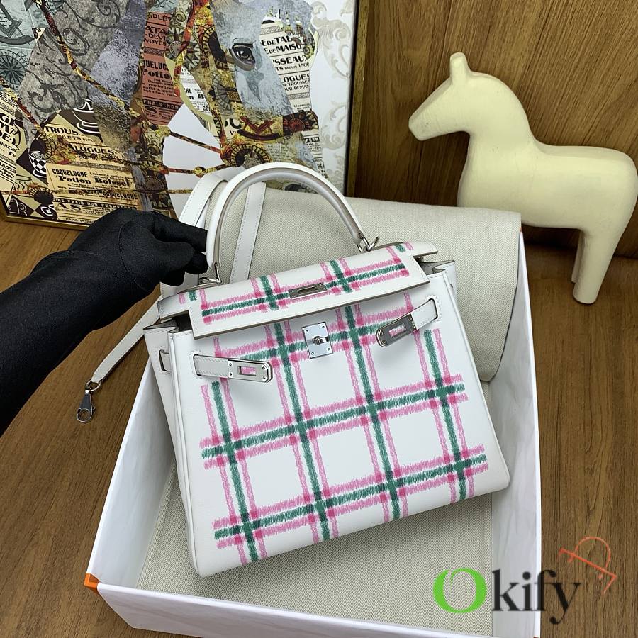 Kelly 25cm Tartan Light White and Pink Green Check Swift Leather Limited Edition Blue Box The new show model kelly25 tartan light uses soft leather inseam Swift or other soft leather with white background makes it easier for designers to express their creativity The use of colors is very clever, pink + green painting plus gradient technique It makes people feel unique, and the white background makes this layer of color seem to be coated with light The combination is very clever, which is also the standard of the blue box limited edition The color matching of this Kelly25 is simply a crit of inspiration from nature! The white base is matched with pink and green plaid, which is as fresh as a freshly picked spring rose And with the aristocratic atmosphere of retro Tartan The collision of the two colors creates a high-end yet not greasy girlish feeling Wearing it on your back will instantly transform you into a fashionable person with both elegance and vitality~ Full marks for collection value!