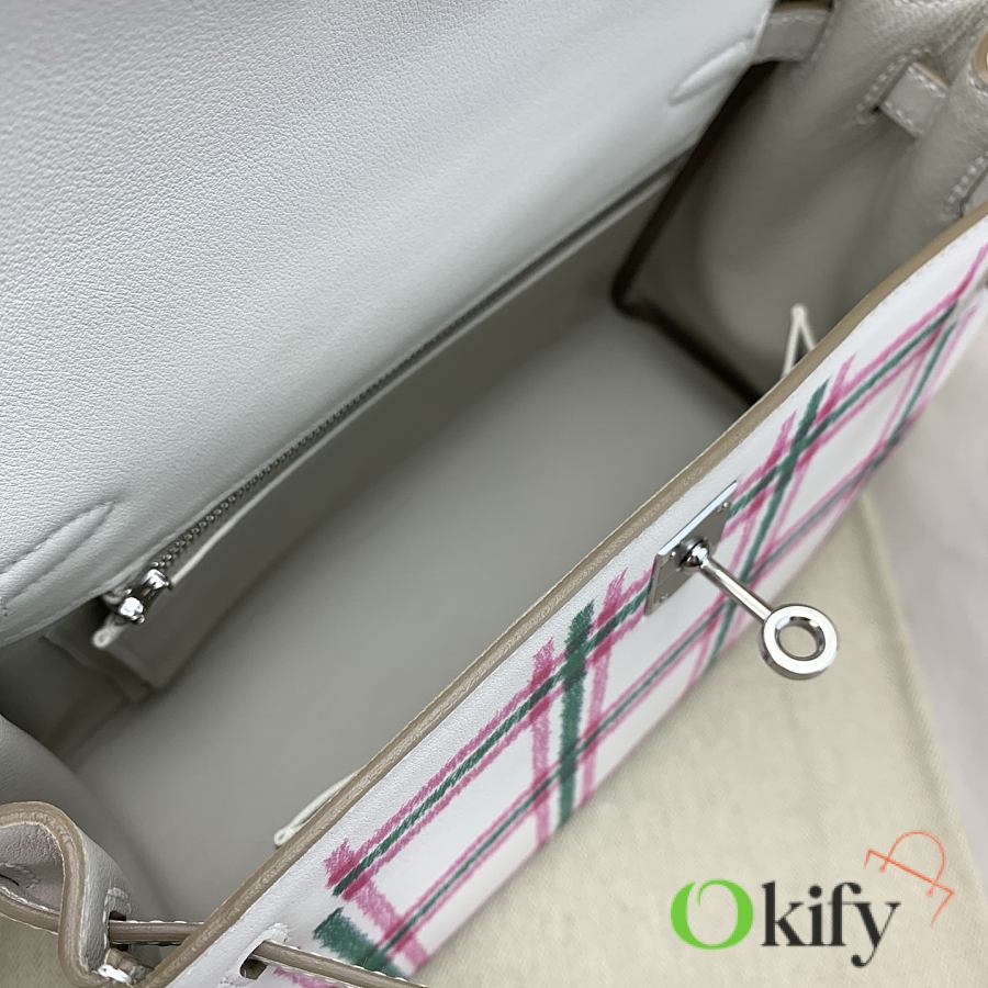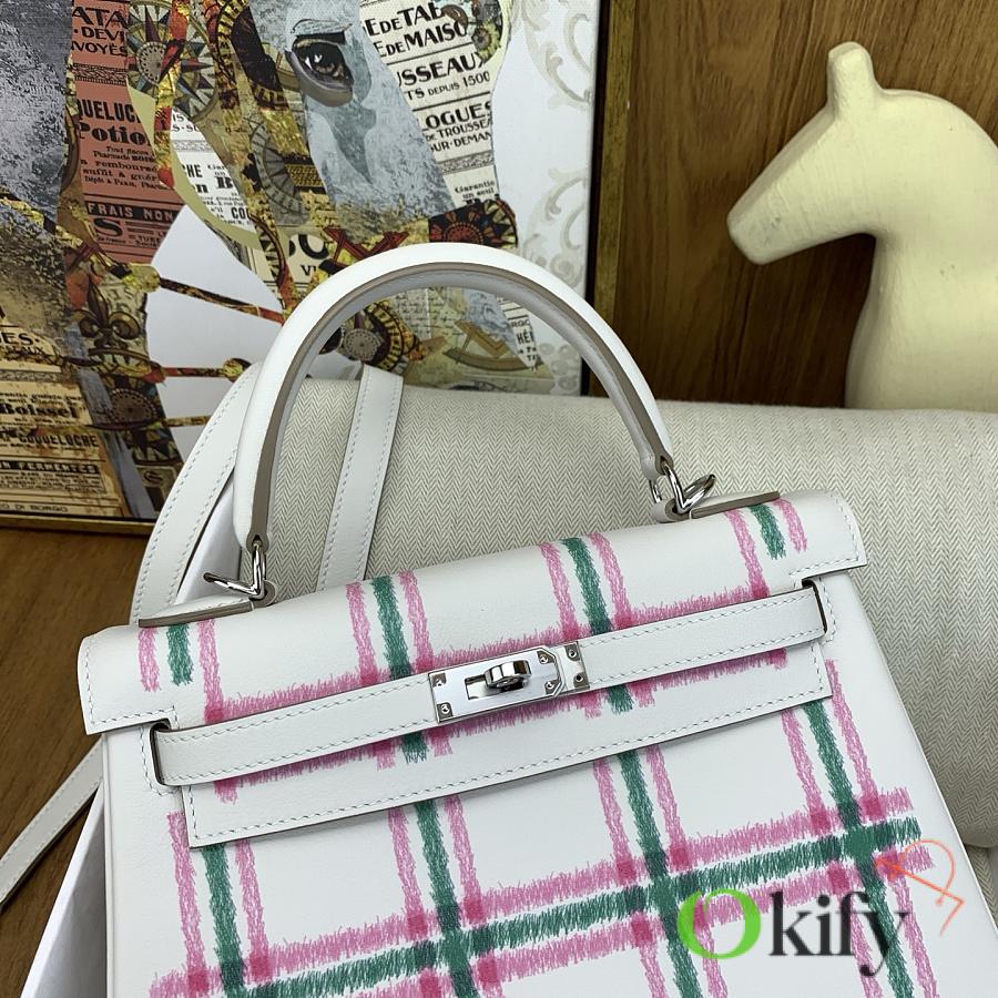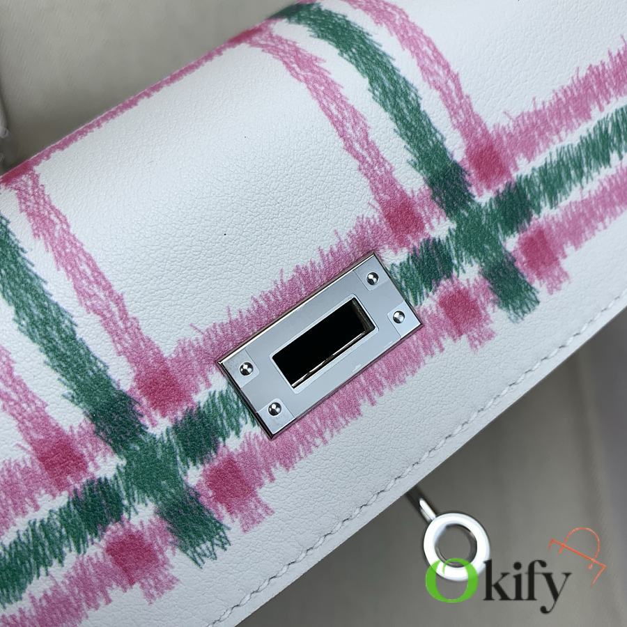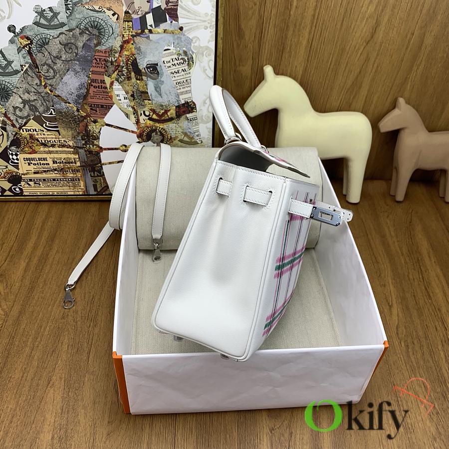 Kelly 25cm Tartan Light White and Pink Green Check Swift Leather Limited Edition Blue Box The new show model kelly25 tartan light uses soft leather inseam Swift or other soft leather with white background makes it easier for designers to express their creativity The use of colors is very clever, pink + green painting plus gradient technique It makes people feel unique, and the white background makes this layer of color seem to be coated with light The combination is very clever, which is also the standard of the blue box limited edition The color matching of this Kelly25 is simply a crit of inspiration from nature! The white base is matched with pink and green plaid, which is as fresh as a freshly picked spring rose And with the aristocratic atmosphere of retro Tartan The collision of the two colors creates a high-end yet not greasy girlish feeling Wearing it on your back will instantly transform you into a fashionable person with both elegance and vitality~ Full marks for collection value!