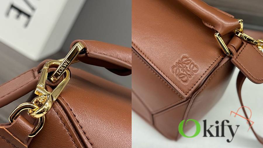 small Nappa lambskin Featherlight Puzzle handbag features a distinctive rectangular shape outlined with geometric lines. The soft, lightweight Nappa leather infuses the bag with a relaxed, effortless style. It can be carried on the shoulder, crossbody, or by hand. Detachable and adjustable shoulder strap with a rotating buckle* Zipper closure with hinged zipper pull One external zippered back pocket, one internal slip pocket* Detachable LOE**WE gold or silver foil tag, featuring a concealed pocket and balloon dice* Rectangular metal feet Nappa lambskin leather lining Anagram embossing, plaque engraved with LOE**WE. size:062502