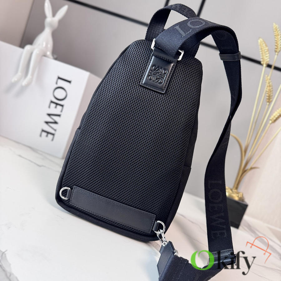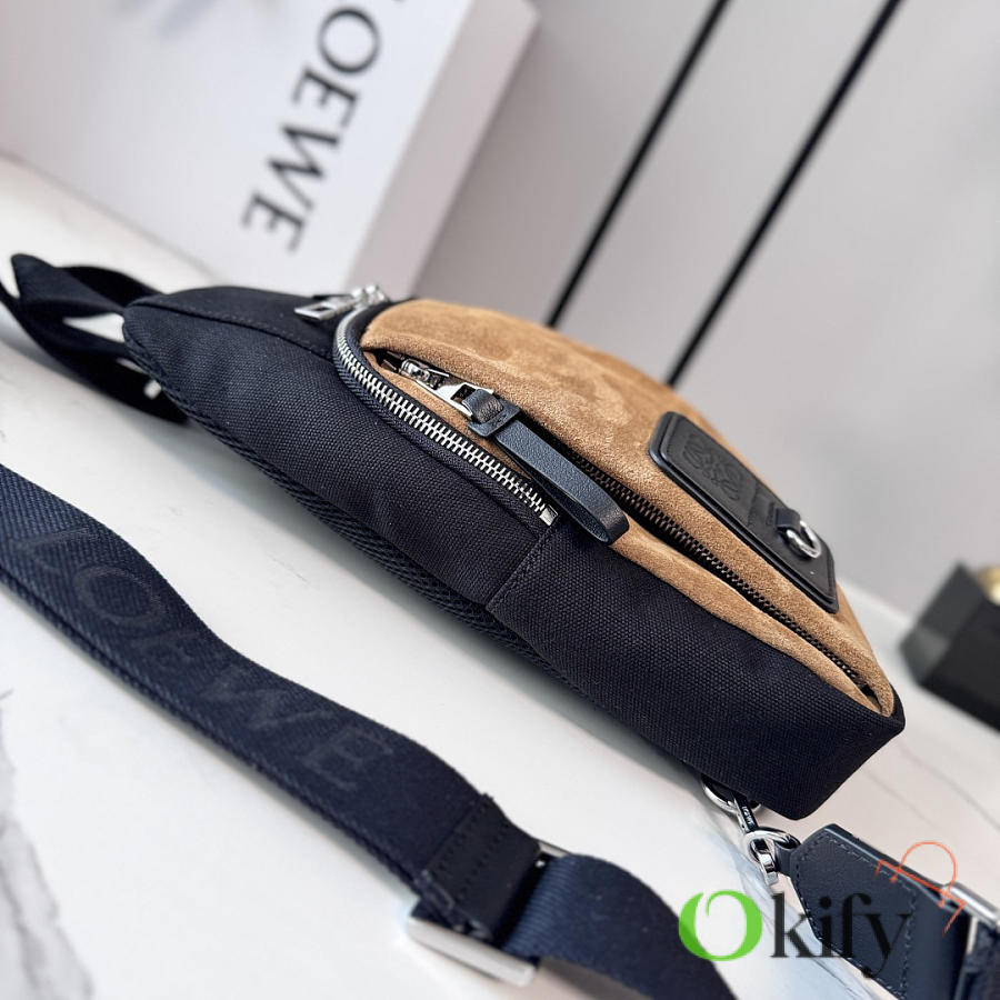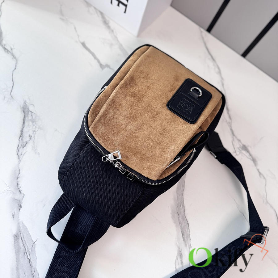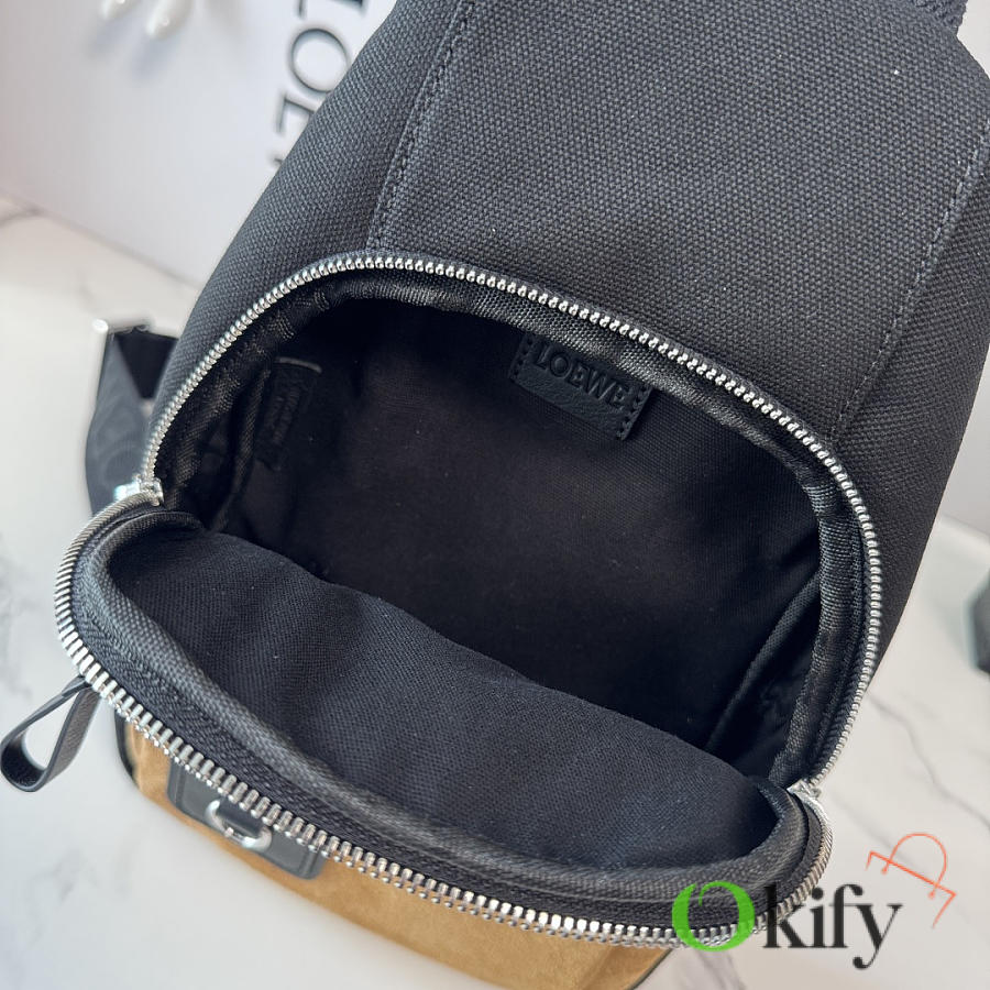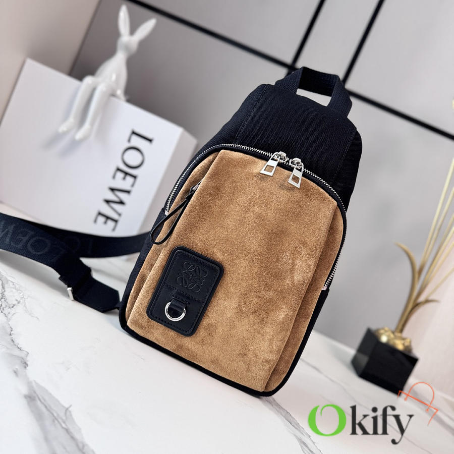 Canvas and Suede Flex Sling bag is a versatile bag with a practical everyday size and sophisticated sporty details. This version is crafted from cotton canvas and suede. It can be worn over the shoulder, crossbody, or carried by hand. It features an adjustable webbing strap, a zip closure, one zippered side pocket, nylon lining, and Anagram embossing. It also includes a D-ring.