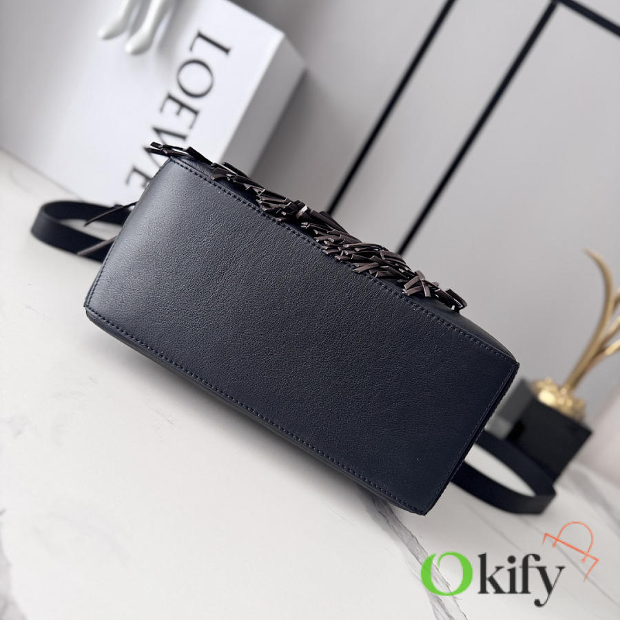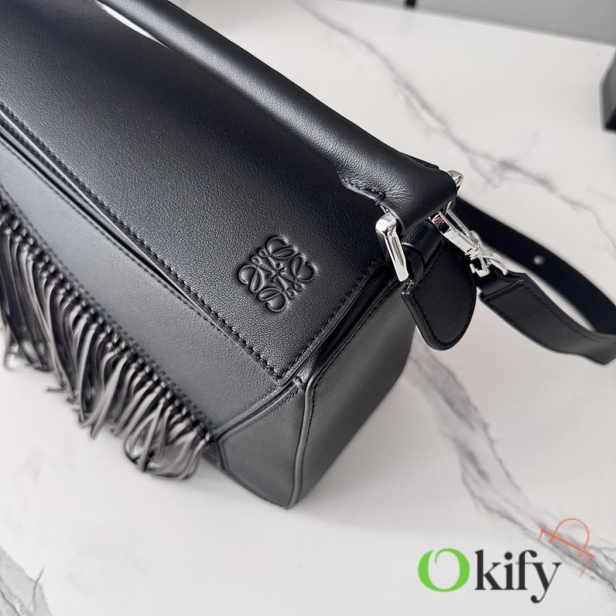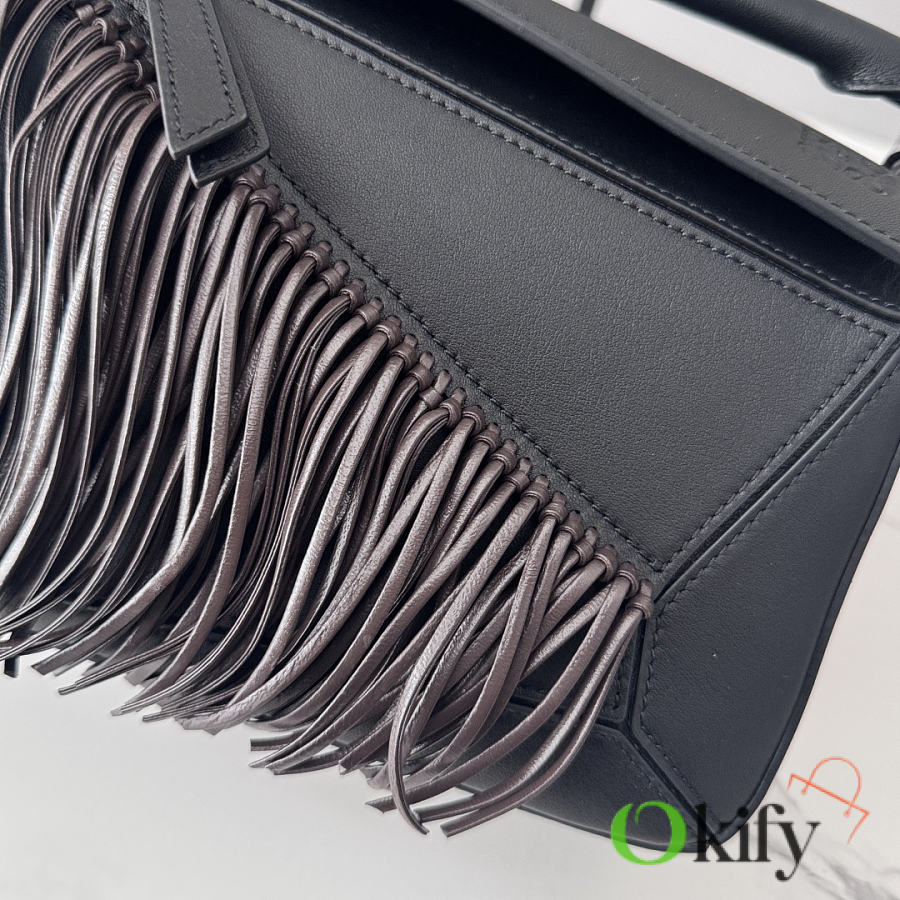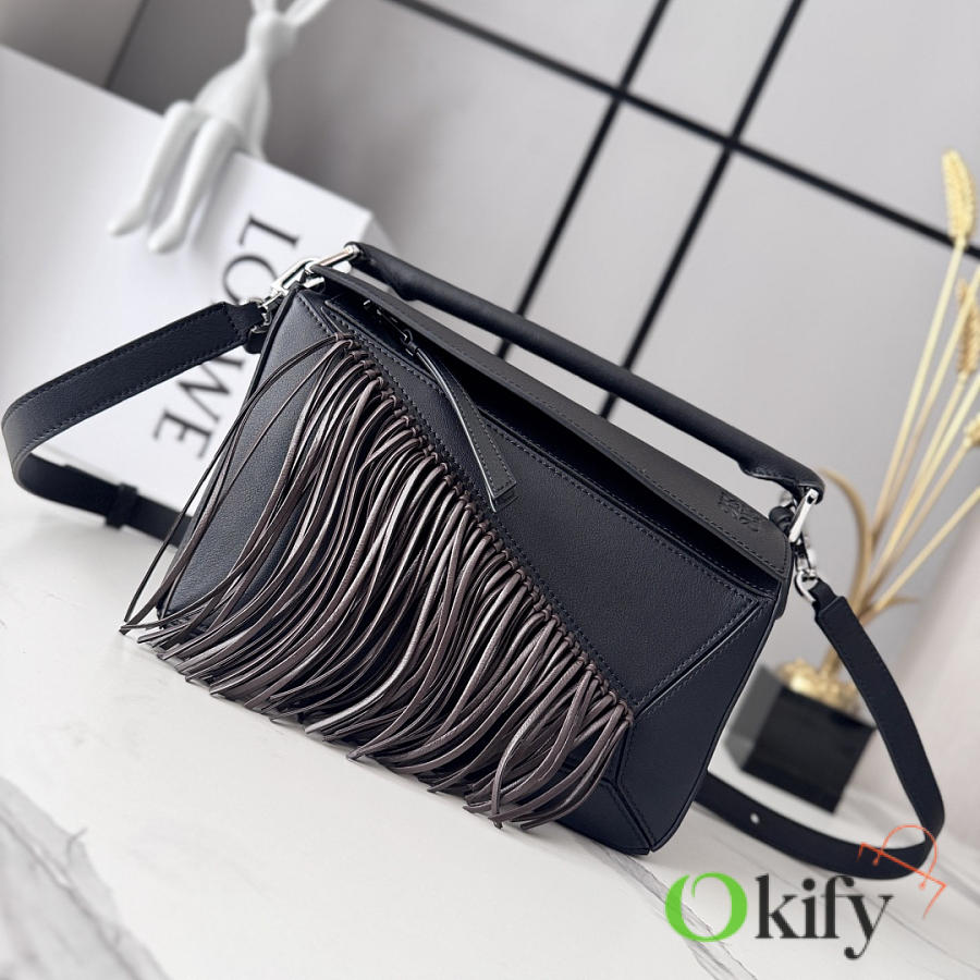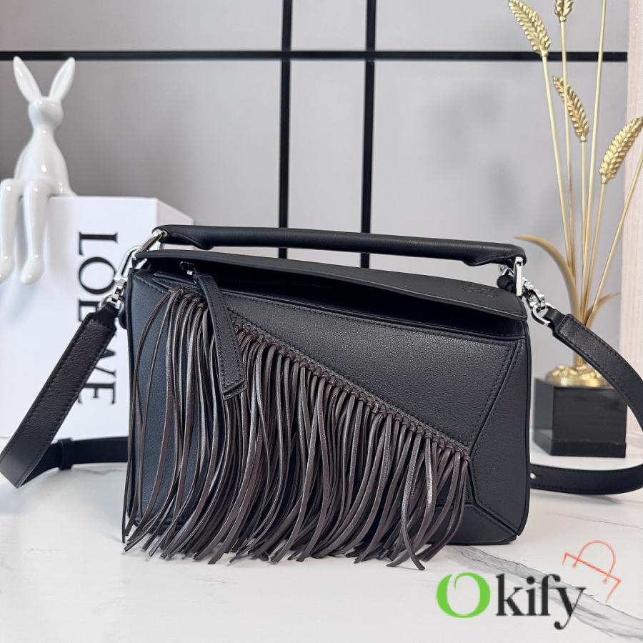 This small version is crafted from classic calfskin and adorned with hand-knotted tassels. This handbag is part of the Lunar New Year collection. The small Puzzle can accommodate, for example, a large wallet, all sizes of mobile phones and sunglasses. It can be worn over the shoulder or crossbody.