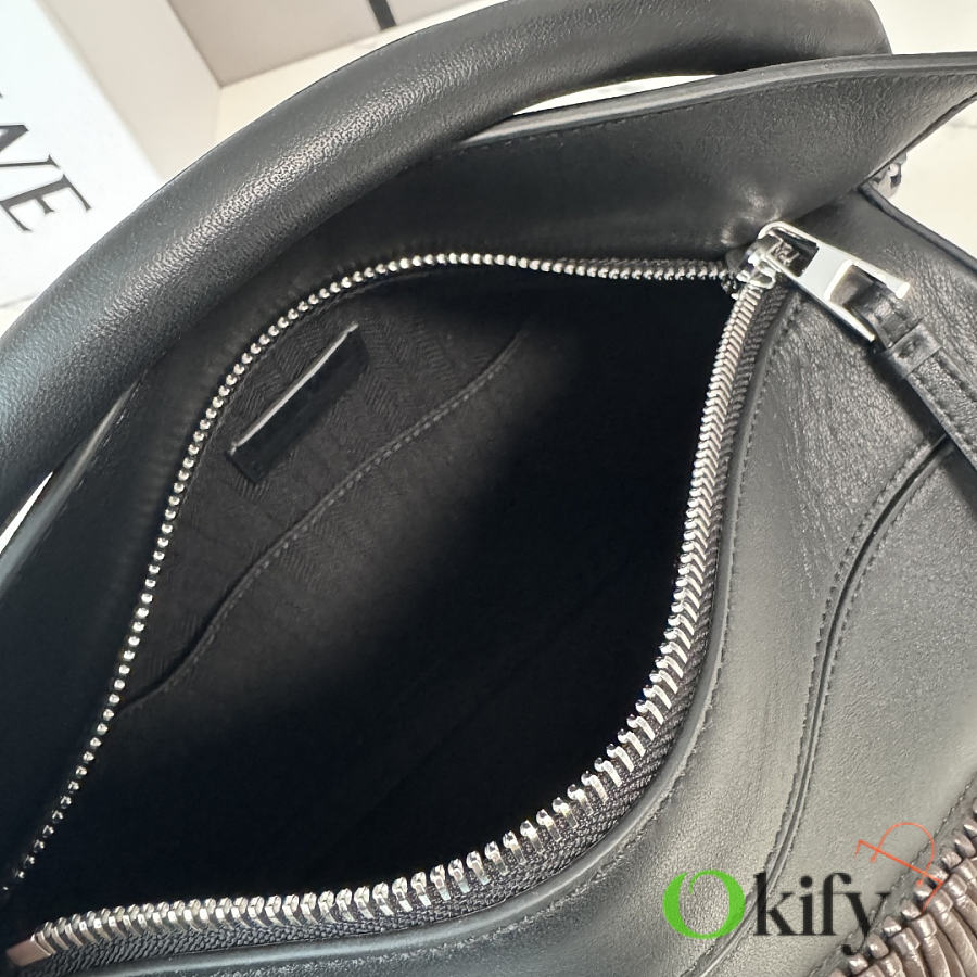 * Zipper closure with calfskin zipper pulls.