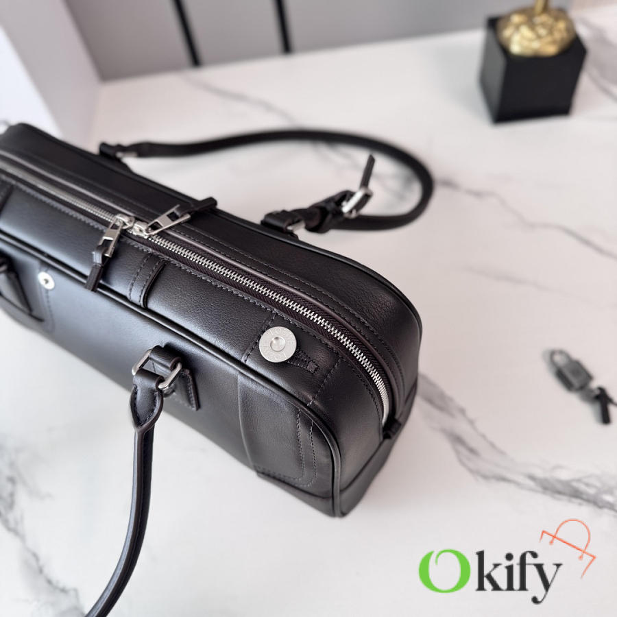 The Panta Amazona Cropped handbag in glossy calfskin leather presents a classic silhouette with the iconic padlock design. This reinterpretation features a slender bowling bag shape with long handles for easy shoulder carrying. lining*Anagram embossing