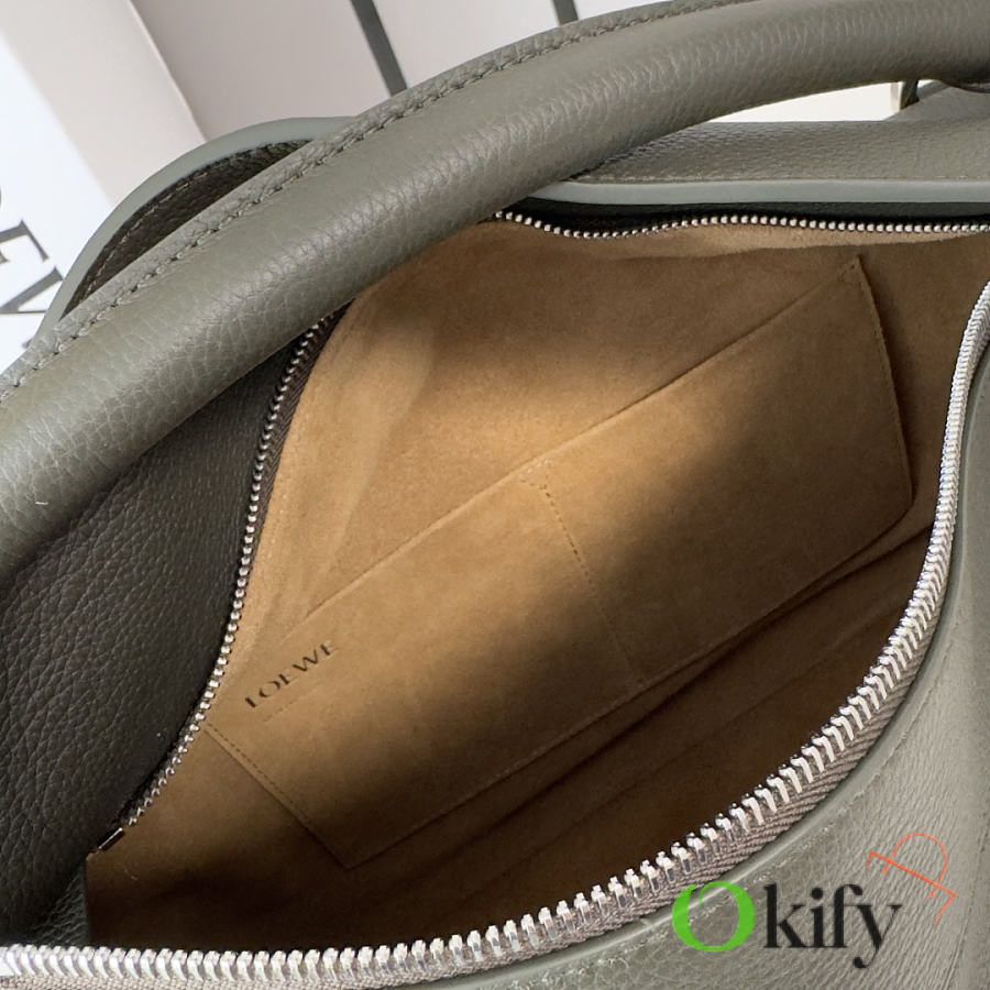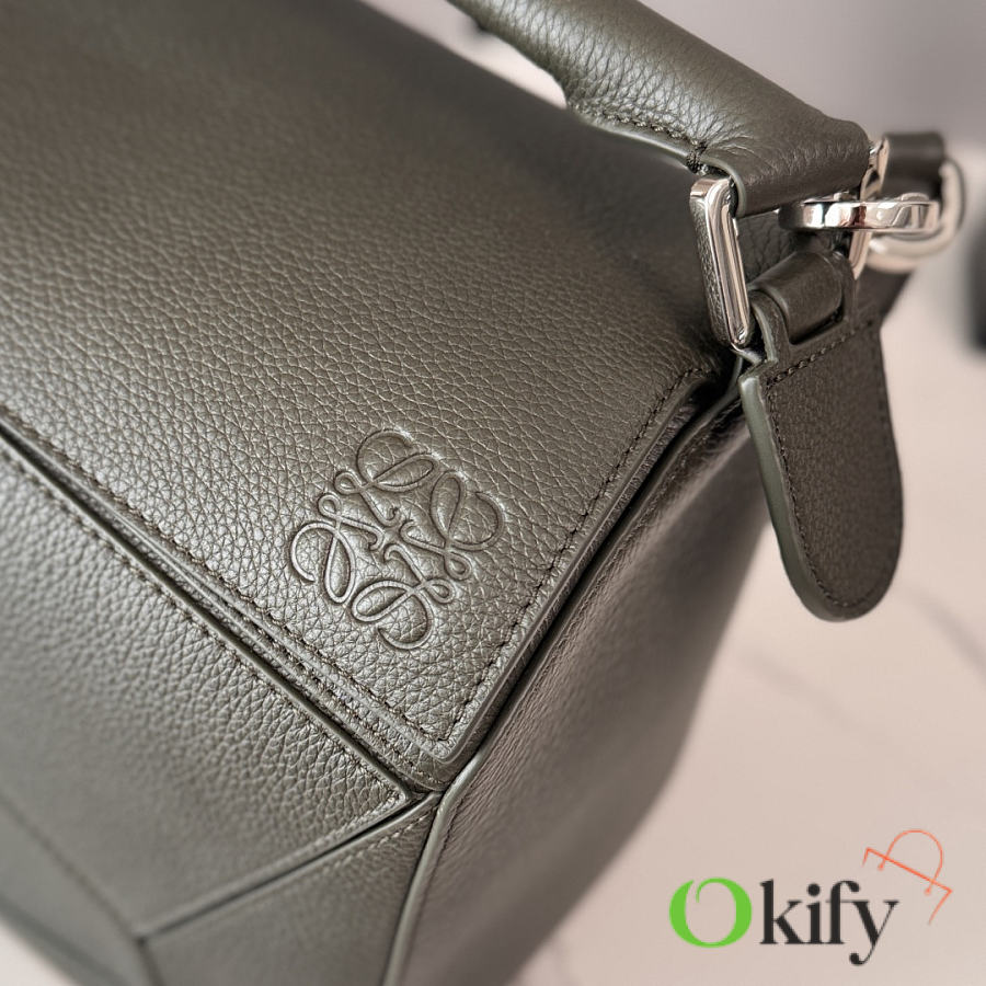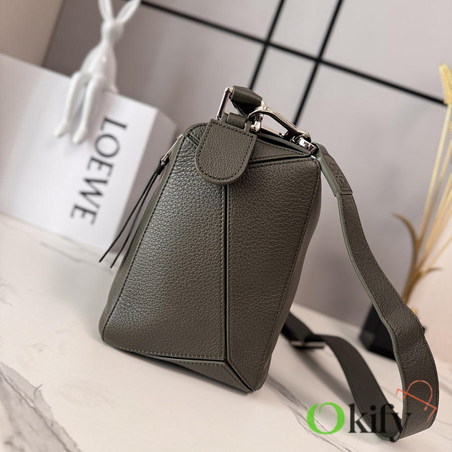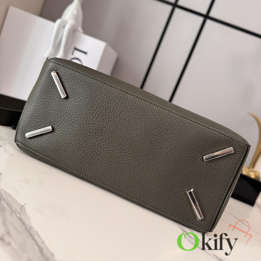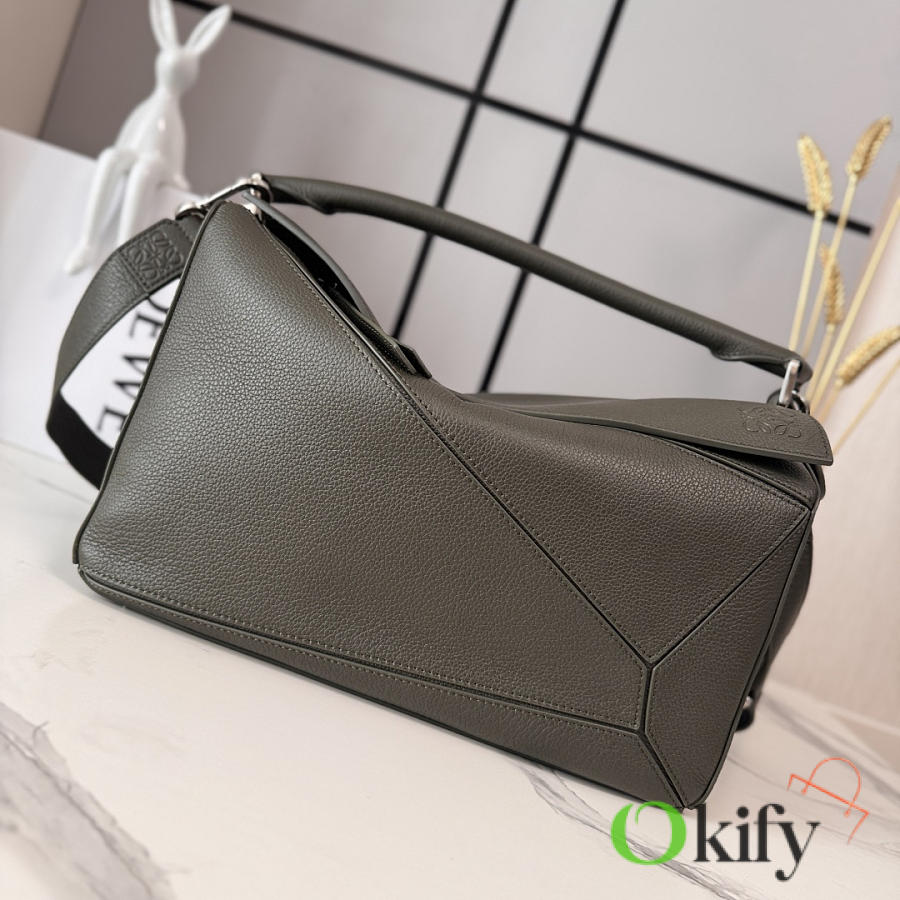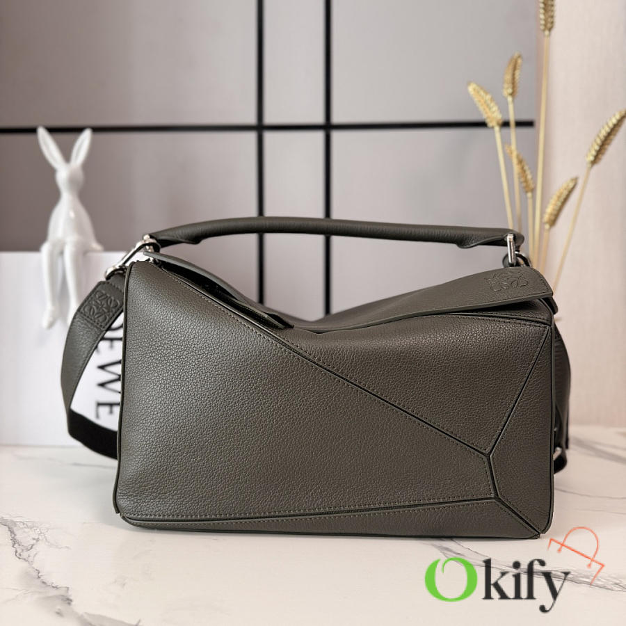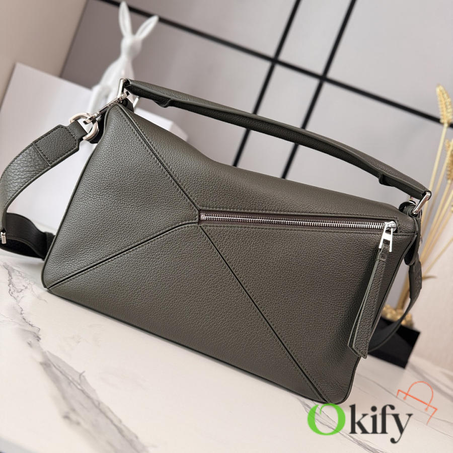 Large Soft Deerskin Puzzle Handbag with a distinctive geometric rectangular shape. This large version is made of deerskin leather and can be carried on the shoulder, crossbody, or by hand. It features a detachable and adjustable shoulder strap, a zip closure with cowhide zipper pulls, one external zippered back pocket, two internal slip pockets, and a suede lining with Anagram embossing. Model :052446