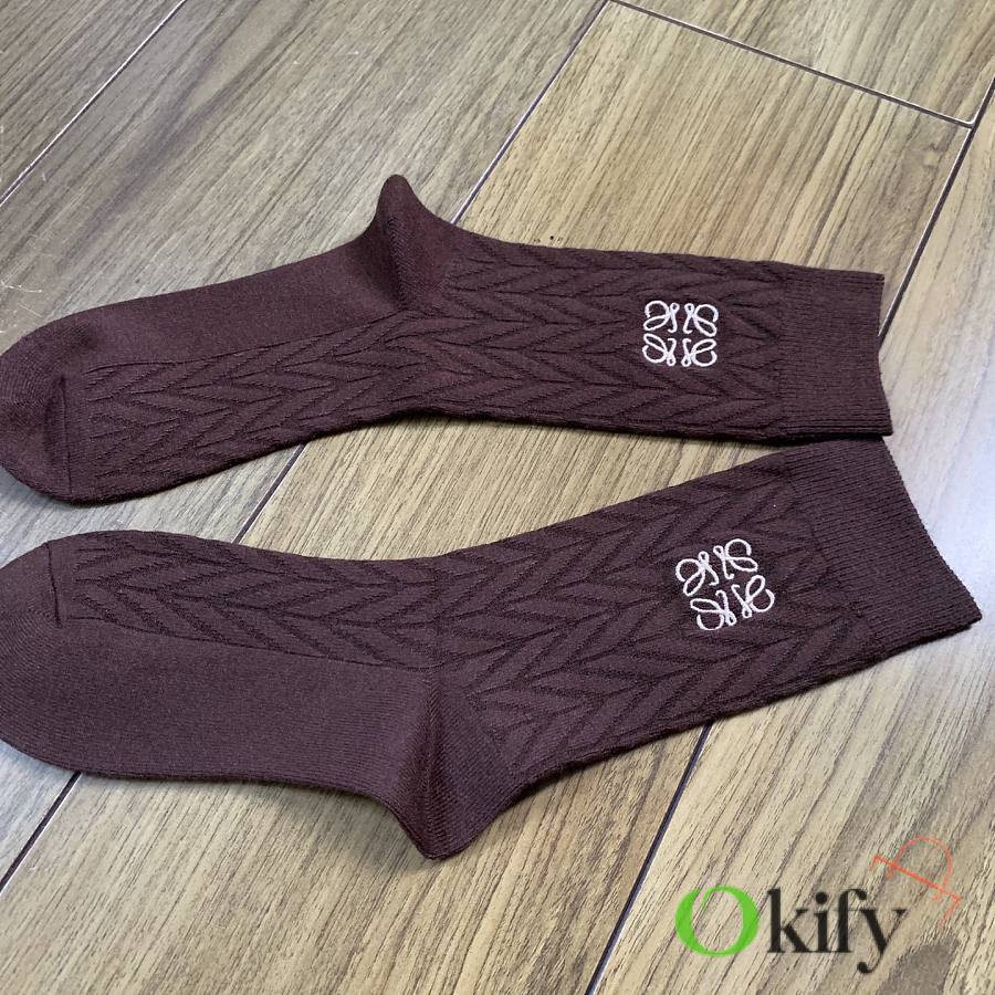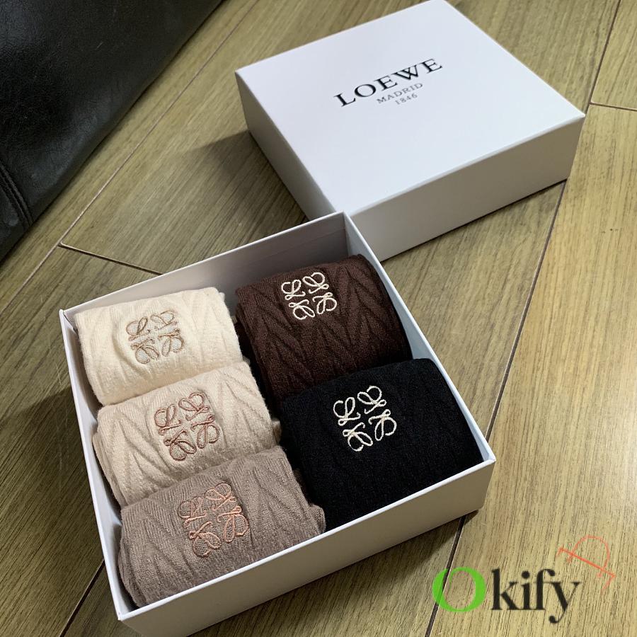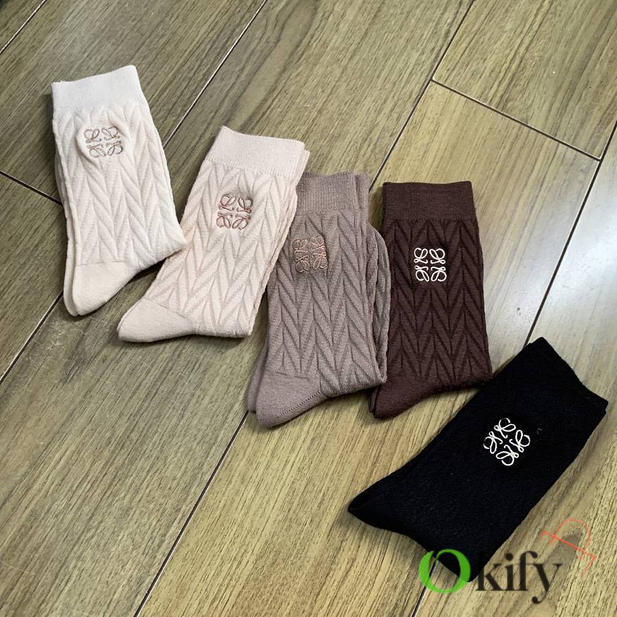 Loewe Autumn/Winter New Embroidered Letter Cashmere Mid-Calf Socks. Brown has always been a dominant color in autumn and winter. We can use different shades and saturations of brown to create a very sophisticated and stylish look, giving off a comfortable, warm, and elegant feel! Mixed styles, 5 pairs gift box.