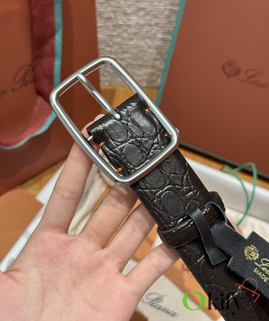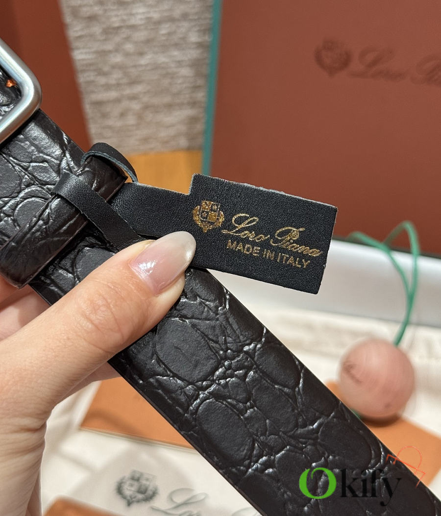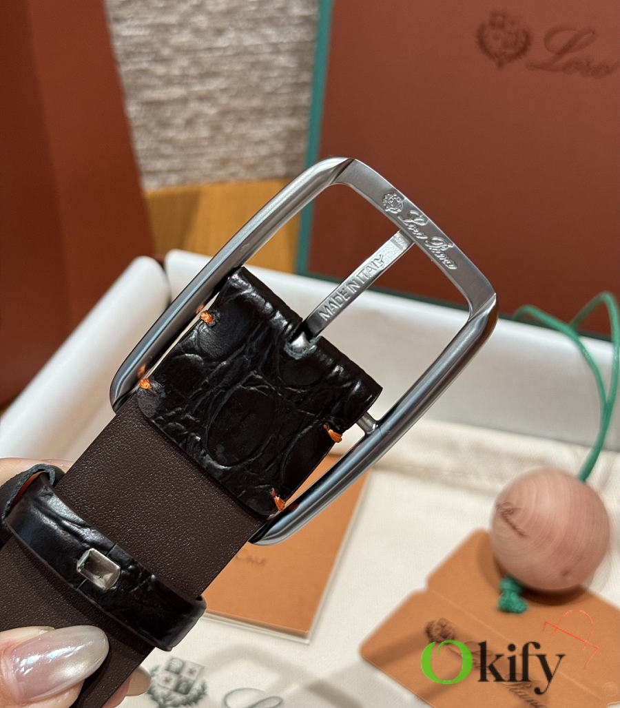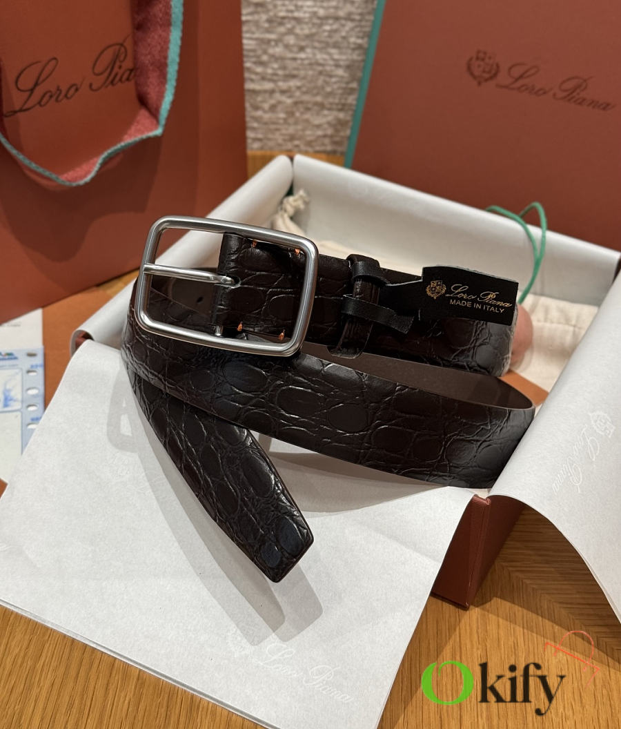 This belt features clean lines and a refined square buckle. The leather has a faux crocodile embossed finish with a silky-smooth matte effect, making it ideal for sophisticated outfits. It features a palladium-plated metal square buckle with the Loro Piana logo.
