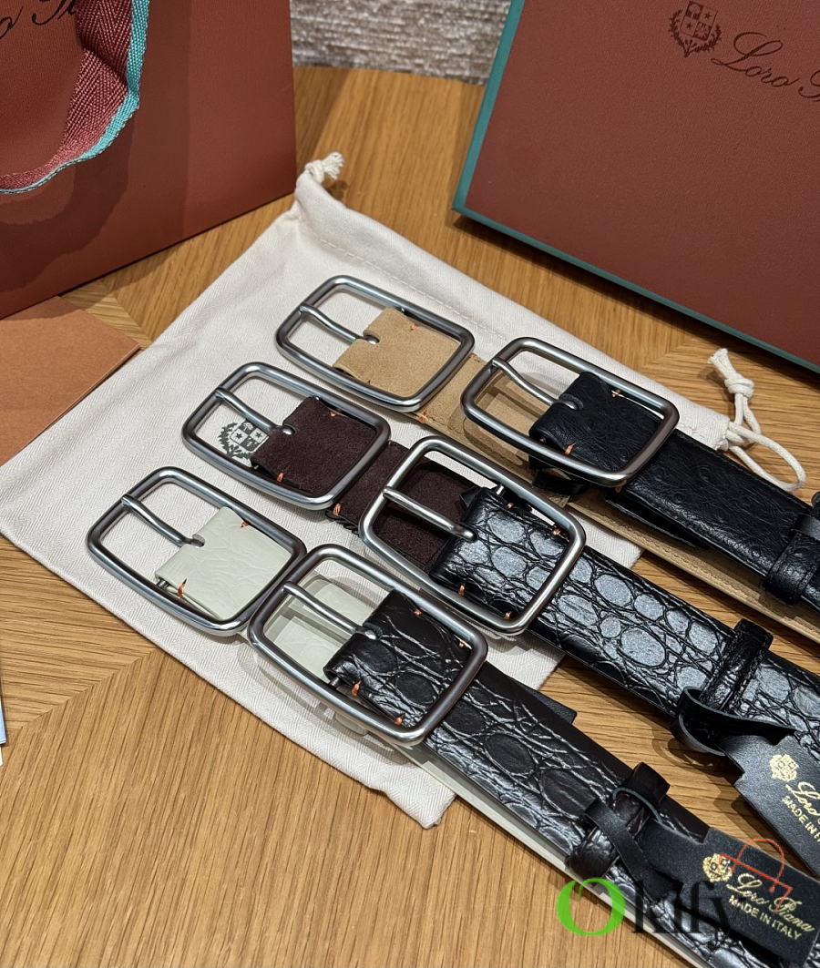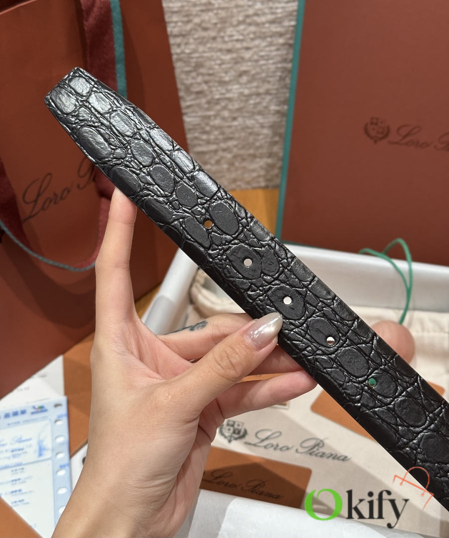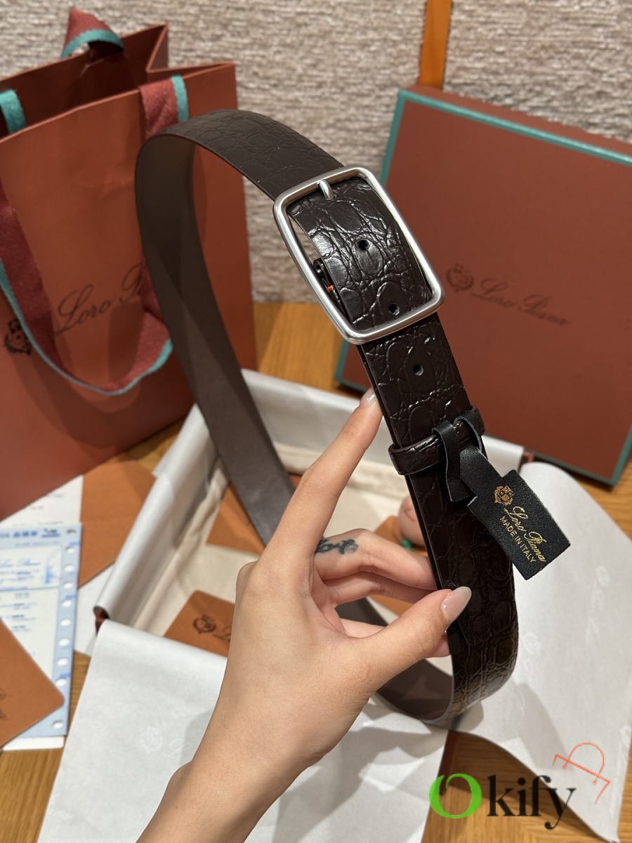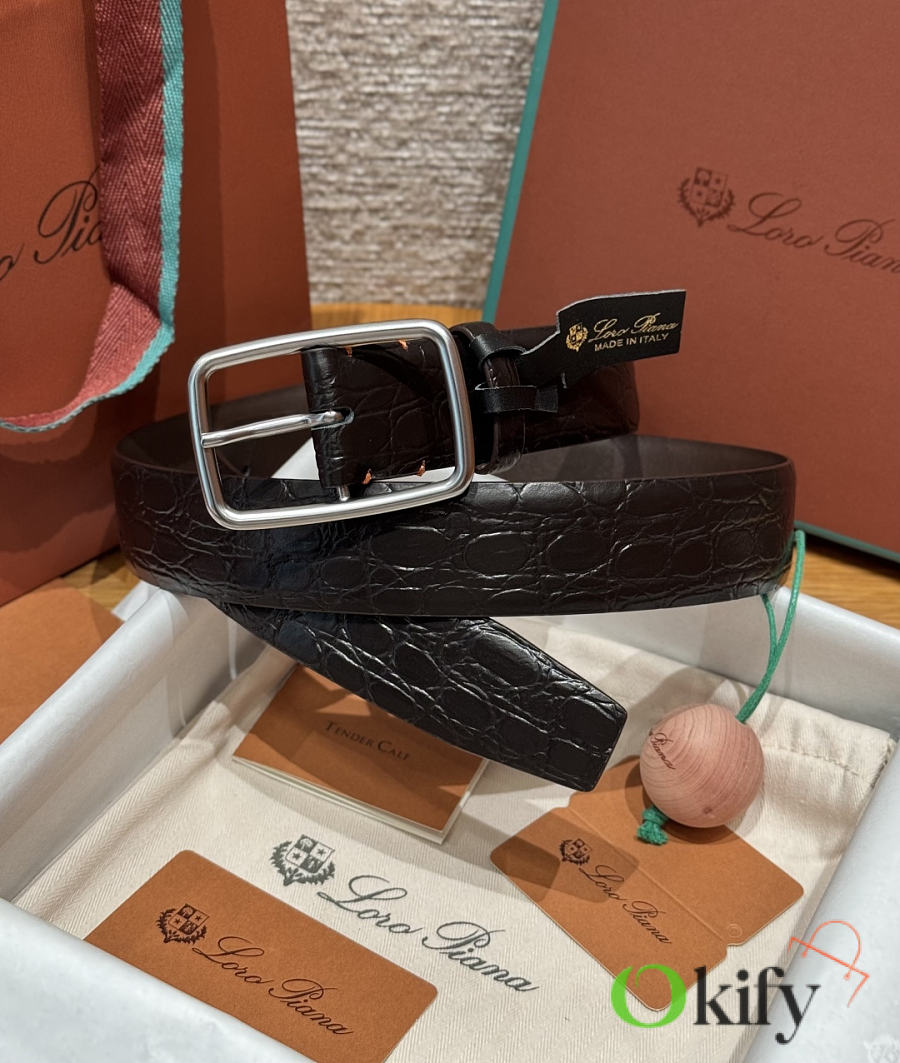 This belt features clean lines and a refined square buckle. The leather has a faux crocodile embossed finish with a silky-smooth matte effect, making it ideal for sophisticated outfits. It features a palladium-plated metal square buckle with the Loro Piana logo.