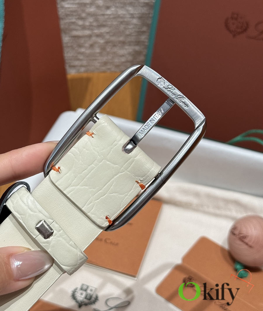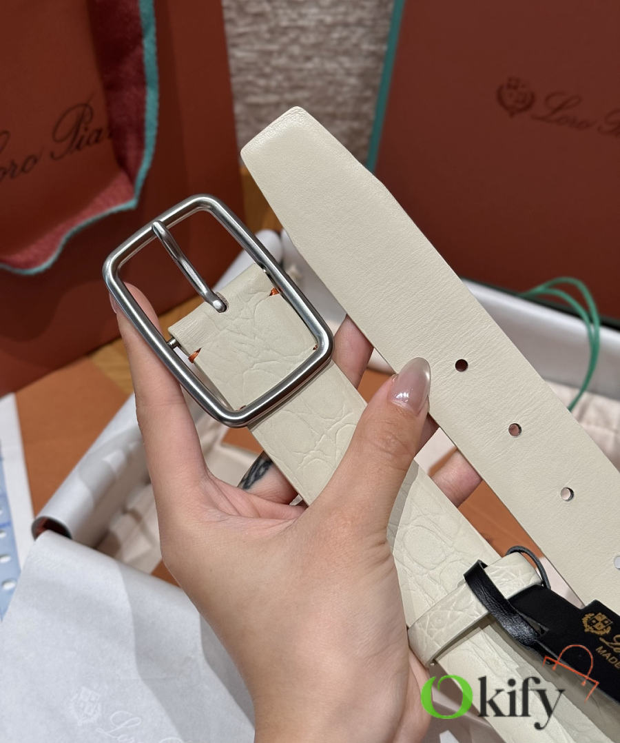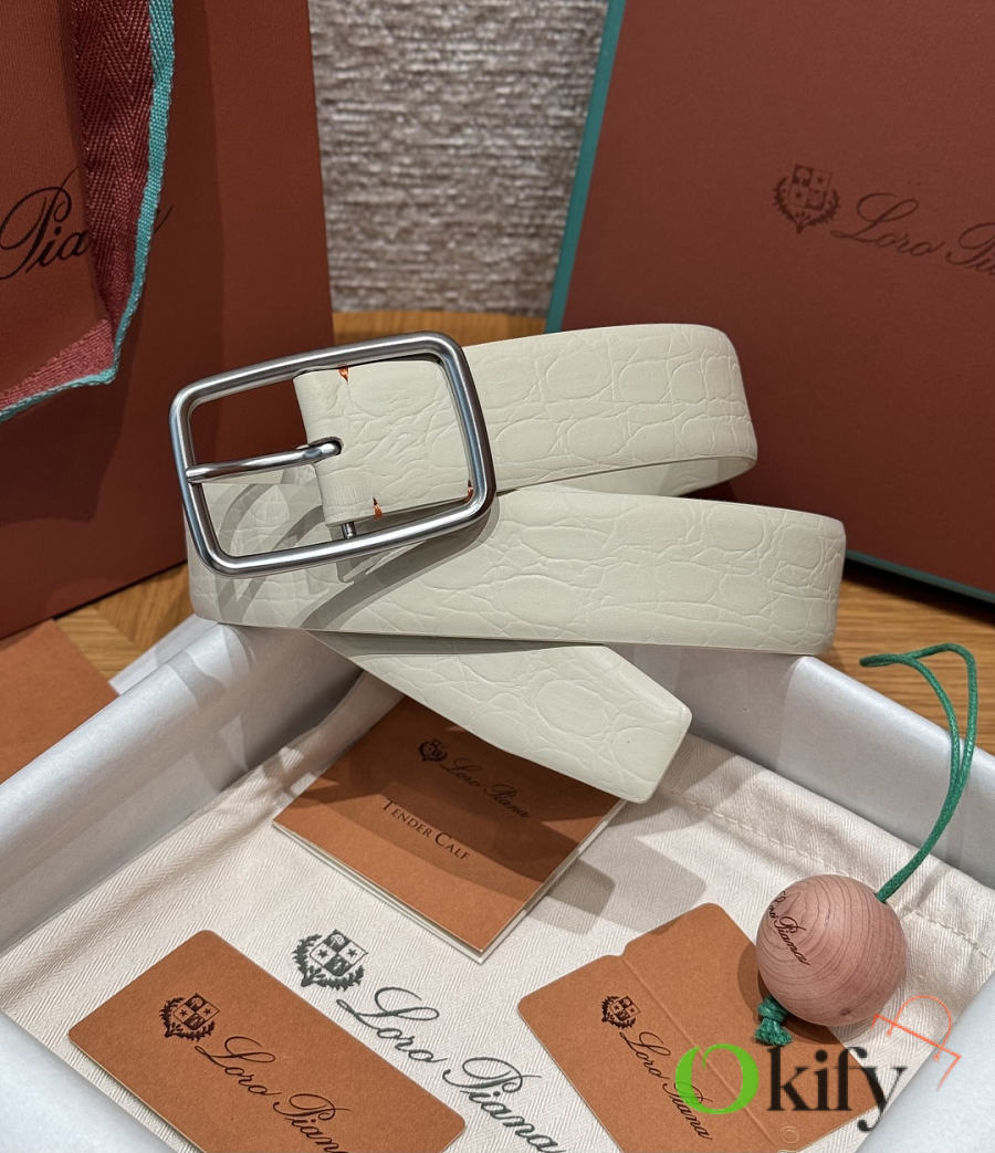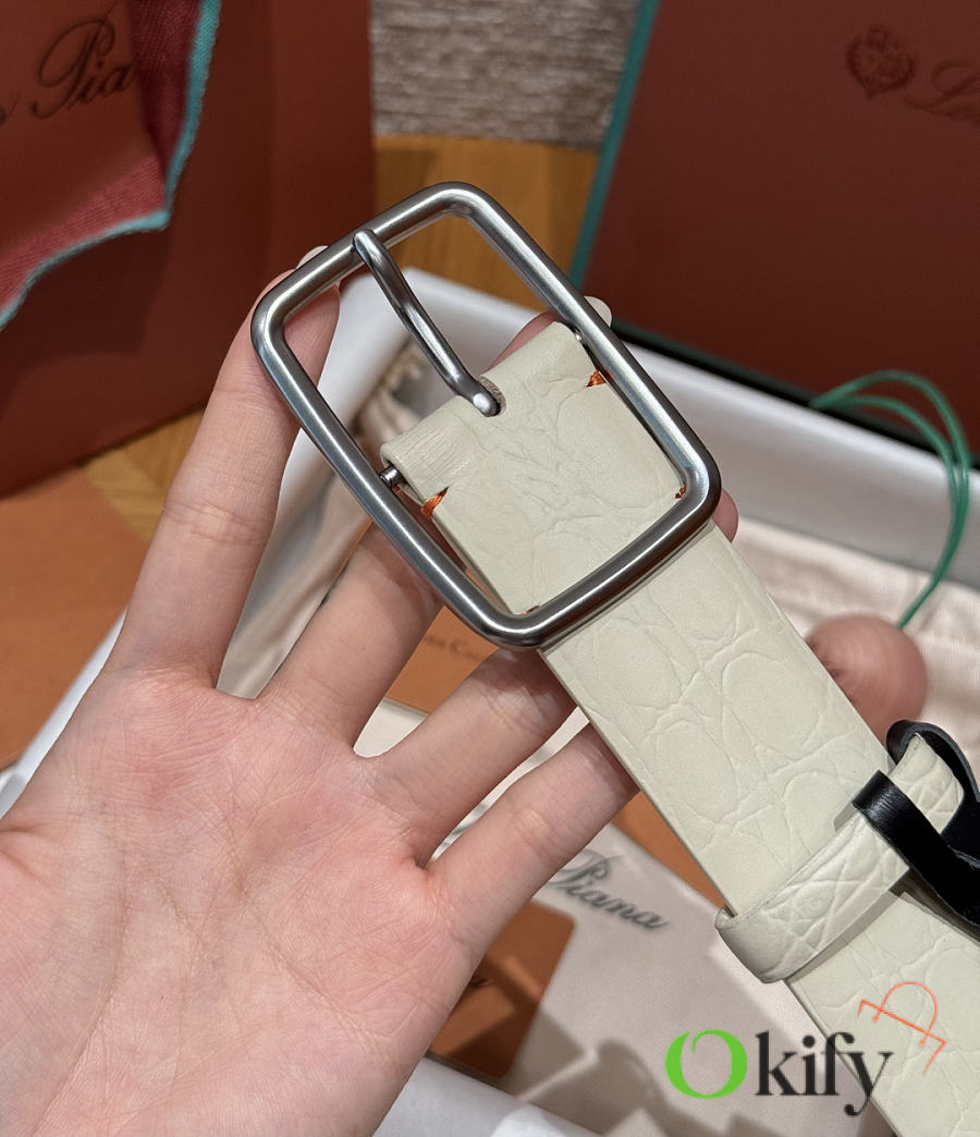 This belt features clean lines and a refined square buckle. The leather has a faux crocodile embossed finish with a silky-smooth matte effect, making it ideal for sophisticated outfits. It features a palladium-plated metal square buckle with the Loro Piana logo
