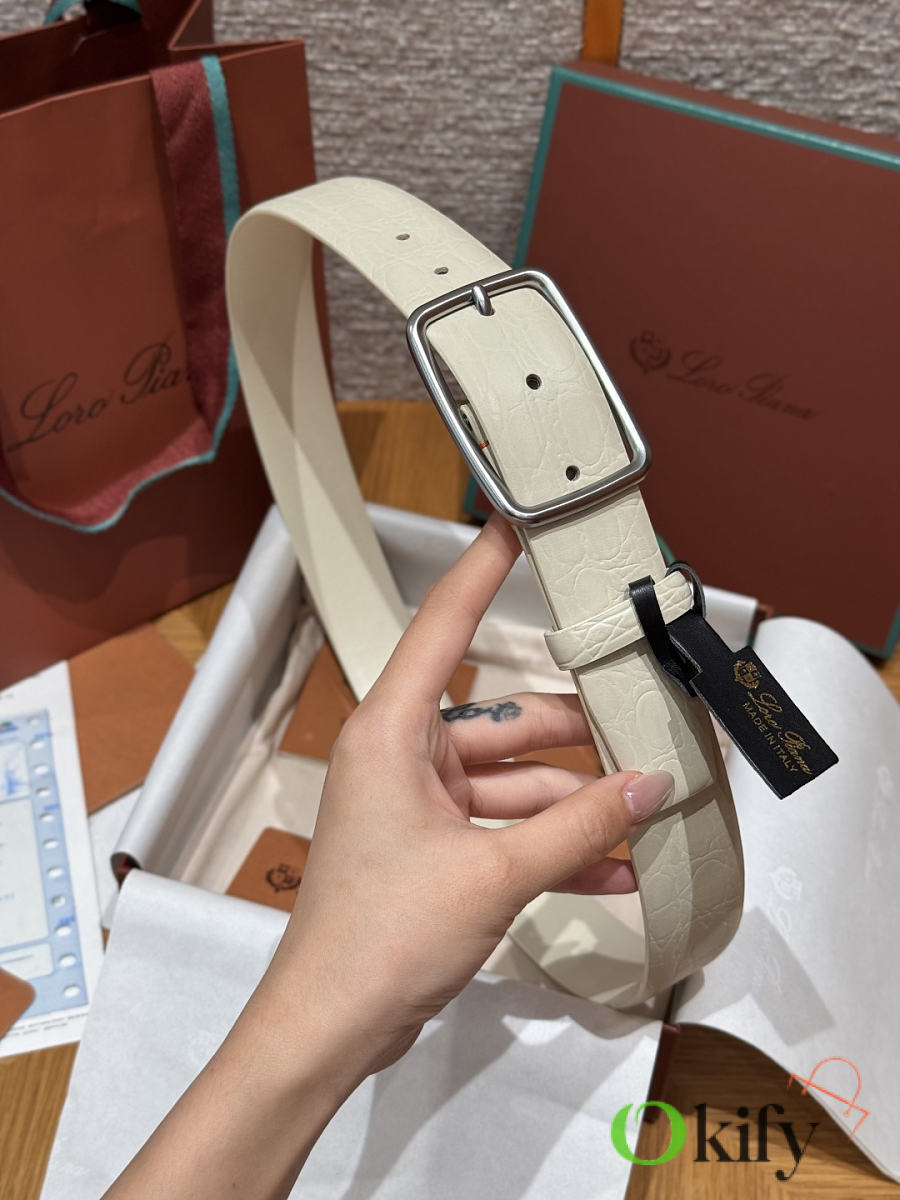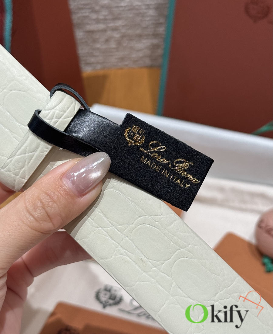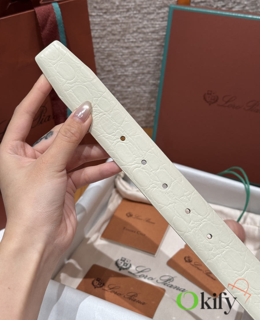 This belt features clean lines and a refined square buckle. The leather has a faux crocodile embossed finish with a silky-smooth matte effect, making it ideal for sophisticated outfits. It features a palladium-plated metal square buckle with the Loro Piana logo