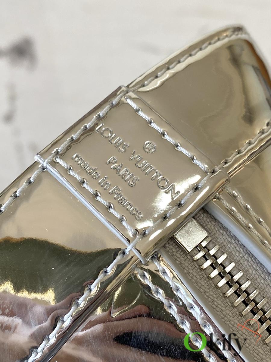 showcases the LV Ski series' style with this season's technological details. The Monogram Miroir weather-resistant canvas is dyed in a Silver hue, paired with tonal metal hardware for a dazzling finish. It adds a touch of retro-futuristic flair to any outfit. An LV logo padlock and a detachable shoulder strap complete the look.