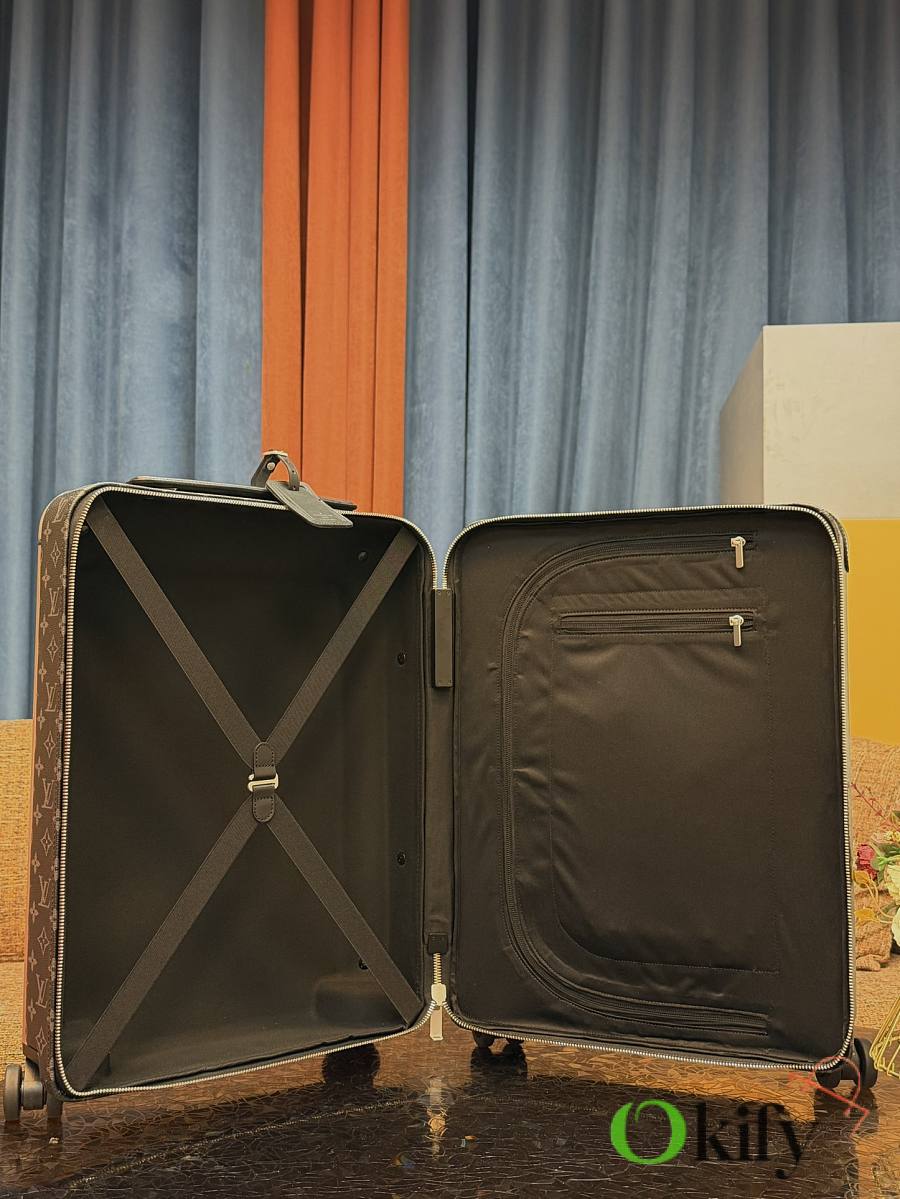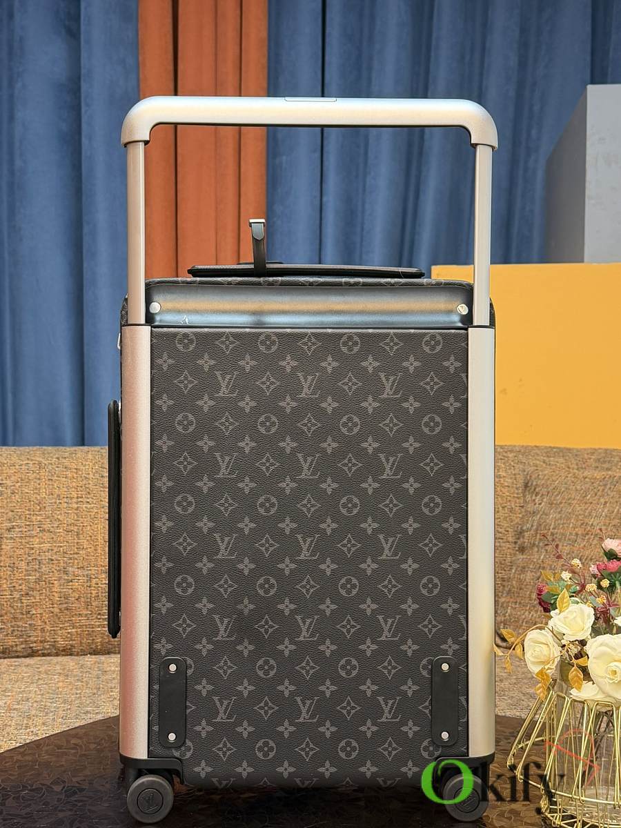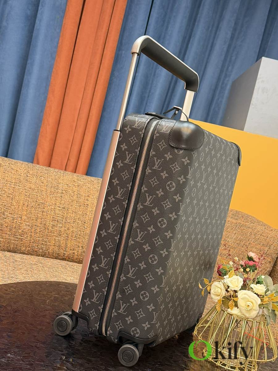 Dimensions: 50cm (H) x 36cm (W) x 18cm (D) (Carry-on). The Louis Vuitton Horizon series four-wheeled suitcase is a refreshed version of the brand's classic travel trunk. It incorporates striking lemon-yellow leather corner trim and a pull handle design on the iconic Monogram canvas, combining retro appeal with modern vitality. The suitcase features 360° silent spinner wheels and a multi-position adjustable pull handle, ensuring durability while making travel smoother and more effortless—a perfect choice for travelers who value individuality and quality. Material Introduction • Main fabric: Monogram coated canvas, with a durable pure cotton canvas base and a waterproof and stain-resistant monogram coating. It is tough, easy to clean, and the iconic pattern is highly recognizable. • Corner and handle trim: Black Taurillon calfskin, soft and supple to the touch, highly durable, providing shock protection for the case while brightening the overall look with its vibrant color. • Core components: Aviation-grade aluminum alloy pull rod with multiple adjustable positions to accommodate different heights; silent universal wheels made of highly elastic and wear-resistant material for smooth and silent pushing and pulling; paired with a brand-exclusive TSA combination lock, balancing security and ease of use.