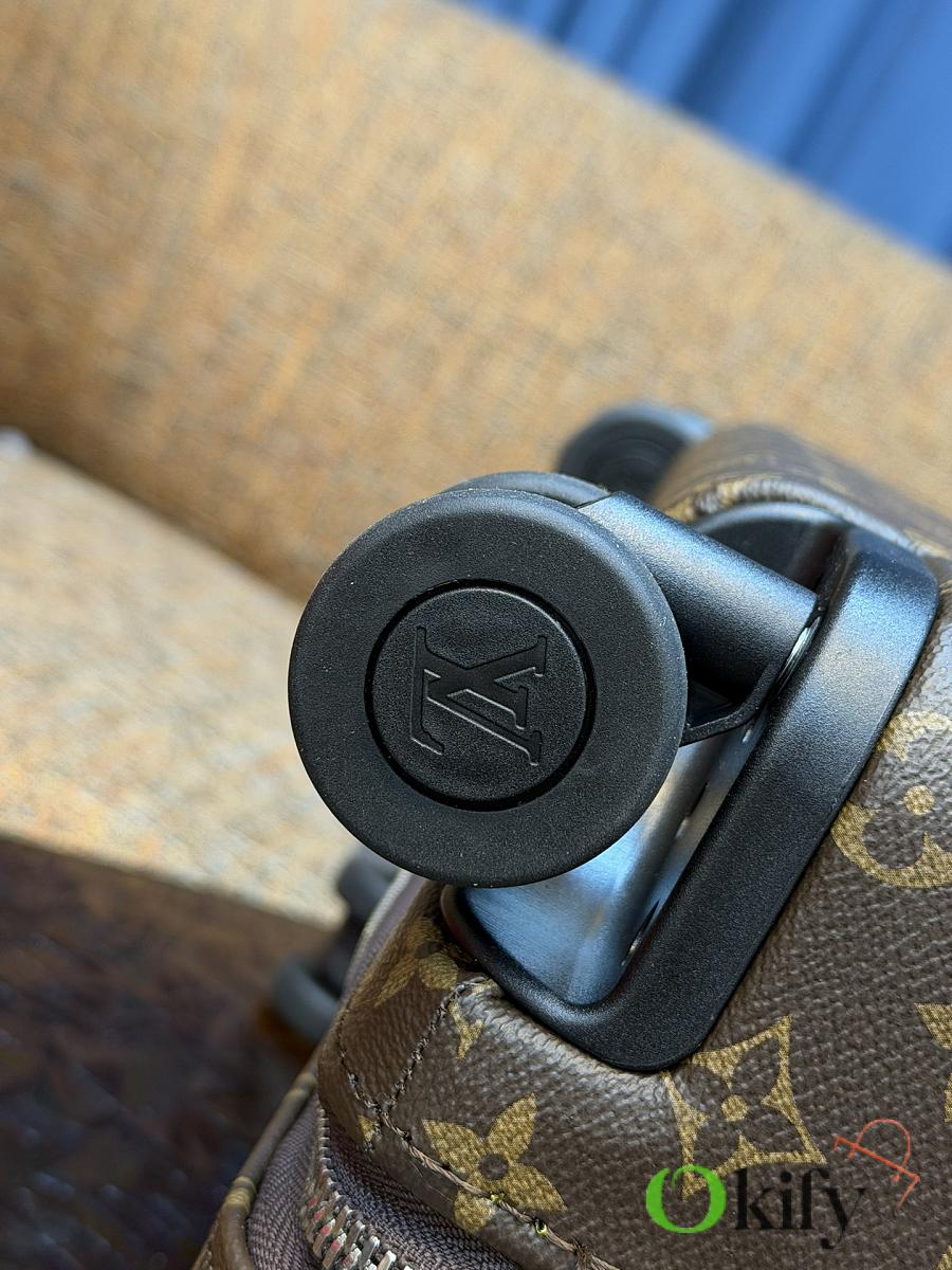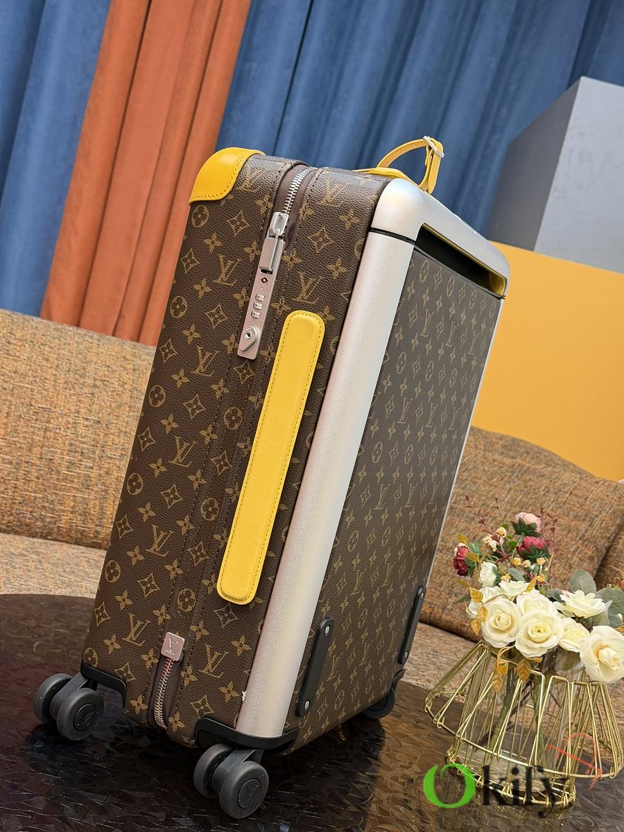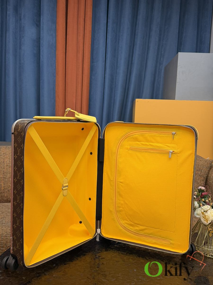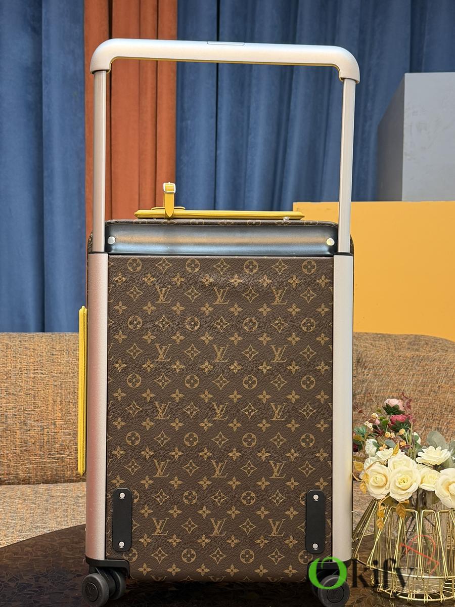 Dimensions: 50cm (H) x 36cm (W) x 18cm (D) (Carry-on) The Louis Vuitton Horizon series four-wheeled suitcase is a refreshed version of the brand's classic travel trunk. It incorporates striking lemon-yellow leather corner protectors and a pull handle design on the iconic Monogram canvas, combining retro recognizability with modern vitality. The suitcase features 360° silent universal wheels and a multi-position adjustable pull handle, ensuring durability while making travel smoother and lighter – a desirable choice for travelers who value individuality and quality.