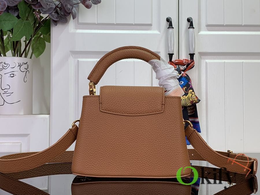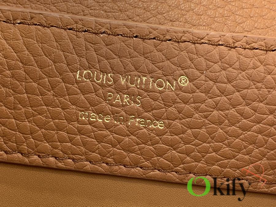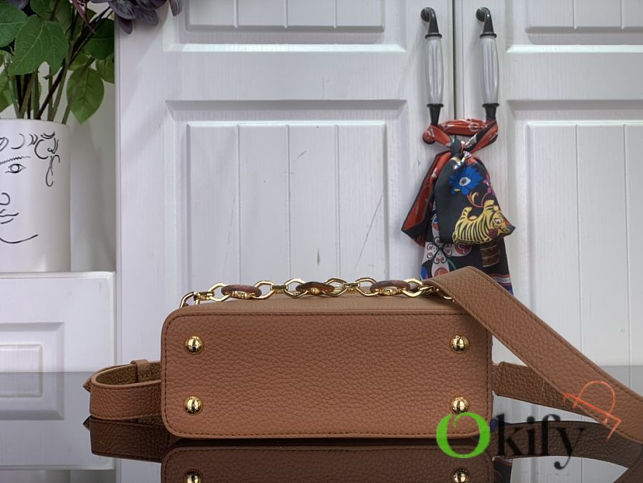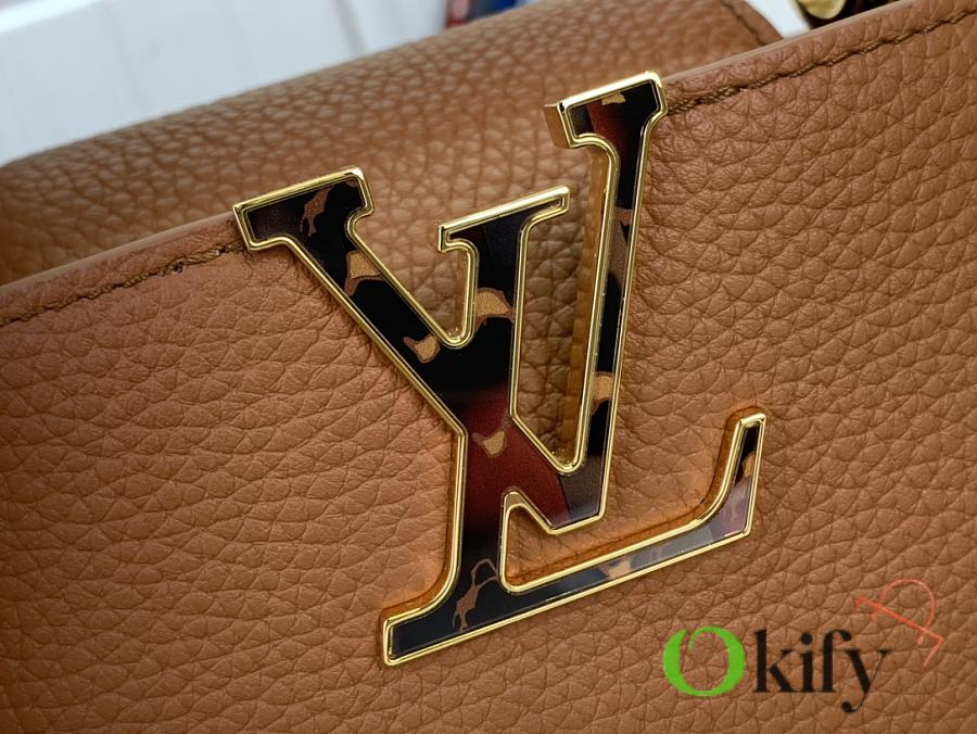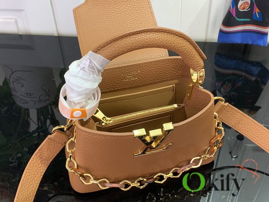This Capucines mini handbag draws inspiration from the Harmony collection, using a beautiful chain to tell the story of the Monogram flower. The Taurillon calfskin body is adorned with a resin-coated LV logo, and the flap can be opened to reveal a neat interior with multiple pockets.