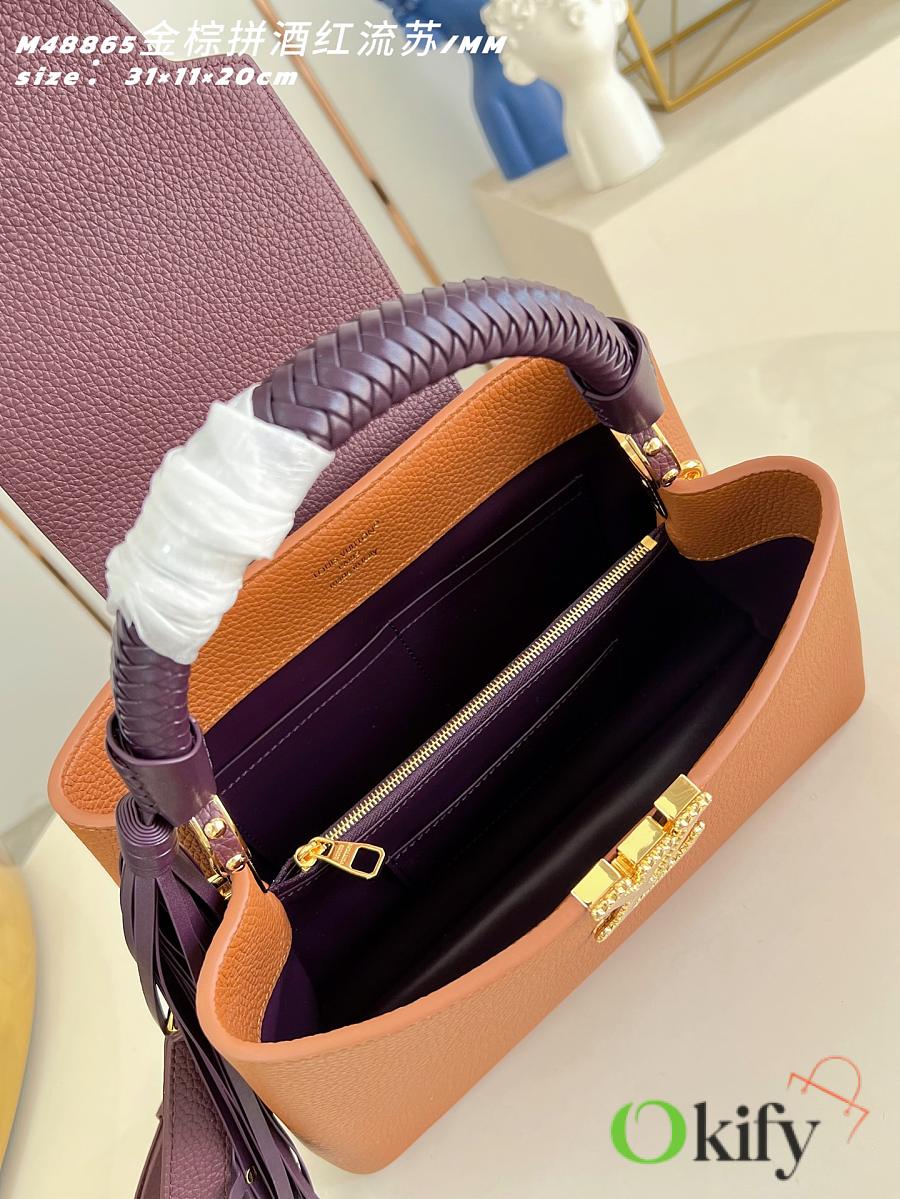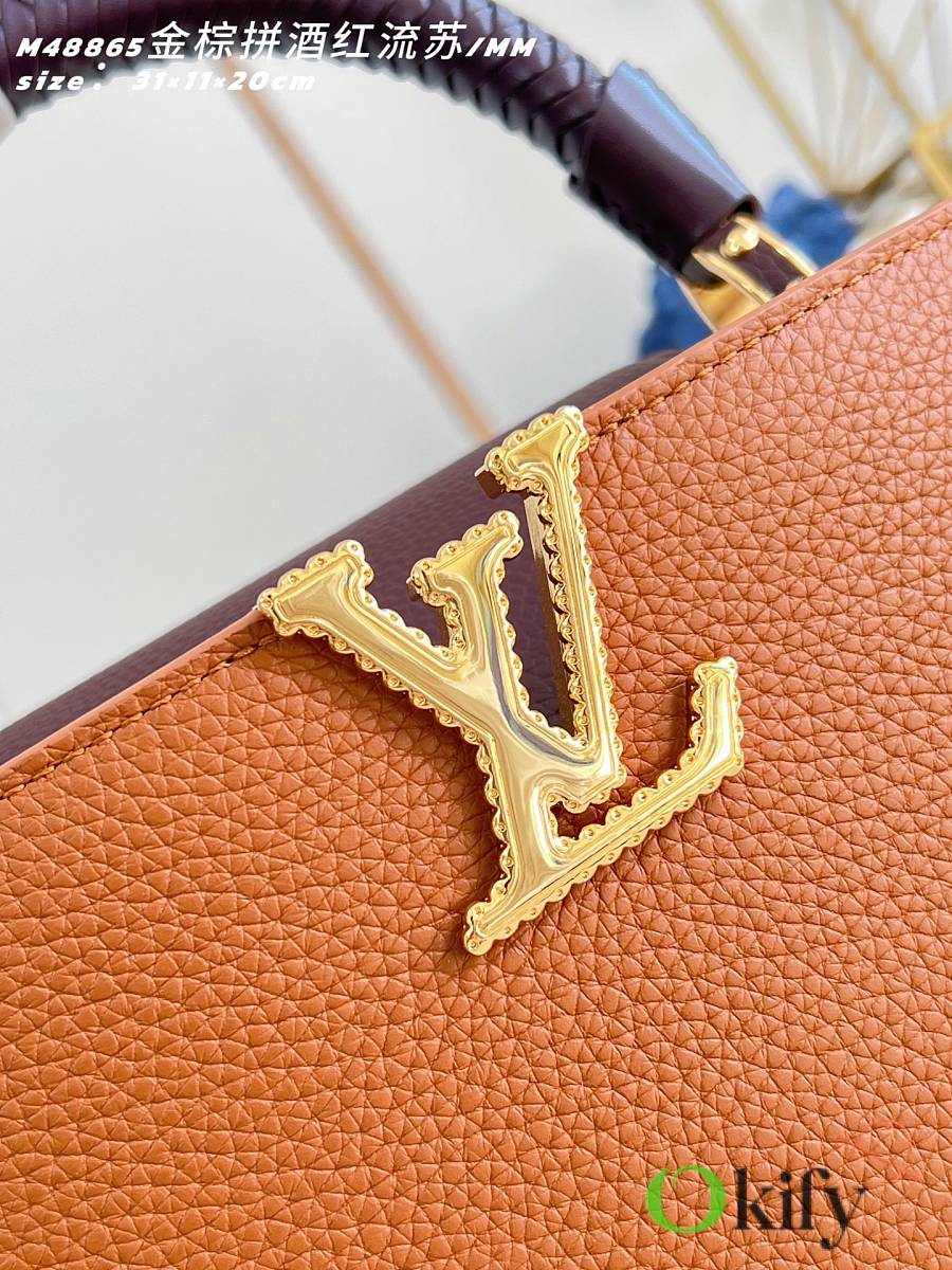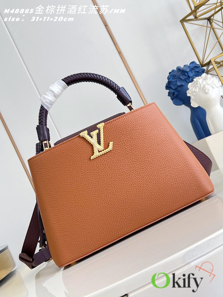The Crafty series once again imbues the Capucines MM handbag with the brilliance of craftsmanship. Taurillon calfskin leather creates a classic silhouette, while the woven handle adds a touch of sophistication. The LV lettering features an embossed effect, and a detachable tassel hangs below the padlock