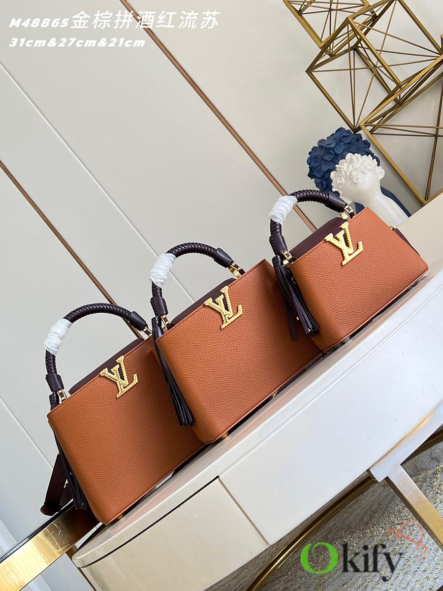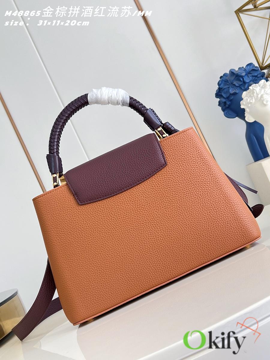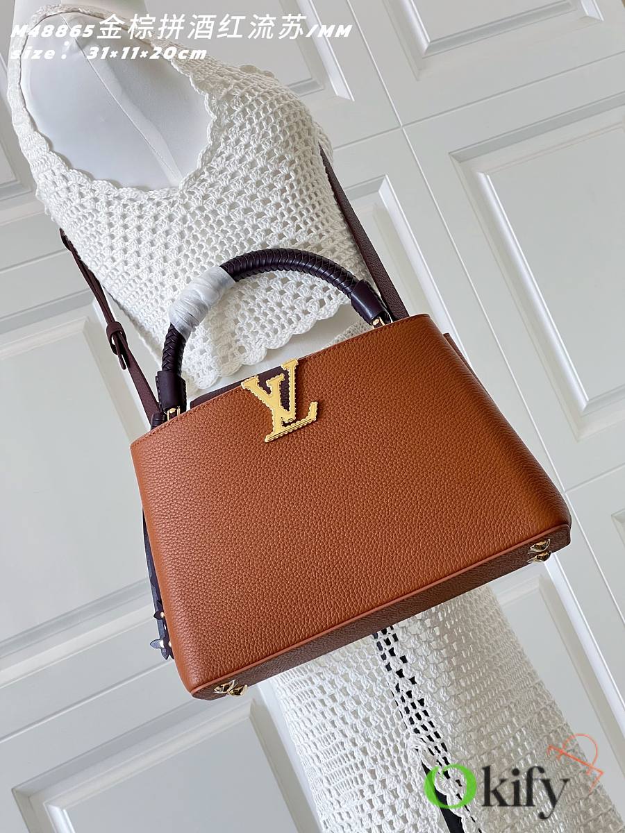 The Crafty series once again imbues the Capucines MM handbag with the brilliance of craftsmanship. Taurillon calfskin leather creates a classic silhouette, while the woven handle adds a touch of sophistication. The LV lettering features an embossed effect, and a detachable tassel hangs below the padlock