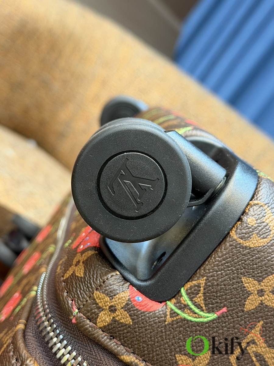 The Louis Vuitton Horizon x Takashi Murakami Cherry Monogram Four-Wheel Suitcase is an iconic piece representing the brand's fusion of classic design and artistic expression. Based on the brand's signature Monogram canvas, it is adorned with playful cherry patterns designed by Murakami, complemented by natural vegetable-tanned leather corner protectors and a pull handle, perfectly blending vintage style with a sweet and youthful charm. Equipped with 360° silent omnidirectional wheels and a multi-position aerospace-grade aluminum alloy pull handle, the suitcase offers both durability and a smooth riding experience, making it a collector's item for trendy travelers seeking individuality and artistic flair.