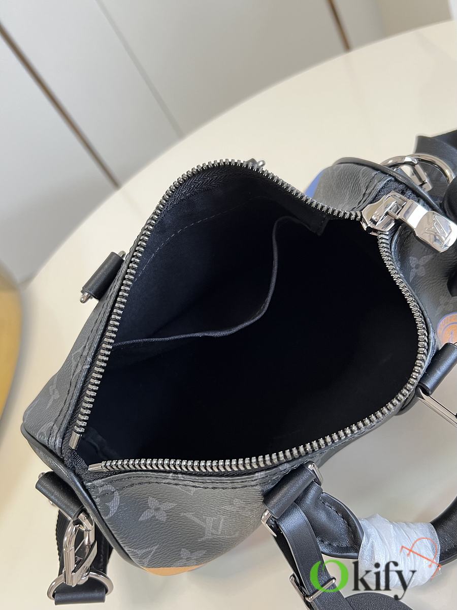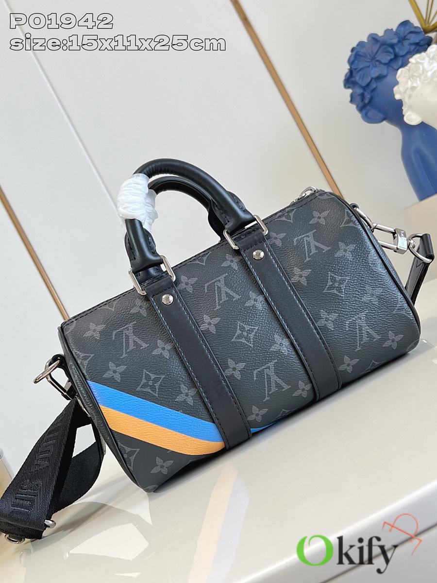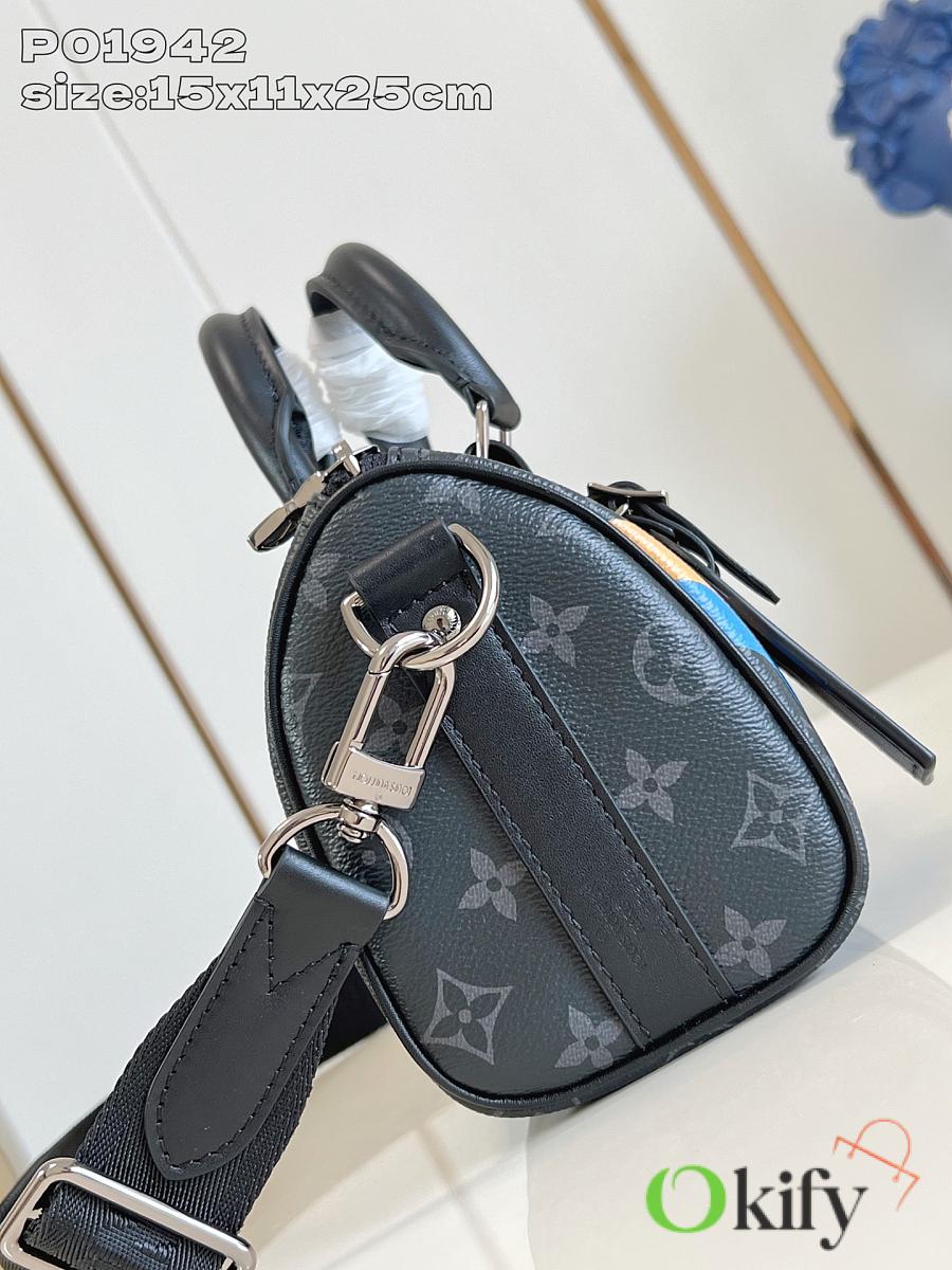 This Keepall 25 bag features a compact silhouette crafted from Monogram Eclipse canvas. Customizable with Monogram prints, stripes, signature lettering, and patches, it's a perfect way to express your style. Leather side straps and a designer branding add trendy details, while a removable and adjustable shoulder strap offers versatile carrying options. 15 x 11 x 25 cm (H x W x L)