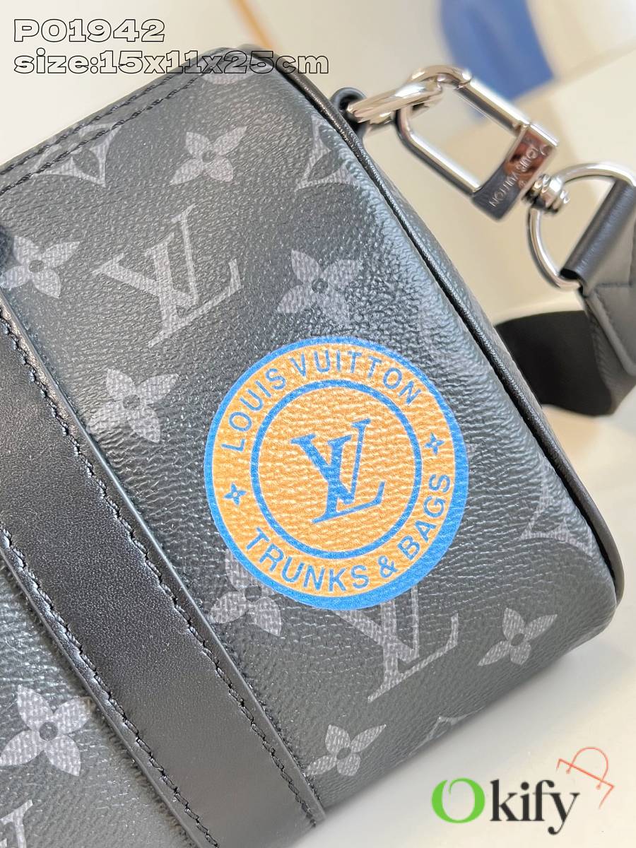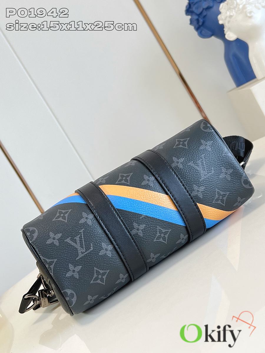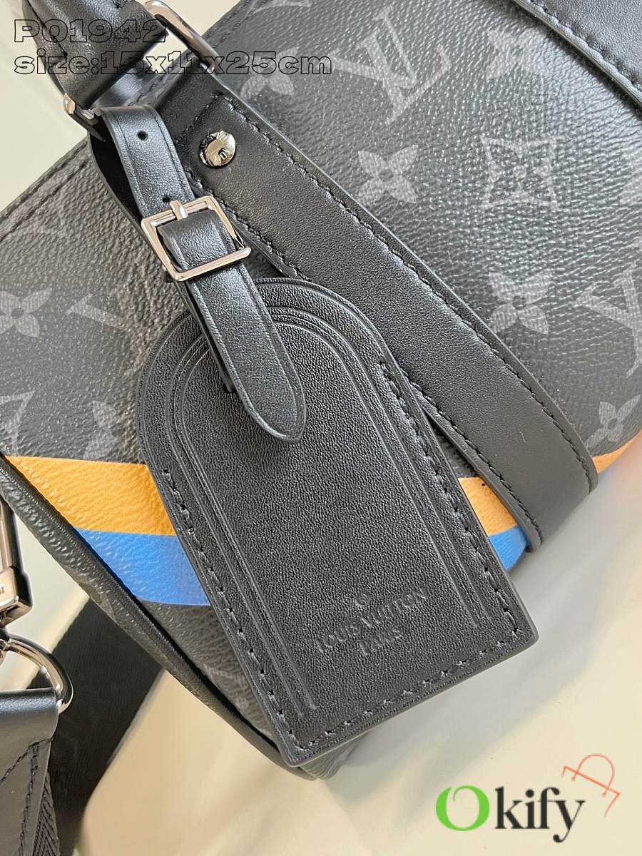 This Keepall 25 bag features a compact silhouette crafted from Monogram Eclipse canvas. Customizable with Monogram prints, stripes, signature lettering, and patches, it's a perfect way to express your style. Leather side straps and a designer branding add trendy details, while a removable and adjustable shoulder strap offers versatile carrying options. 15 x 11 x 25 cm (H x W x L)