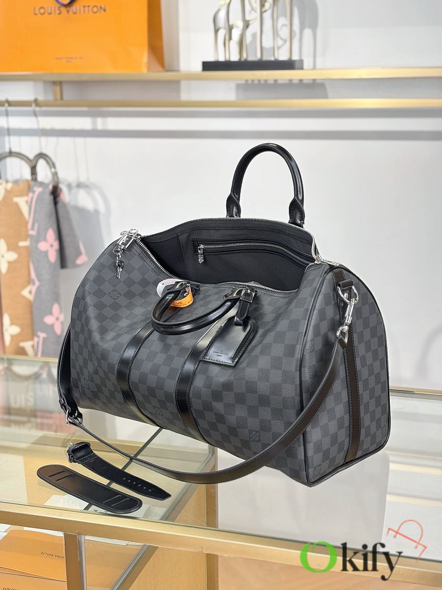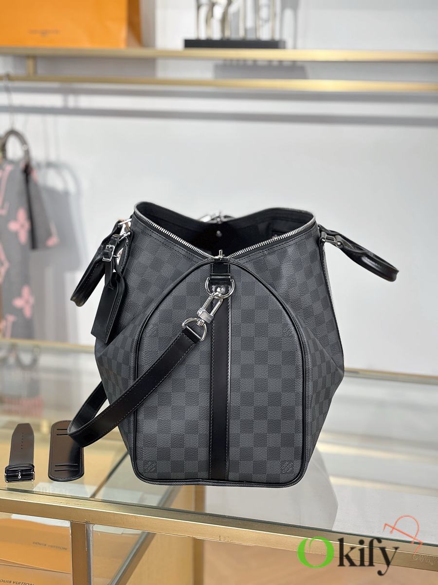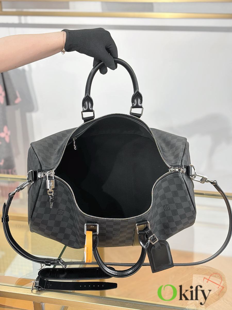This Keepall is made of Damier Azur canvas, with a round handle that is soft and designed with a leisurely yachting atmosphere, making it an ideal travel companion. Special coated canvas- natural cowhide trim- cotton textile lining- leather handles for more comfortable carrying- large capacity design- carry-on luggage size- removable leather name tag- gold metal accessories.