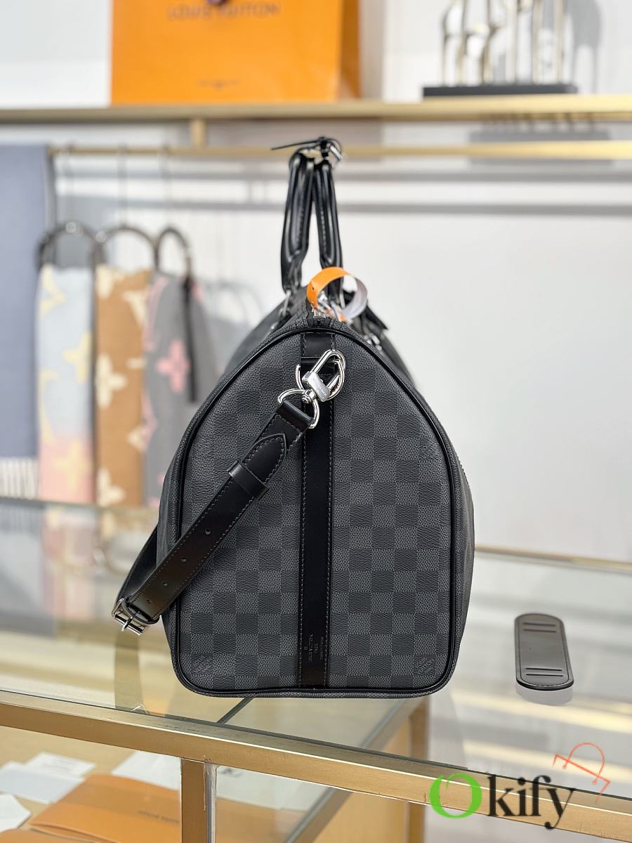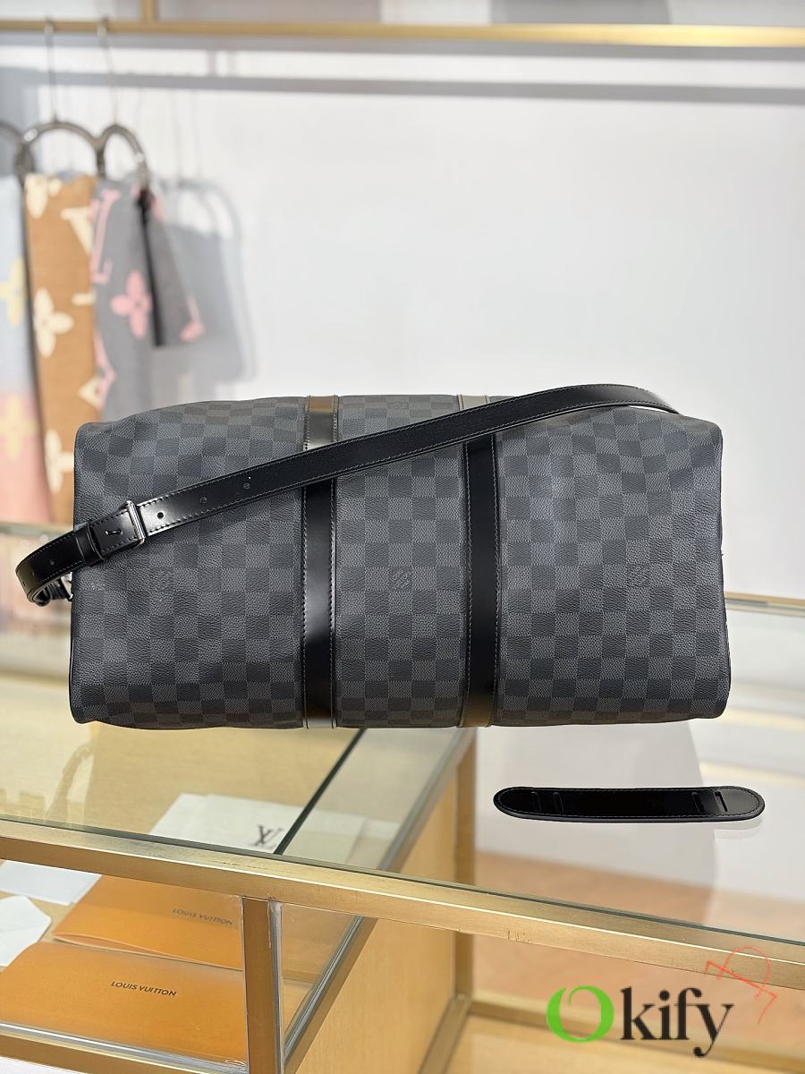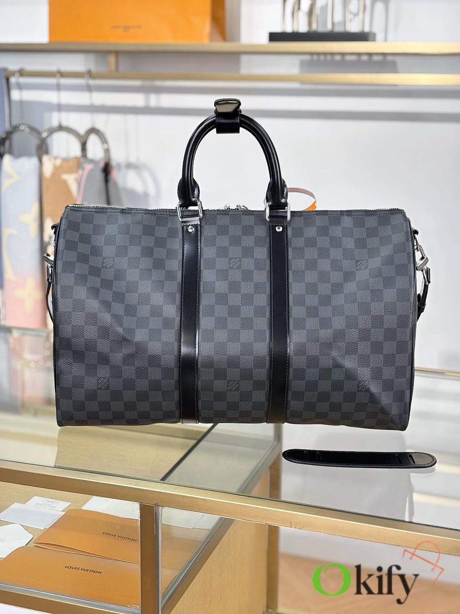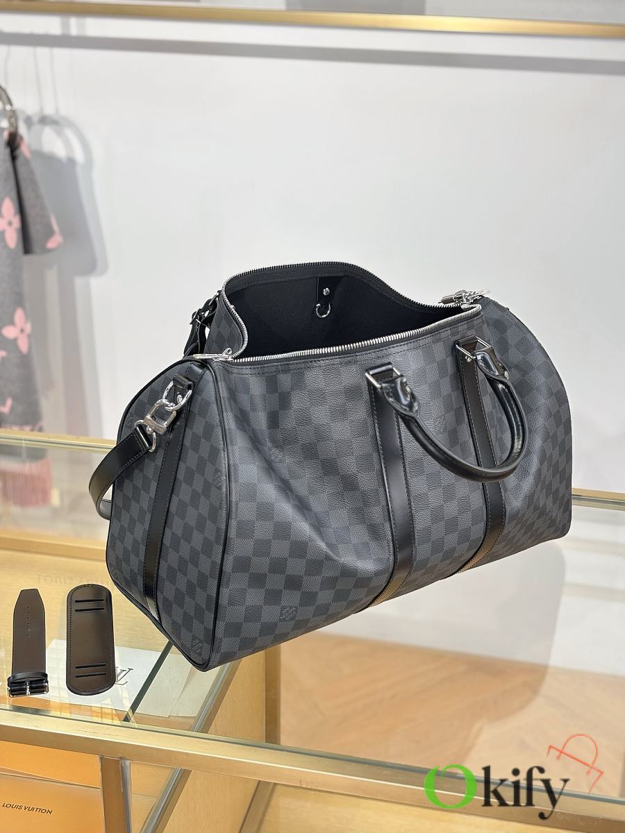 This Keepall is made of Damier Azur canvas, with a round handle that is soft and designed with a leisurely yachting atmosphere, making it an ideal travel companion. Special coated canvas- natural cowhide trim- cotton textile lining- leather handles for more comfortable carrying- large capacity design- carry-on luggage size- removable leather name tag- gold metal accessories.