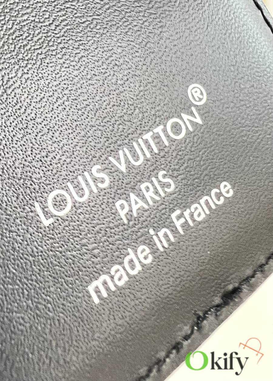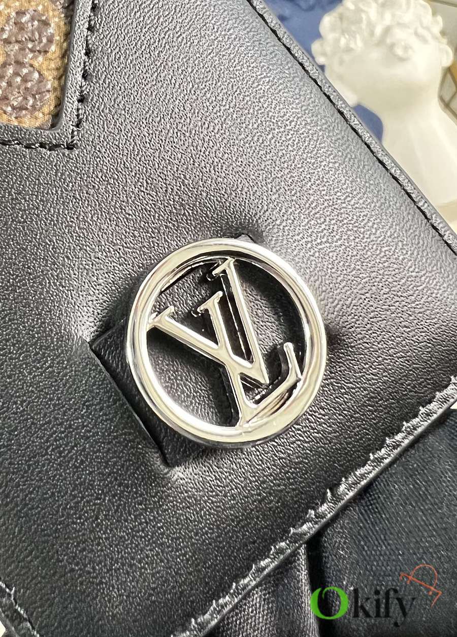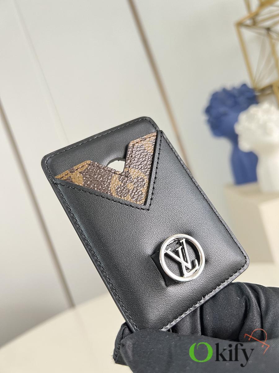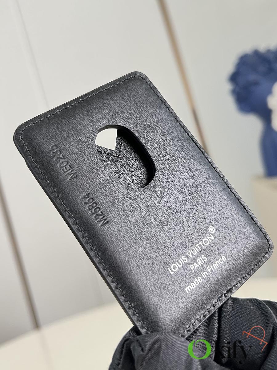 This magnetic card holder is crafted from Monogram Macassar canvas, featuring a bright leather lining and V-shaped card compartments for a striking look. It securely stores credit cards and transit cards. An integrated magnet easily attaches to iPhones equipped with MagSafe magnetic technology
